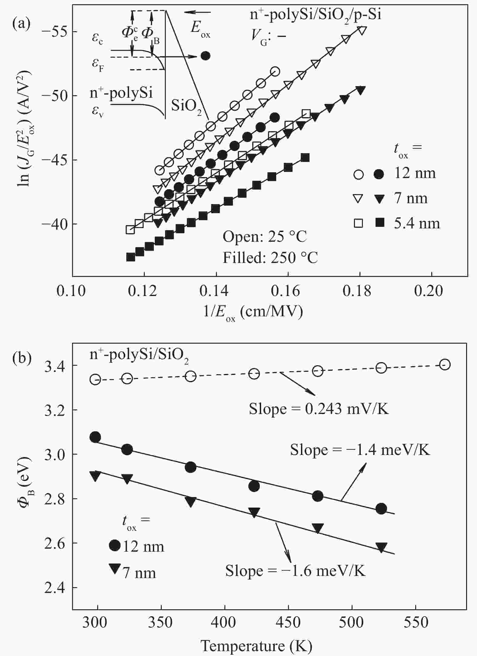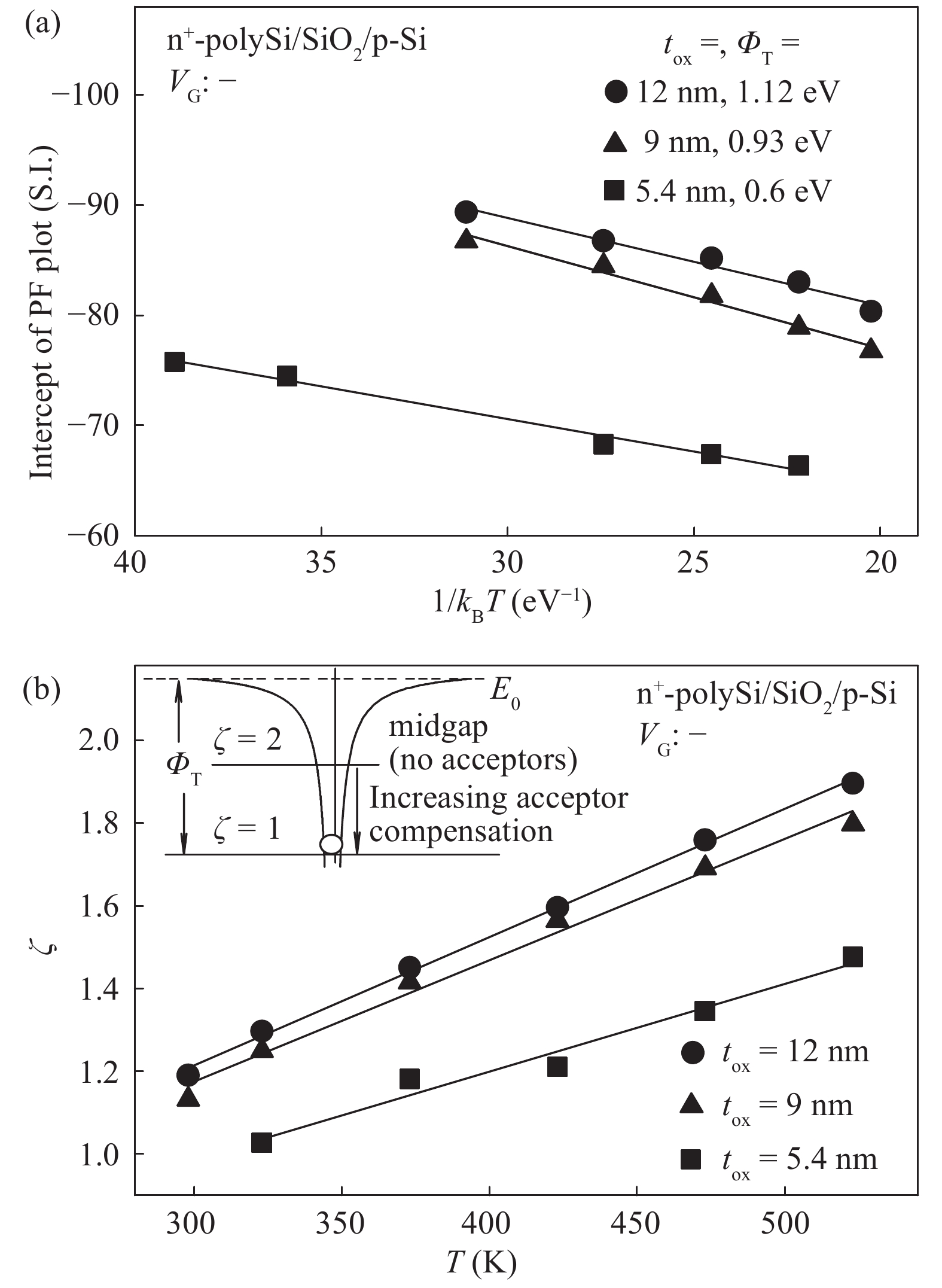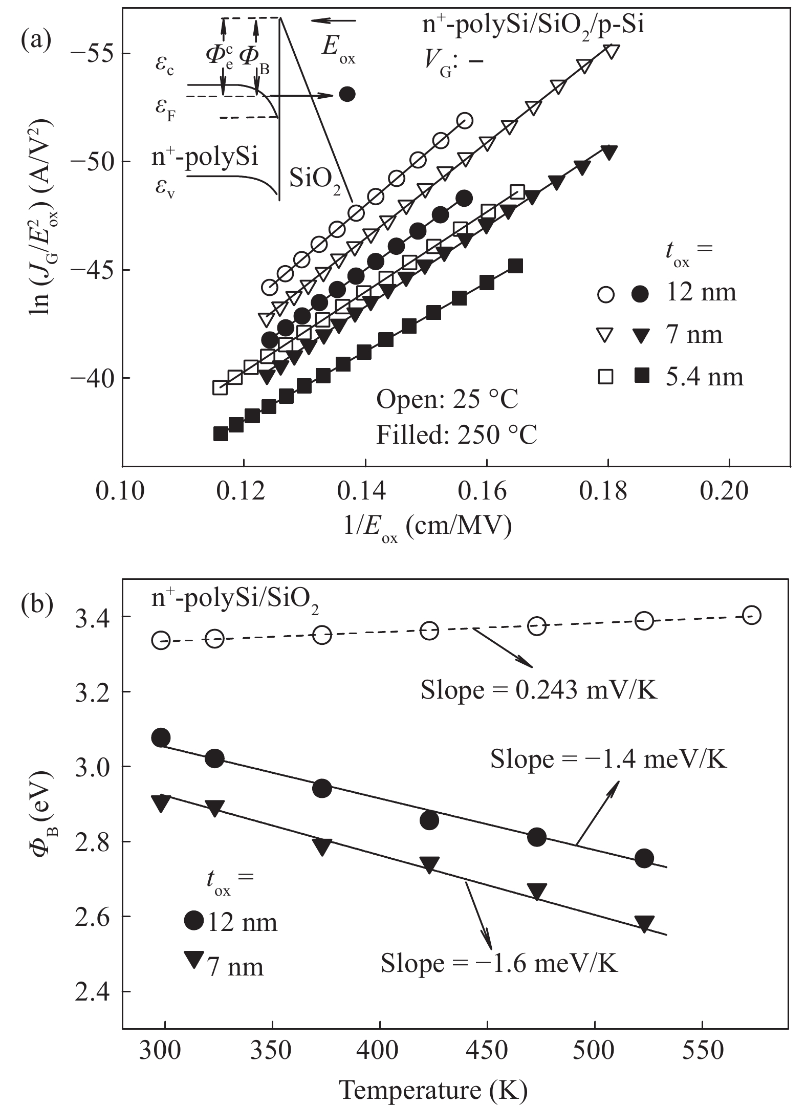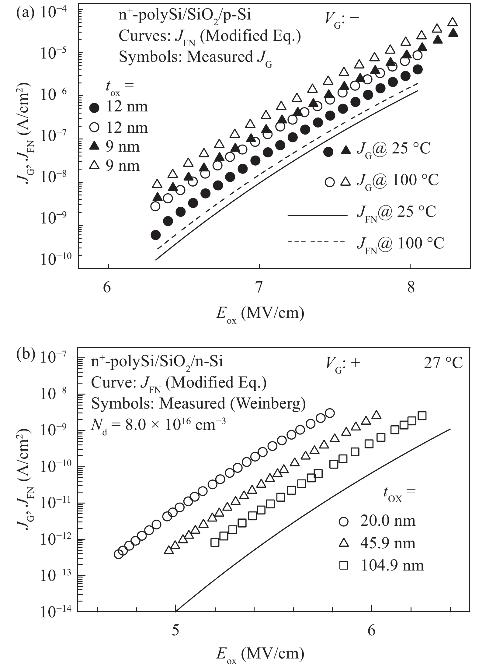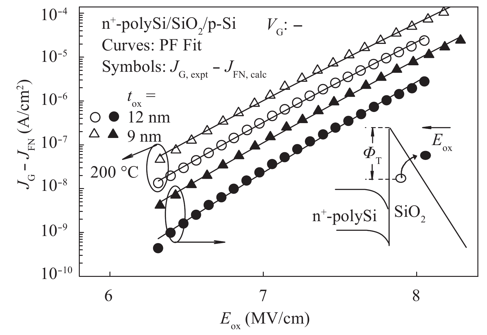 The conduction mechanism of gate leakage current through thermally grown silicon dioxide (SiO2) films on (100) p-type silicon has been investigated in detail under negative bias on the degenerately doped n-type polysilicon (n+-polySi) gate. The analysis utilizes the measured gate current density JG at high oxide fields Eox in 5.4 to 12 nm thick SiO2 films between 25 and 300 °C. The leakage current measured up to 300 °C was due to Fowler–Nordheim (FN) tunneling of electrons from the accumulated n +-polySi gate in conjunction with Poole Frenkel (PF) emission of trapped-electrons from the electron traps located at energy levels ranging from 0.6 to 1.12 eV (depending on the oxide thickness) below the SiO2 conduction band (CB). It was observed that PF emission current IPF dominates FN electron tunneling current IFN at oxide electric fields Eox between 6 and 10 MV/cm and throughout the temperature range studied here. Understanding of the mechanism of leakage current conduction through SiO2 films plays a crucial role in simulation of time-dependent dielectric breakdown (TDDB) of metaloxide–semiconductor (MOS) devices and to precisely predict the normal operating field or applied gate voltage for lifetime projection of the MOS integrated circuits.