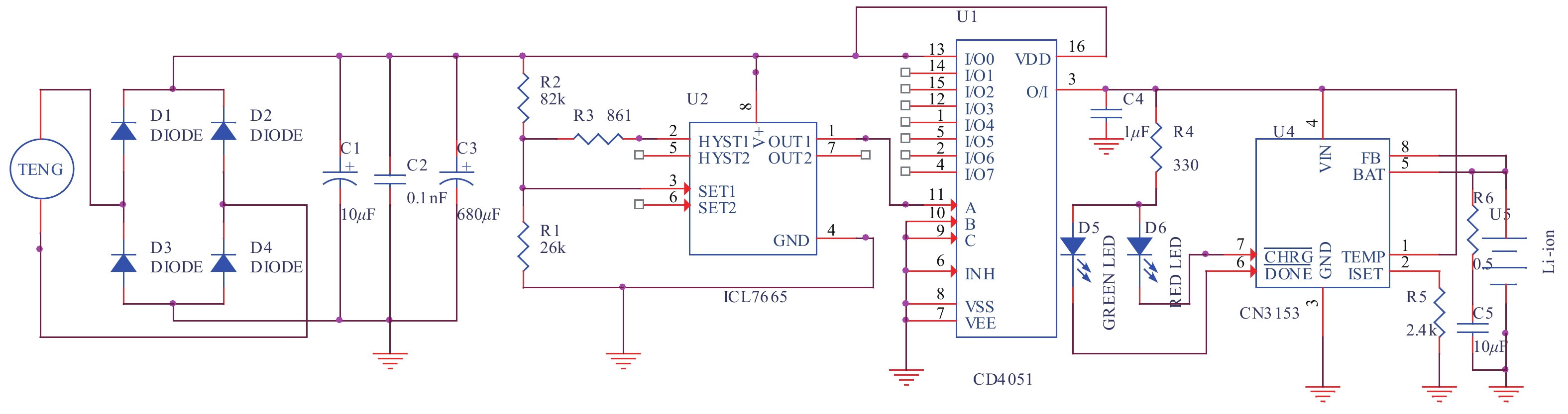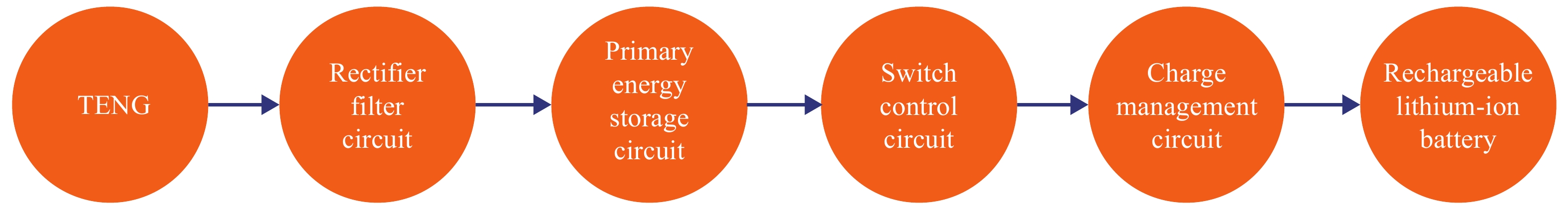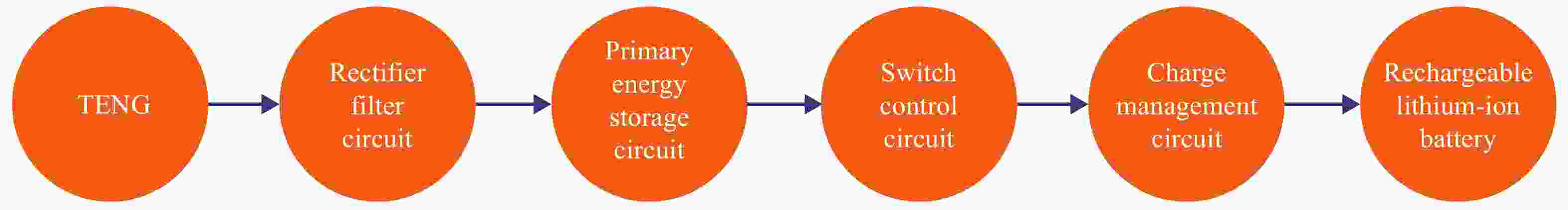 For most triboelectric nanogenerators (TENGs), the electric output should be a short AC pulse, which has the common characteristic of high voltage but low current. Thus it is necessary to convert the AC to DC and store the electric energy before driving conventional electronics. The traditional AC voltage regulator circuit which commonly consists of transformer, rectifier bridge, filter capacitor, and voltage regulator diode is not suitable for the TENG because the transformer’s consumption of power is appreciable if the TENG output is small. This article describes an innovative design of an interface circuit for a triboelectric nanogenerator that is transformerless and easily integrated. The circuit consists of large-capacity electrolytic capacitors that can realize to intermittently charge lithium-ion batteries and the control section contains the charging chip, the rectifying circuit, a comparator chip and switch chip. More important, the whole interface circuit is completely self-powered and self-controlled. Meanwhile, the chip is widely used in the circuit, so it is convenient to integrate into PCB. In short, this work presents a novel interface circuit for TENGs and makes progress to the practical application and industrialization of nanogenerators.
