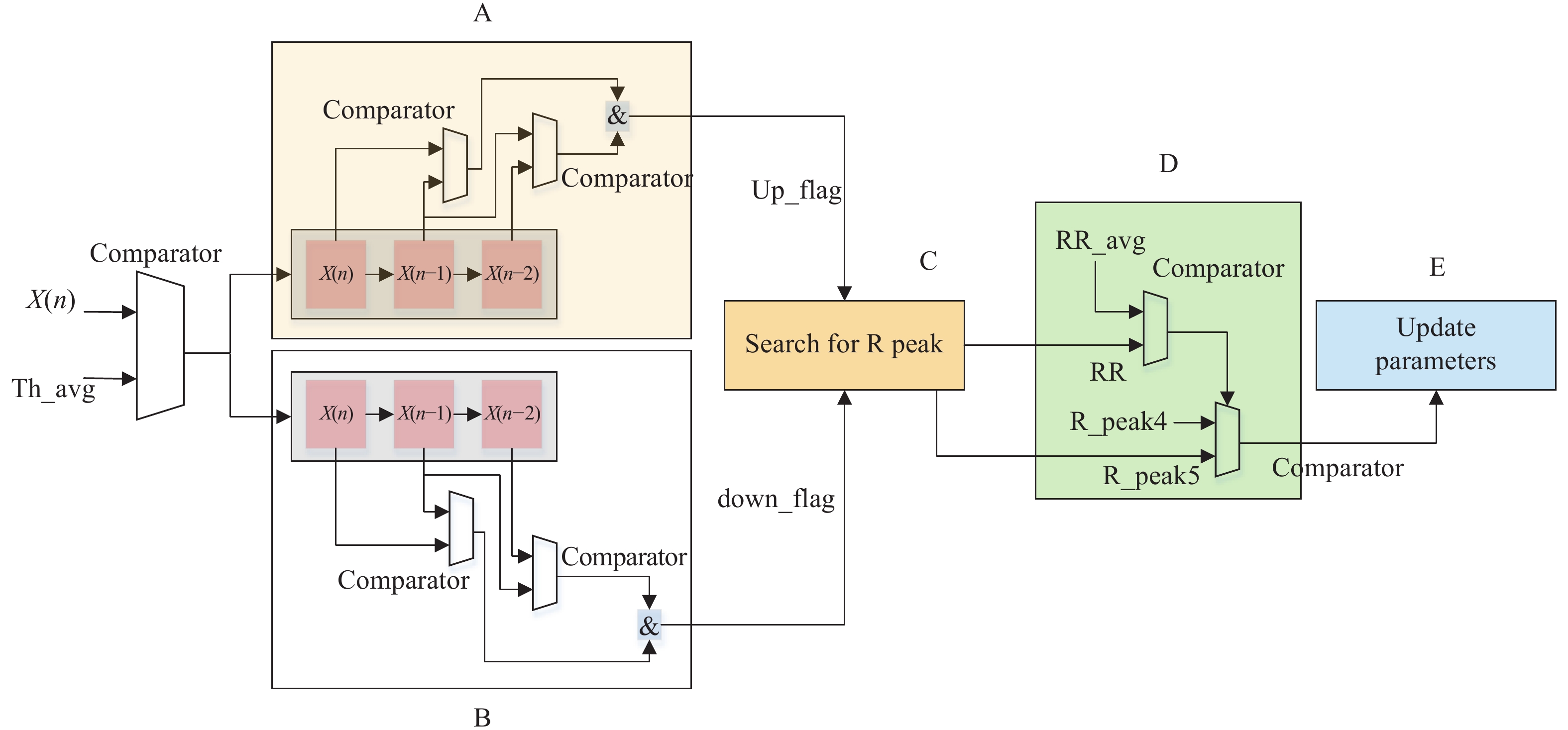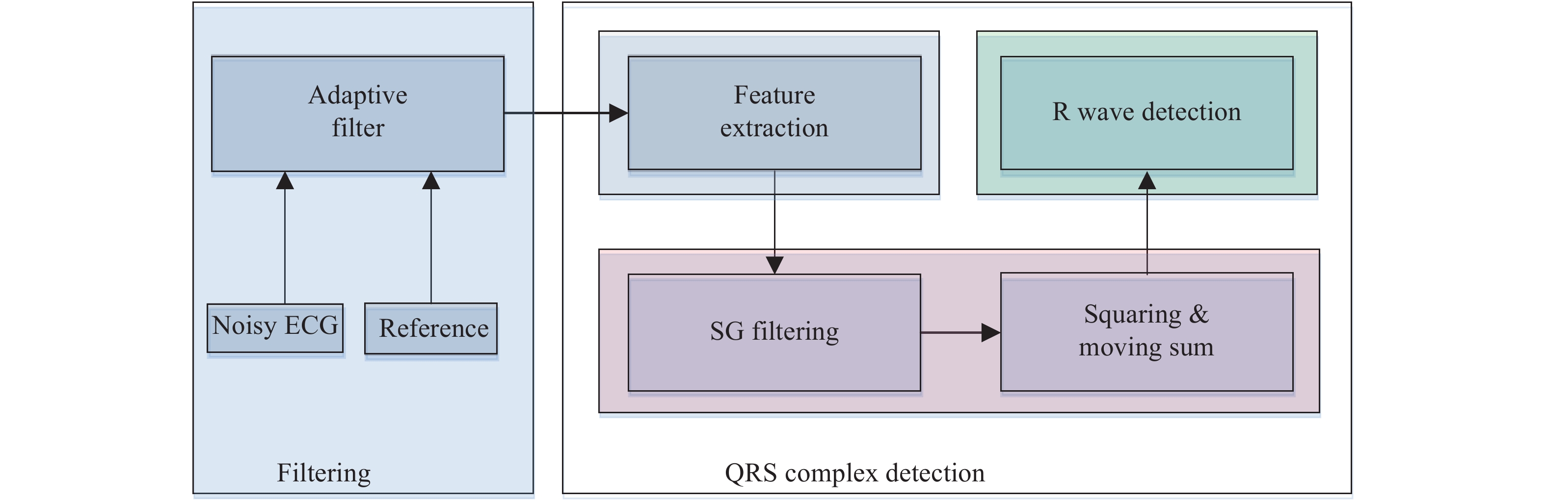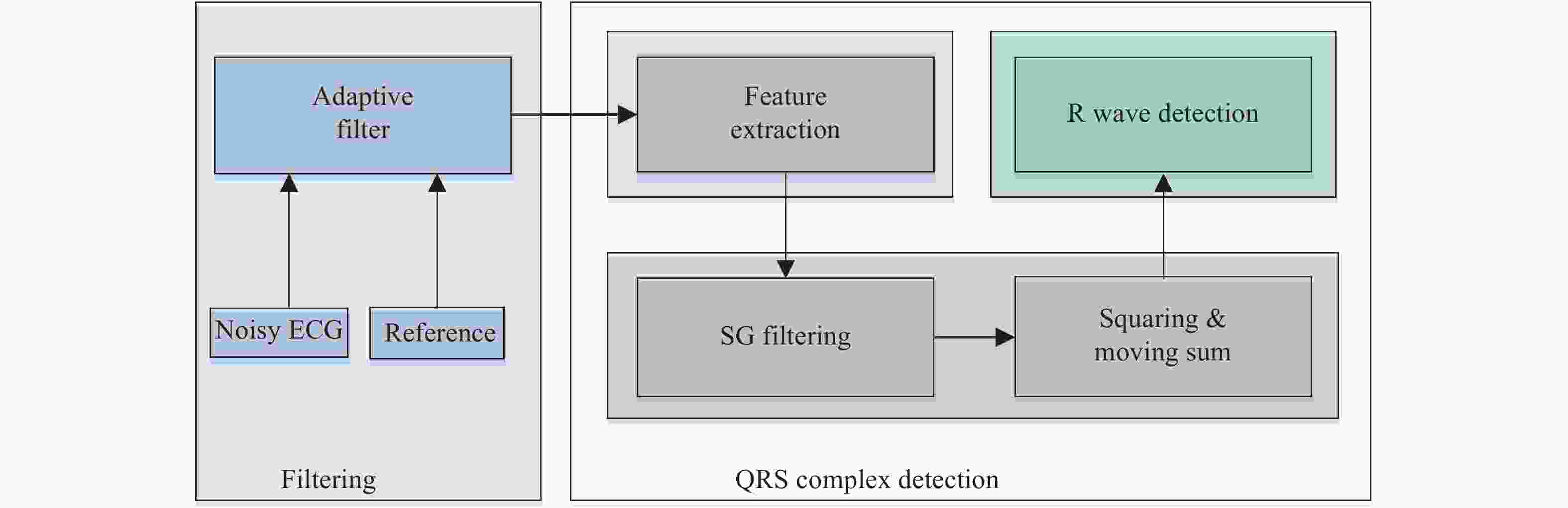 Electrocardiogram (ECG) can be used as a valid way for diagnosing heart disease. To fulfill ECG processing in wearable devices by reducing computation complexity and hardware cost, two kinds of adaptive filters are designed to perform QRS complex detection and motion artifacts removal, respectively. The proposed design achieves a sensitivity of 99.49% and a positive predictivity of 99.72%, tested under the MIT-BIH ECG database. The proposed design is synthesized under the SMIC 65-nm CMOS technology and verified by post-synthesis simulation. Experimental results show that the power consumption and area cost of this design are of 160 μW and 1.09 × 10 5 μm2, respectively.