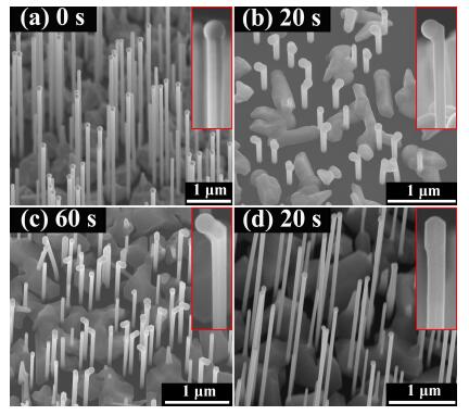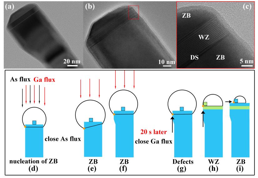 Self-catalyzed GaAs nanowires (NWs) are grown on Si (111) substrates by molecular-beam epitaxy. The effect of different closing sequences of the Ga and As cell shutters on the morphology and structural phase of GaAs NWs is investigated. For the sequences of closing the Ga and As cell shutters simultaneously or closing the As cell shutter 1 min after closing the Ga cell shutter, the NWs grow vertically to the substrate surface. In contrast, when the As cell shutter is closed first, maintaining the Ga flux is found to be critical for the following growth of GaAs NWs, which can change the growth direction from[111] to 〈111〉. The evolution of the morphology and structural phase transition at the tips of these GaAs NWs confirm that the triple-phase-line shift mode is at work even for the growth with different cell shutter closing sequences. Our work will provide new insights for better understanding of the growth mechanism and realizing of the morphology and structure control of the GaAs NWs.