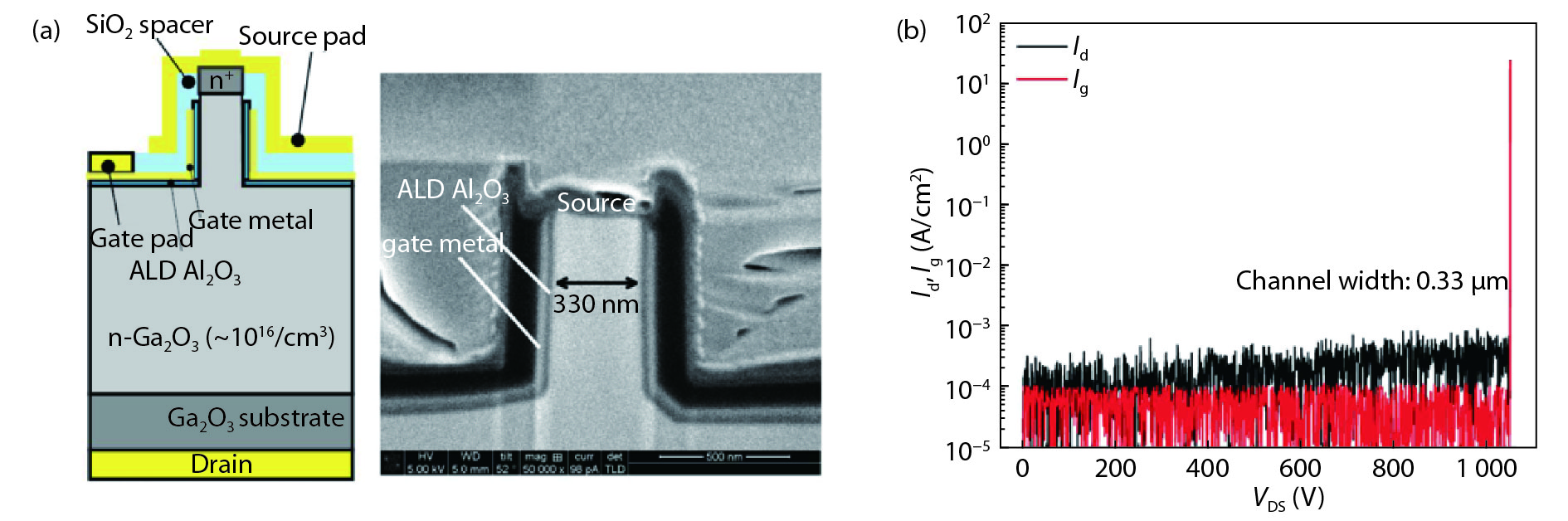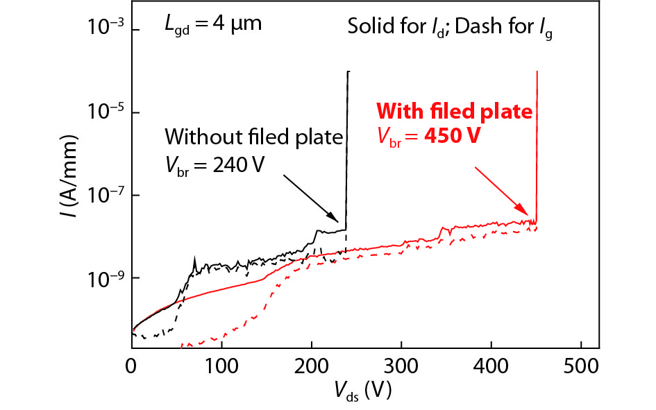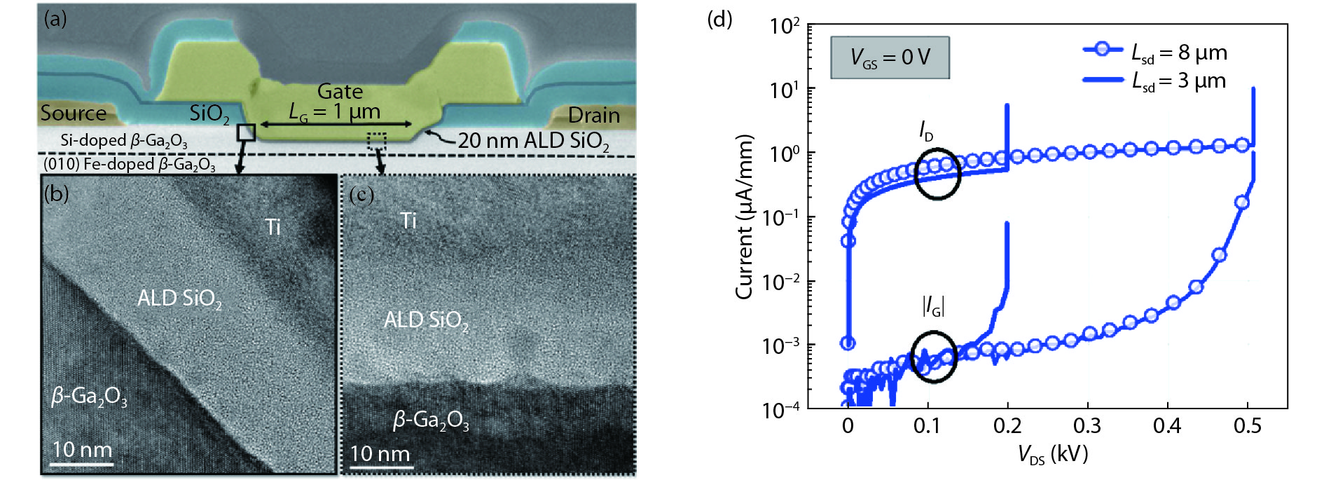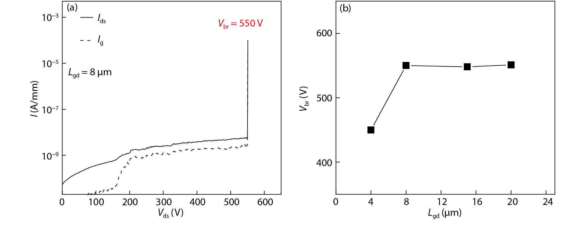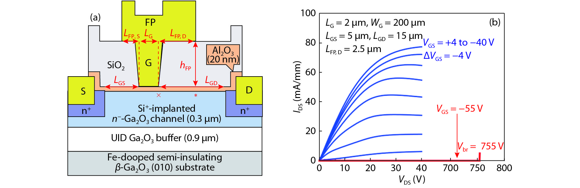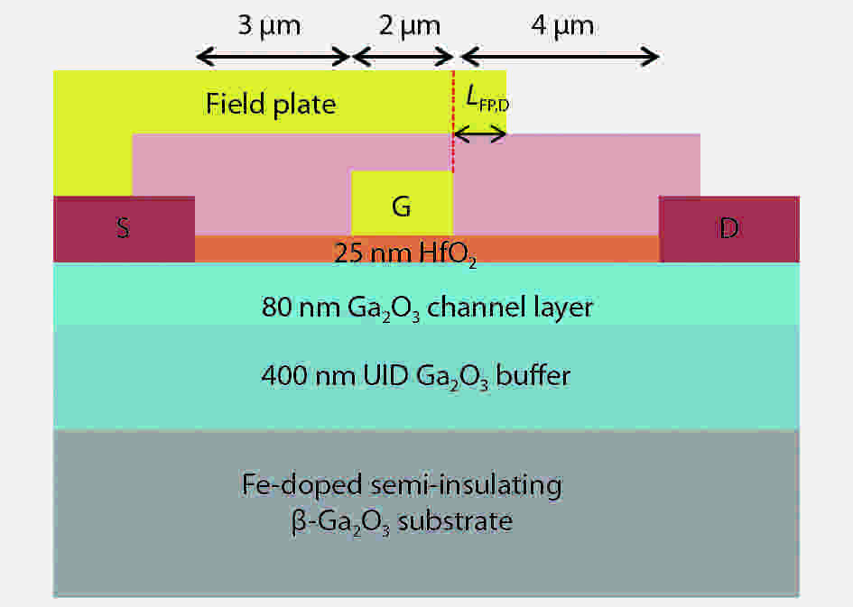 Ga2O3 metal–oxide–semiconductor field-effect transistors (MOSFETs) with high-breakdown characteristics were fabricated on a homoepitaxial n-typed β-Ga2O3 film, which was grown by metal organic chemical vapor deposition (MOCVD) on an Fe-doped semi-insulating (010) Ga2O3 substrate. The structure consisted of a 400 nm unintentionally doped (UID) Ga2O3 buffer layer and an 80 nm Si-doped channel layer. A high k HfO2 gate dielectric film formed by atomic layer deposition was employed to reduce the gate leakage. Moreover, a source-connected field plate was introduced to enhance the breakdown characteristics. The drain saturation current density of the fabricated device reached 101 mA/mm at Vgs of 3 V. The off-state current was as low as 7.1 × 10?11 A/mm, and the drain current ION/IOFF ratio reached 109. The transistors exhibited three-terminal off-state breakdown voltages of 450 and 550 V, corresponding to gate-to-drain spacing of 4 and 8 μm, respectively.