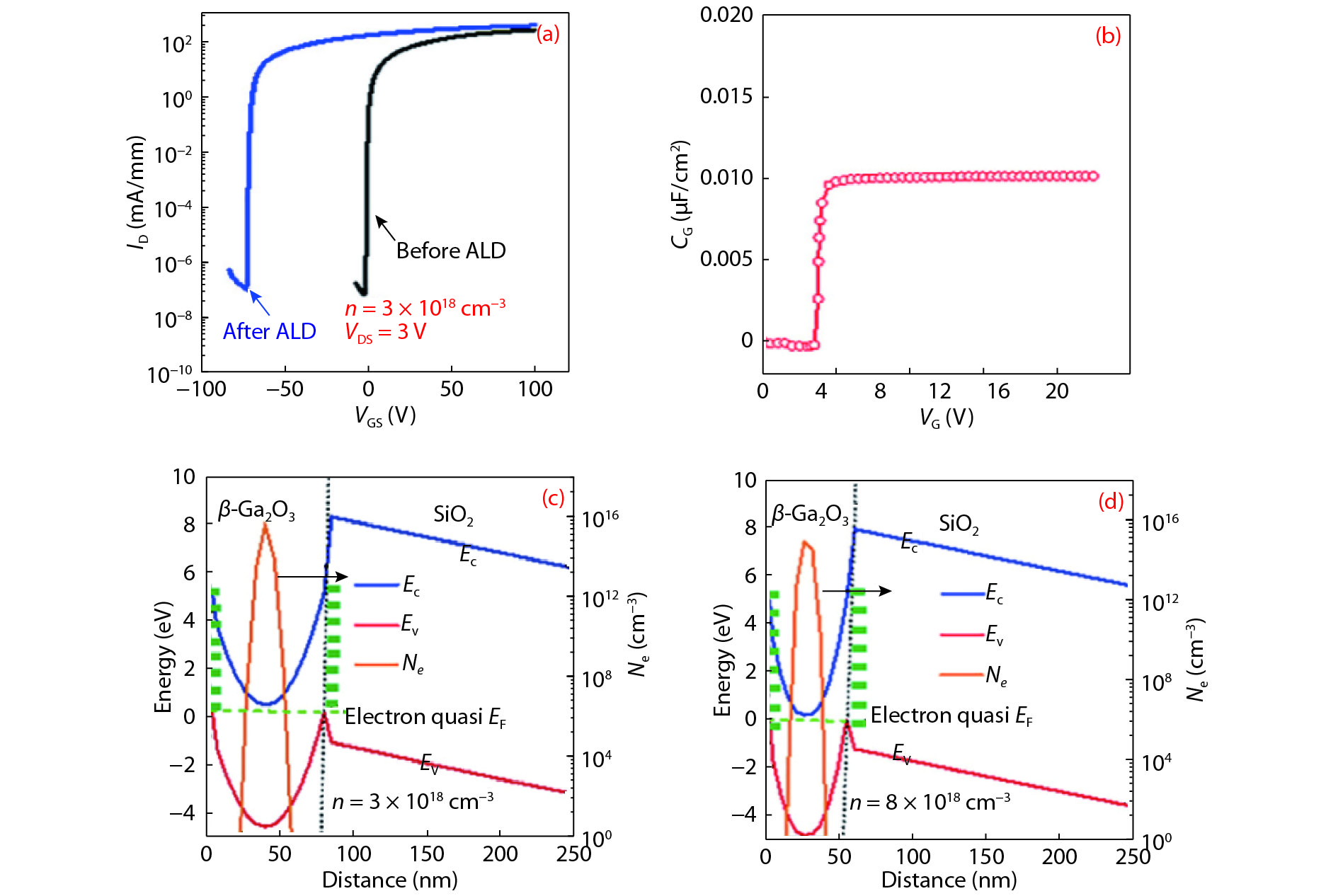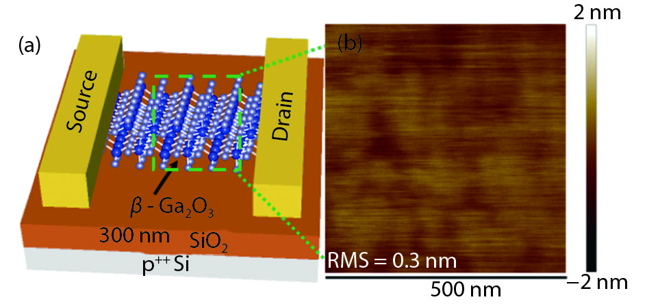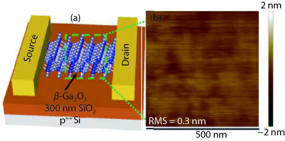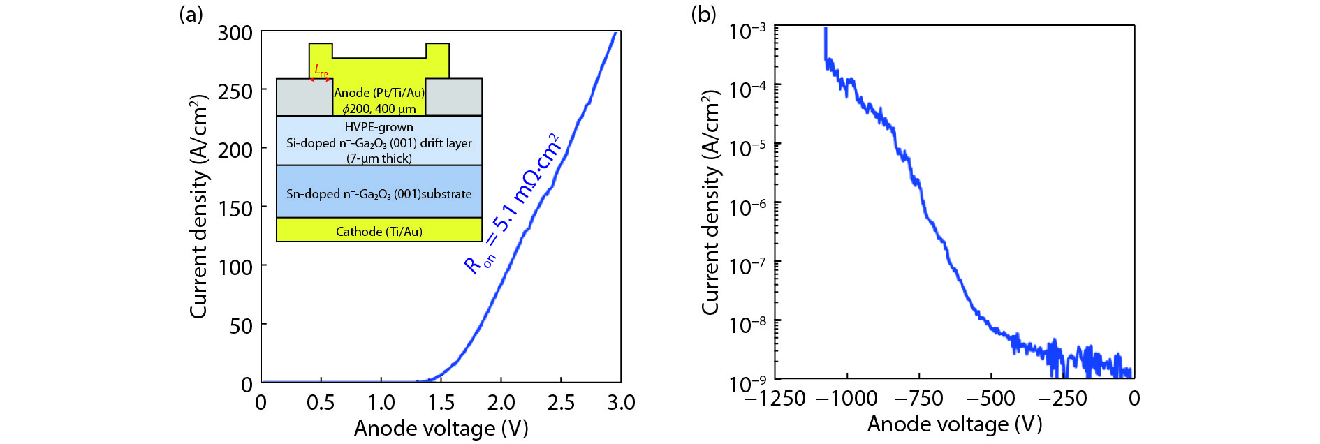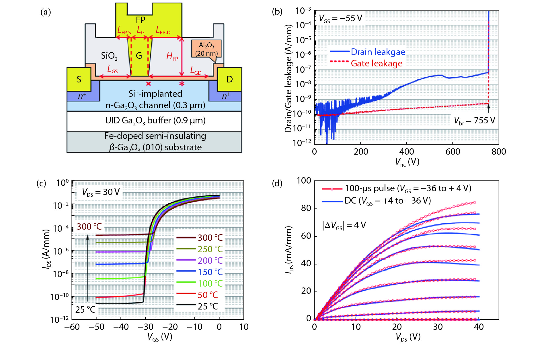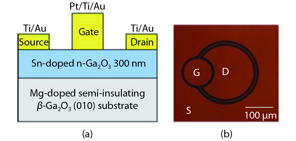 Ga2O3 metal–oxide–semiconductor field-effect transistors (MOSFETs) with high-breakdown characteristics were fabricated on a homoepitaxial n-typed β-Ga2O3 film, which was grown by metal organic chemical vapor deposition (MOCVD) on an Fe-doped semi-insulating (010) Ga2O3 substrate. The structure consisted of a 400 nm unintentionally doped (UID) Ga2O3 buffer layer and an 80 nm Si-doped channel layer. A high k HfO2 gate dielectric film formed by atomic layer deposition was employed to reduce the gate leakage. Moreover, a source-connected field plate was introduced to enhance the breakdown characteristics. The drain saturation current density of the fabricated device reached 101 mA/mm at Vgs of 3 V. The off-state current was as low as 7.1 × 10?11 A/mm, and the drain current ION/IOFF ratio reached 109. The transistors exhibited three-terminal off-state breakdown voltages of 450 and 550 V, corresponding to gate-to-drain spacing of 4 and 8 μm, respectively.
