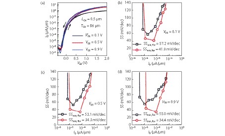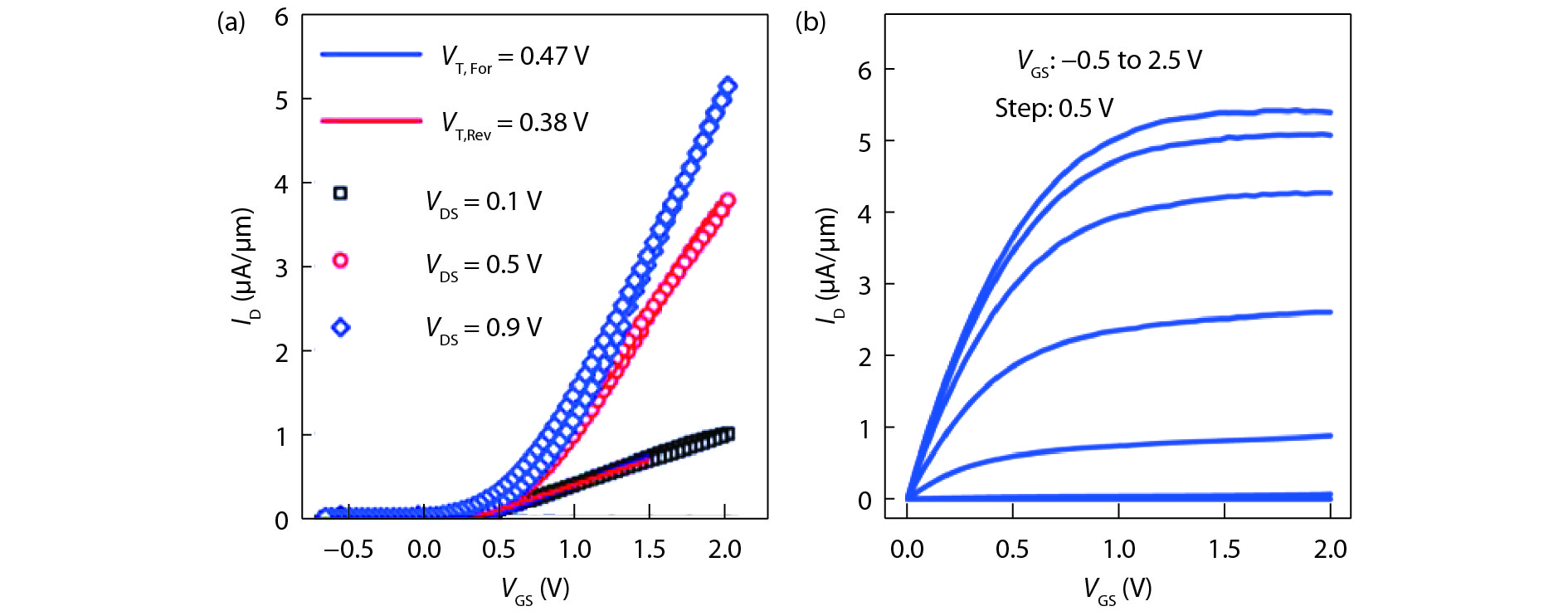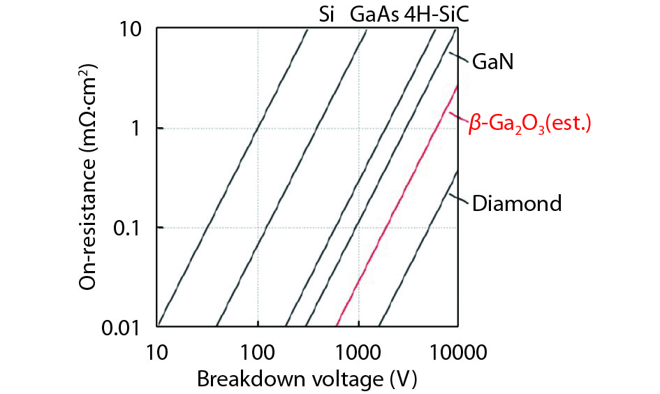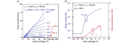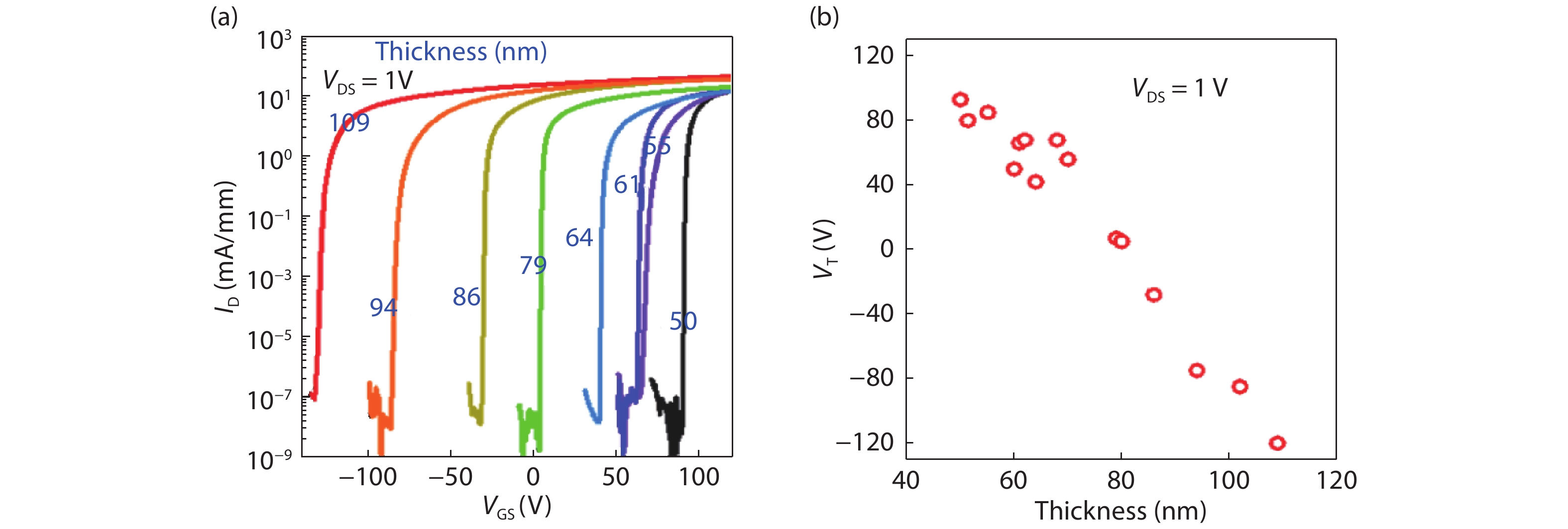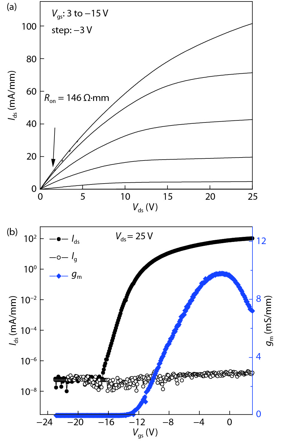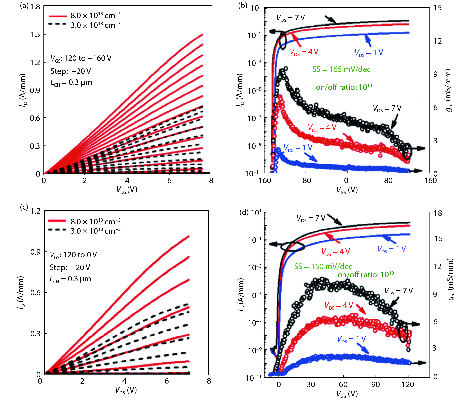 Ga2O3 metal–oxide–semiconductor field-effect transistors (MOSFETs) with high-breakdown characteristics were fabricated on a homoepitaxial n-typed β-Ga2O3 film, which was grown by metal organic chemical vapor deposition (MOCVD) on an Fe-doped semi-insulating (010) Ga2O3 substrate. The structure consisted of a 400 nm unintentionally doped (UID) Ga2O3 buffer layer and an 80 nm Si-doped channel layer. A high k HfO2 gate dielectric film formed by atomic layer deposition was employed to reduce the gate leakage. Moreover, a source-connected field plate was introduced to enhance the breakdown characteristics. The drain saturation current density of the fabricated device reached 101 mA/mm at Vgs of 3 V. The off-state current was as low as 7.1 × 10?11 A/mm, and the drain current ION/IOFF ratio reached 109. The transistors exhibited three-terminal off-state breakdown voltages of 450 and 550 V, corresponding to gate-to-drain spacing of 4 and 8 μm, respectively.