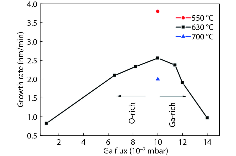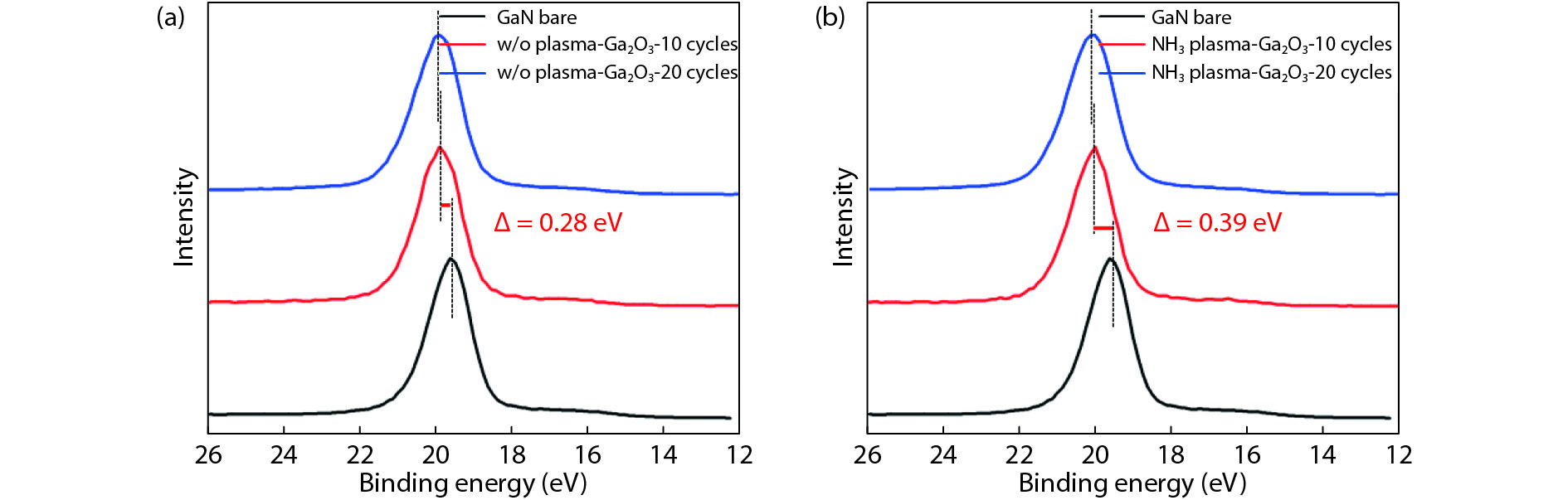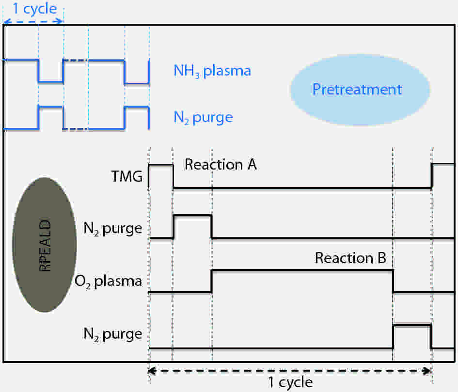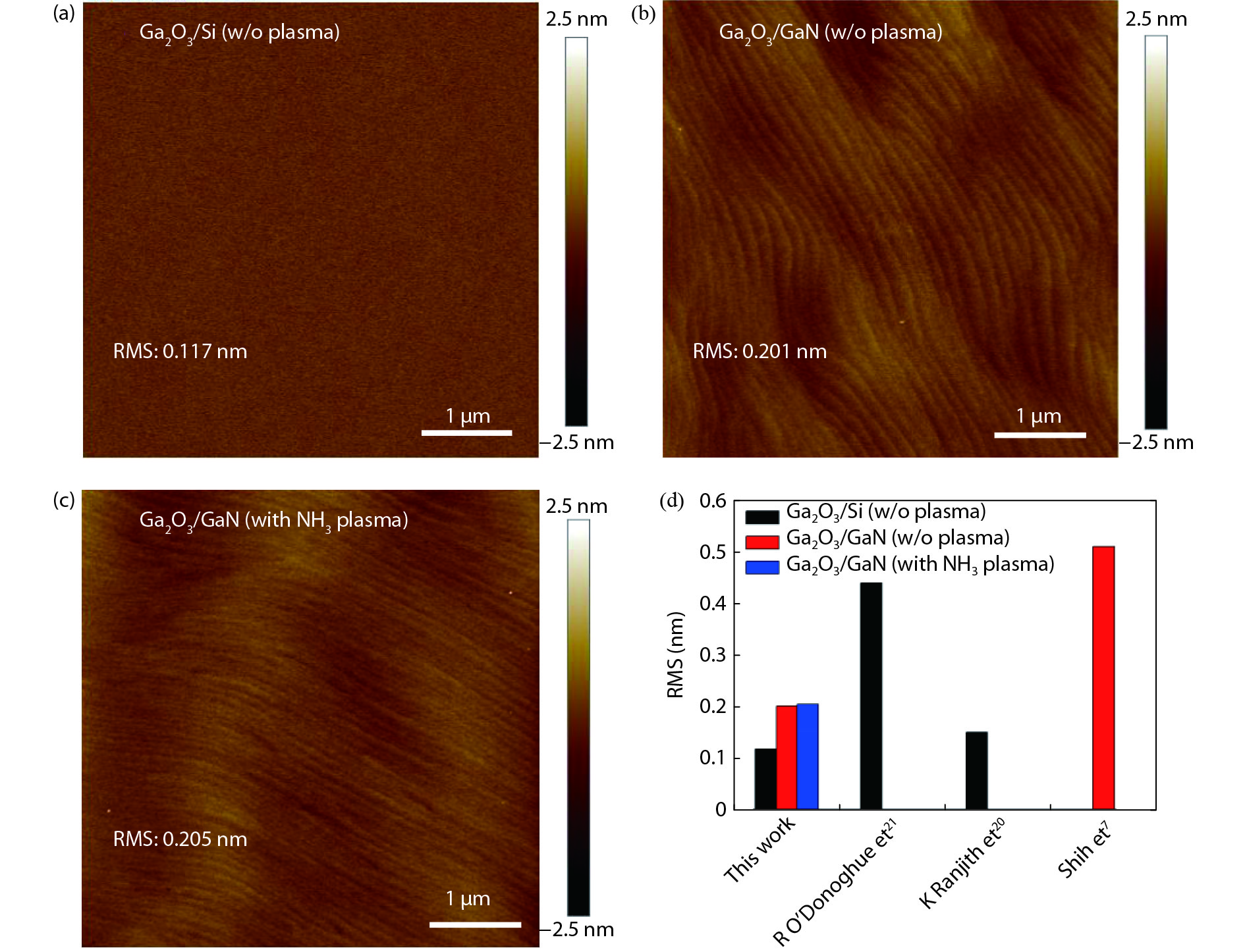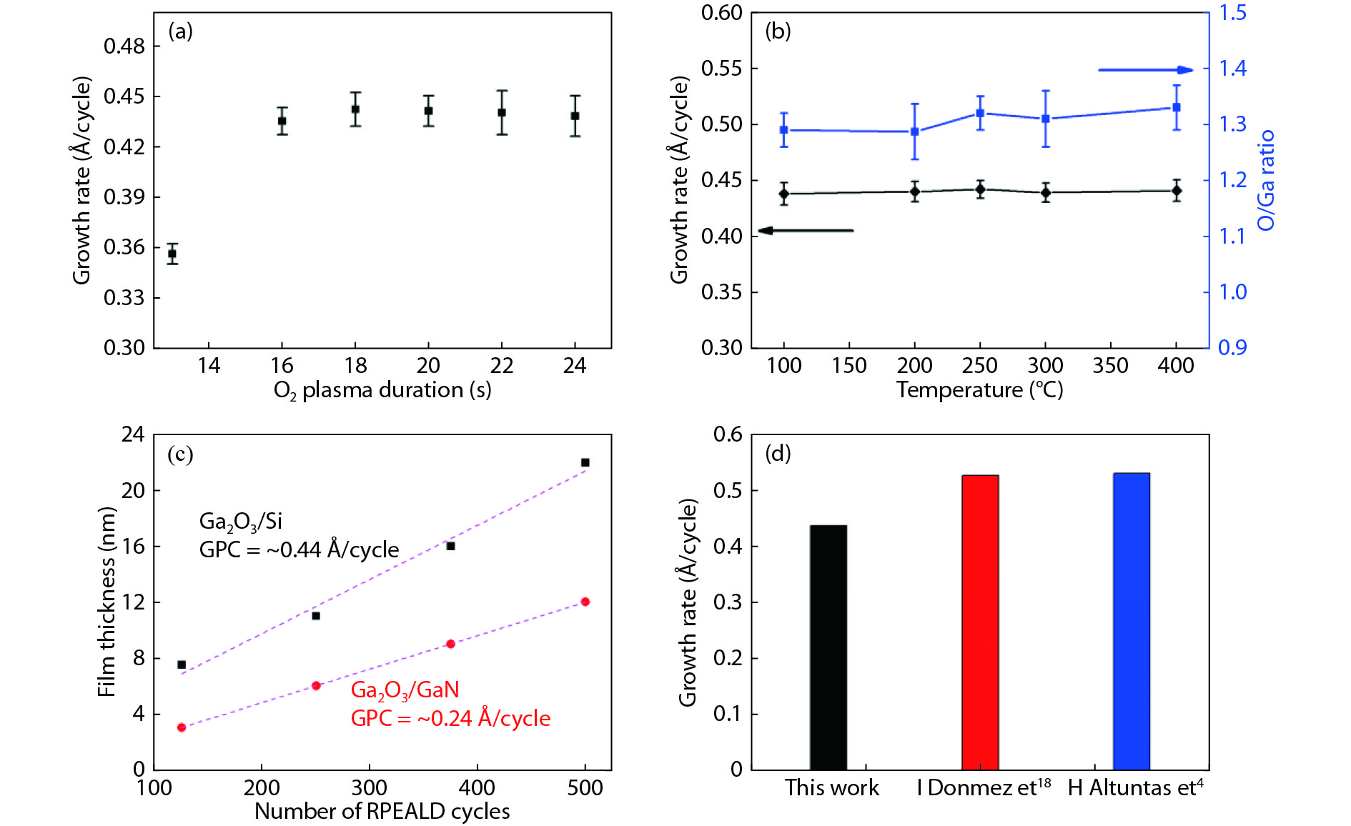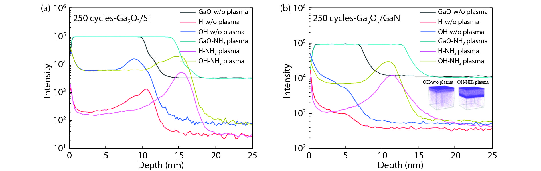 High quality gallium oxide (Ga2O3) thin films are deposited by remote plasma-enhanced atomic layer deposition (RPEALD) with trimethylgallium (TMG) and oxygen plasma as precursors. By introducing in-situ NH3 plasma pretreatment on the substrates, the deposition rate of Ga2O3 films on Si and GaN are remarkably enhanced, reached to 0.53 and 0.46 ?/cycle at 250 °C, respectively. The increasing of deposition rate is attributed to more hydroxyls (–OH) generated on the substrate surfaces after NH3 pretreatment, which has no effect on the stoichiometry and surface morphology of the oxide films, but only modifies the surface states of substrates by enhancing reactive site density. Ga2O3 film deposited on GaN wafer is crystallized at 250 °C, with an epitaxial interface between Ga2O3 and GaN clearly observed. This is potentially very important for reducing the interface state density through high quality passivation.