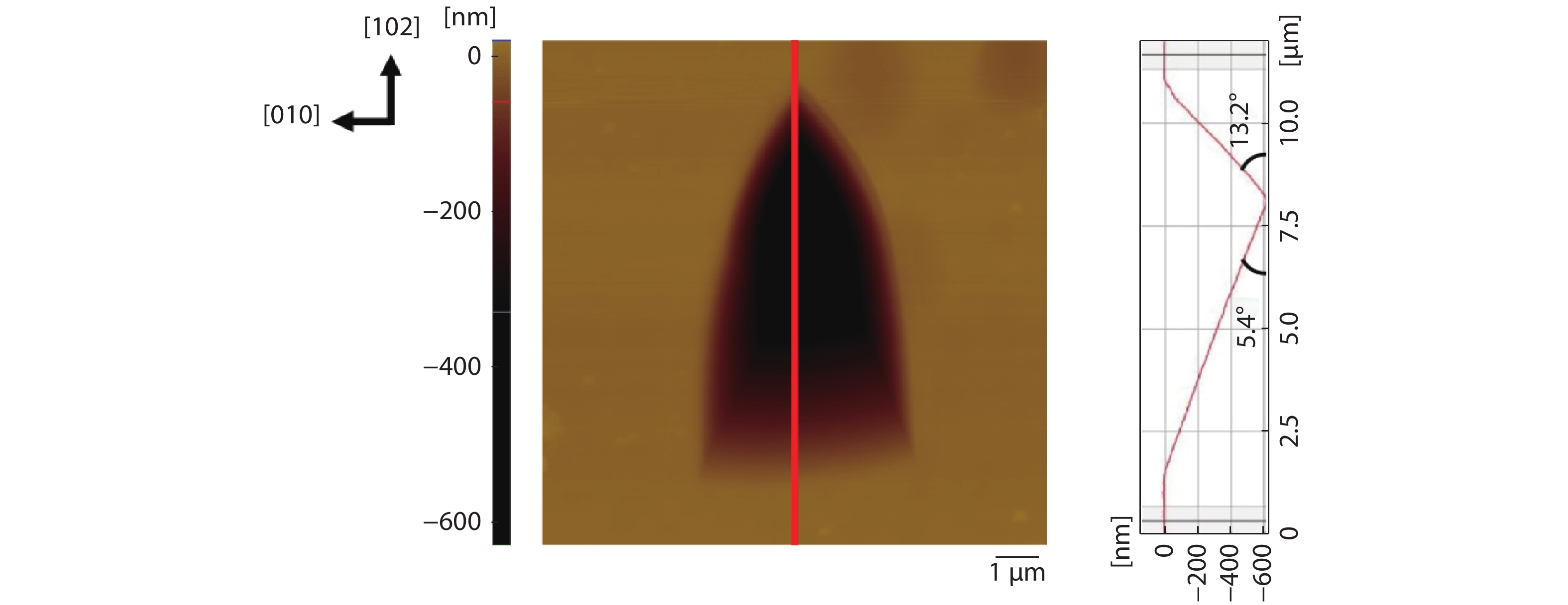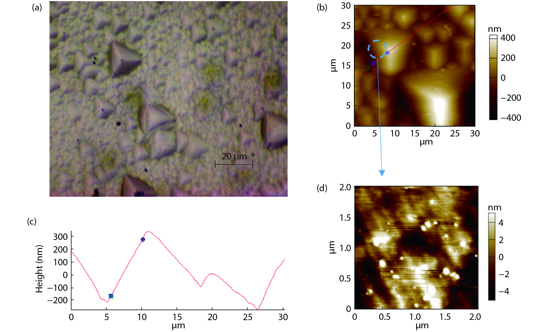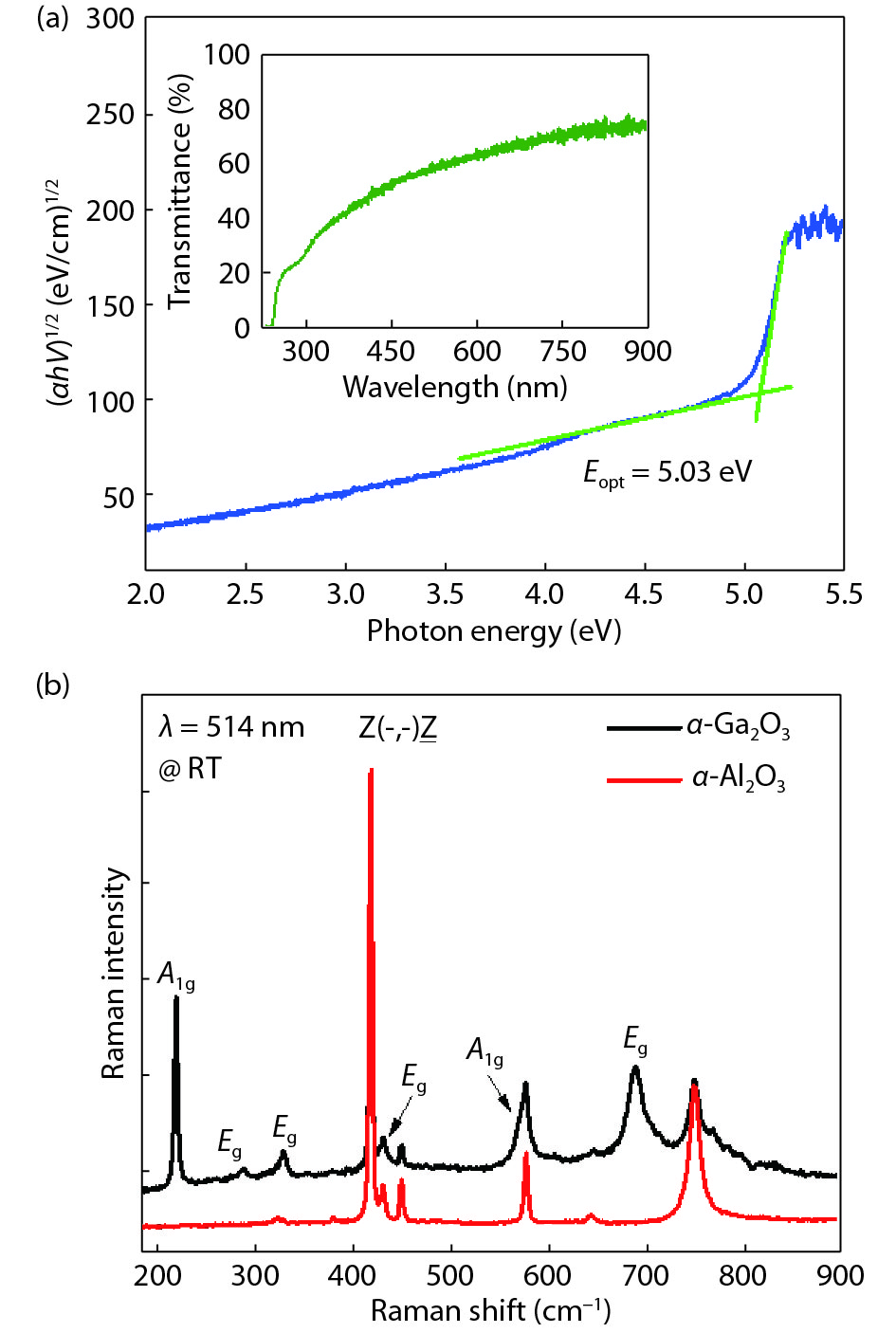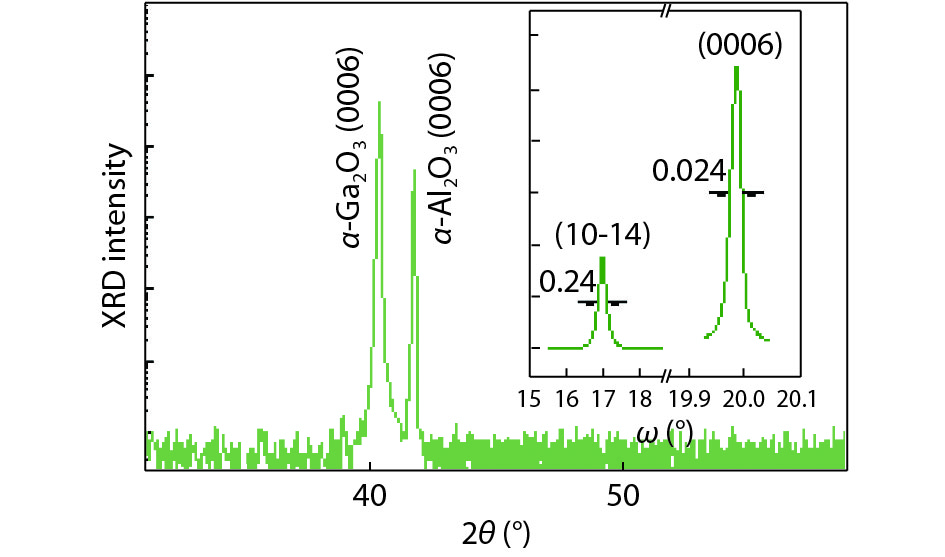 The 8 μm thick single-crystalline α-Ga2O3 epilayers have been heteroepitaxially grown on sapphire (0001) substrates via mist chemical vapor deposition technique. High resolution X-ray diffraction measurements show that the full-widths-at-half-maximum (FWHM) of rocking curves for the (0006) and (10-14) planes are 0.024° and 0.24°, and the corresponding densities of screw and edge dislocations are 2.24 × 106 and 1.63 × 109 cm?2, respectively, indicative of high single crystallinity. The out-of-plane and in-plane epitaxial relationships are [0001] α-Ga2O3//[0001] α-Al2O3 and [11-20] α-Ga2O3//[11-20] α-Al2O3, respectively. The lateral domain size is in micron scale and the indirect bandgap is determined as 5.03 eV by transmittance spectra. Raman measurement indicates that the lattice-mismatch induced compressive residual strain cannot be ruled out despite the large thickness of the α-Ga2O3 epilayer. The achieved high quality α-Ga2O3 may provide an alternative material platform for developing high performance power devices and solar-blind photodetectors.