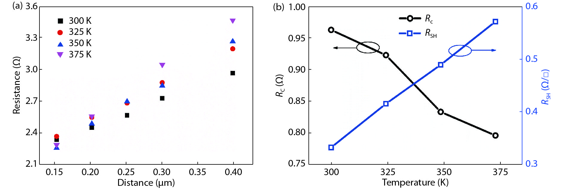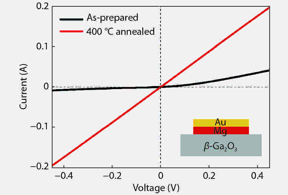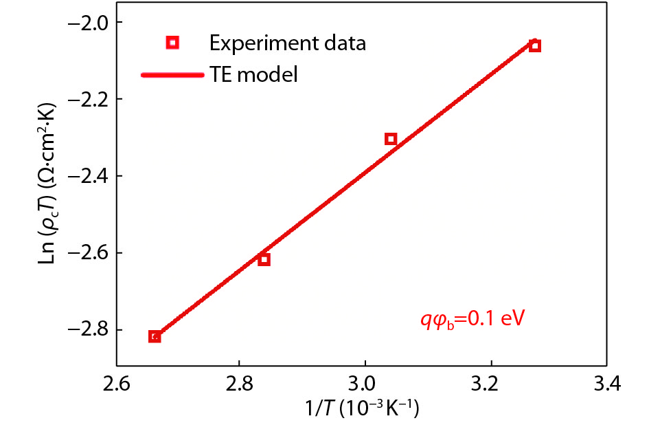 The carrier transport mechanism of Mg/Au ohmic contact for lightly doped β-Ga2O3 is investigated. An excellent ohmic contact has been achieved when the sample was annealed at 400 °C and the specific contact resistance is 4.3 × 10?4 Ω·cm2. For the annealed sample, the temperature dependence of specific contact resistance is studied in the range from 300 to 375 K. The specific contact resistance is decreased from 4.3 × 10?4 to 1.59 × 10?4 Ω·cm2 with an increase of test temperature. As combination with the judge of E00, the basic mechanism of current transport is dominant by thermionic emission theory. The effective barrier height between Mg/Au and β-Ga2O3 is evaluated to be 0.1 eV for annealed sample by fitting experimental data with thermionic emission model.