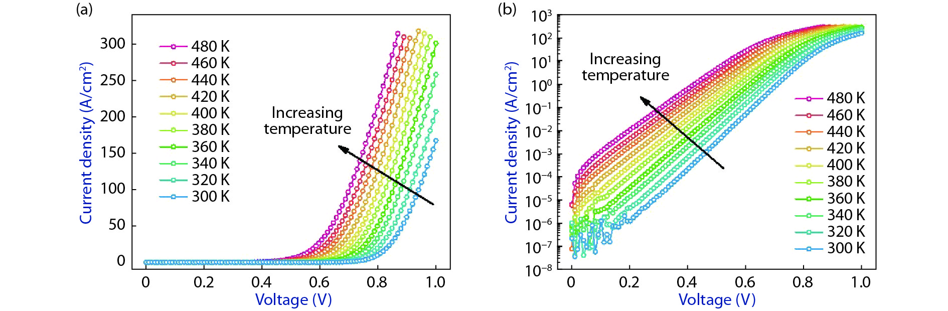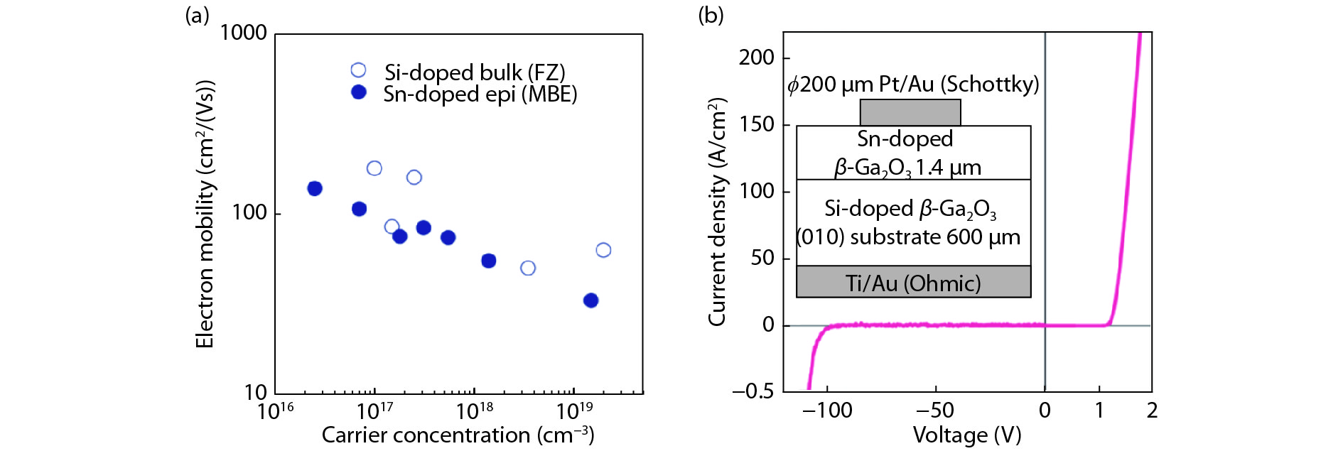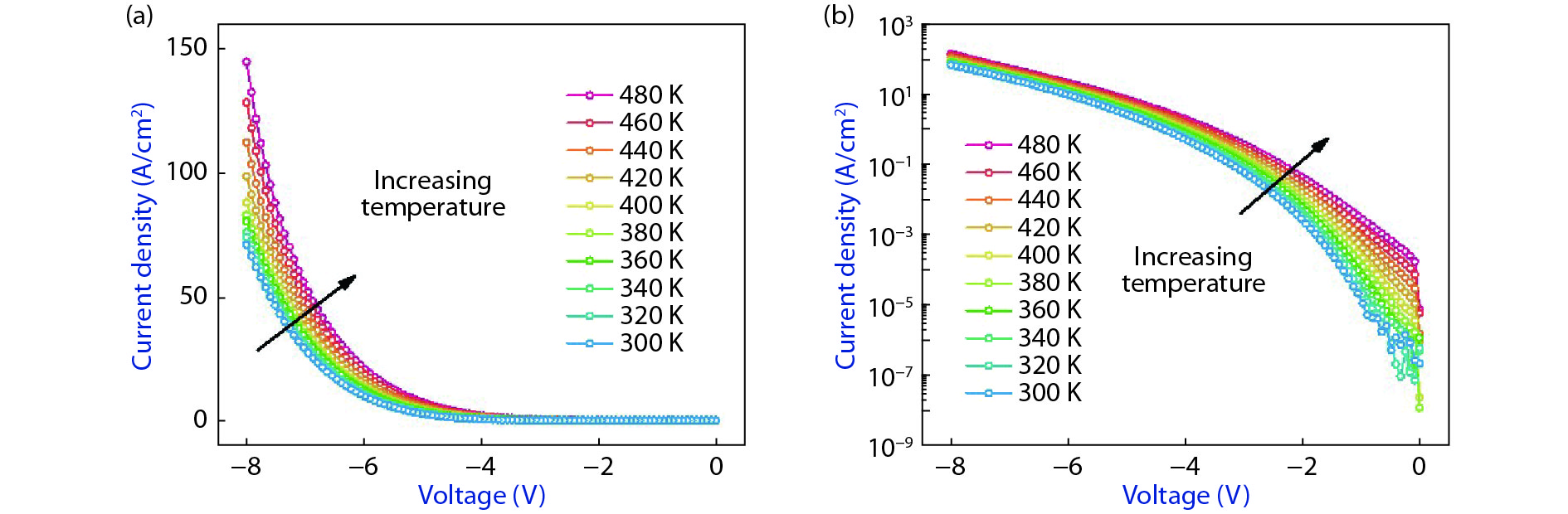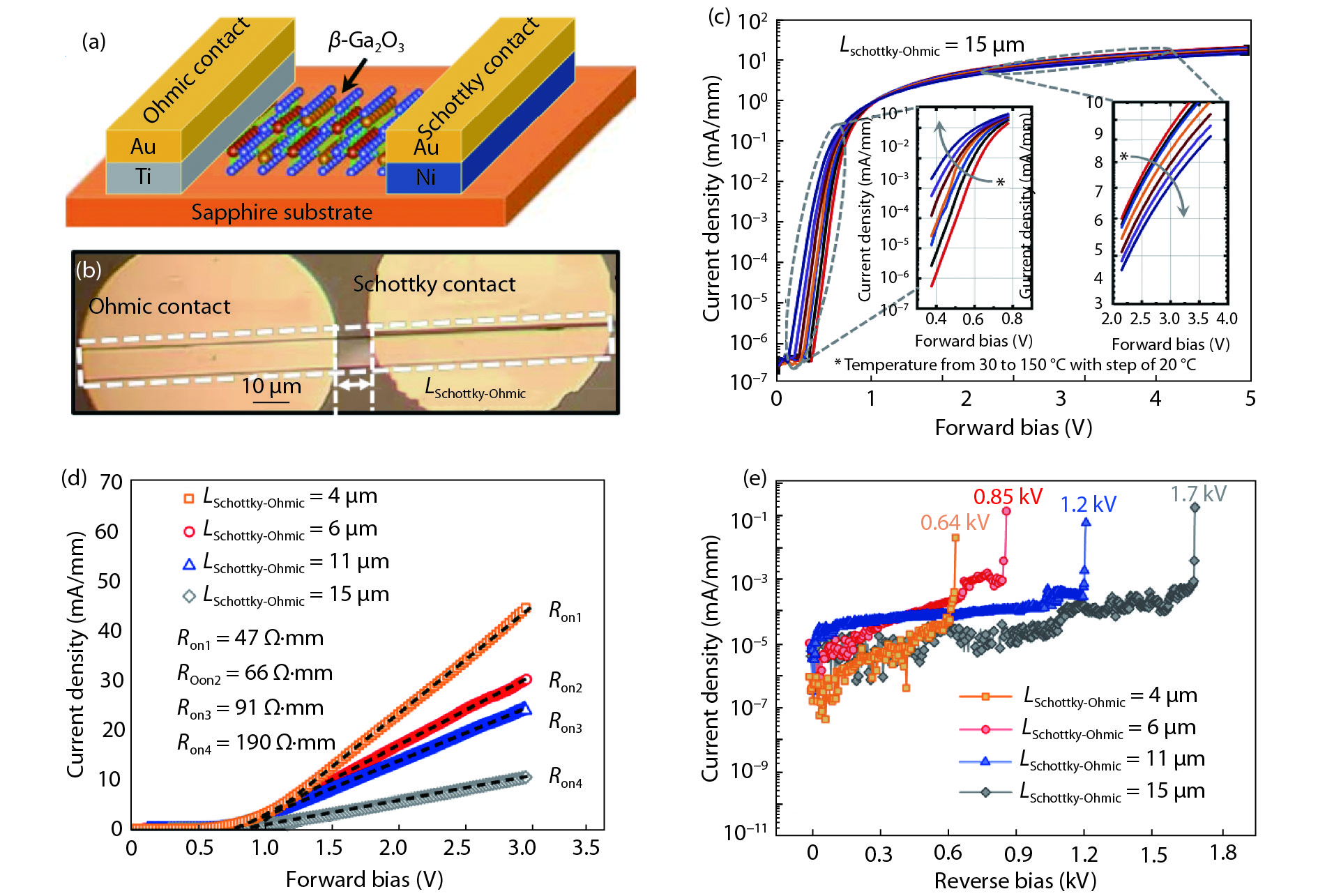 Beta-phase gallium oxide (β-Ga2O3) Schottky barrier diodes were fabricated on highly doped single-crystal substrates, where their temperature-dependent electrical properties were comprehensively investigated by forward and reverse current density – voltage and capacitance – voltage characterization. Both the Schottky barrier height and the ideality factor showed a temperature-dependence behavior, revealing the inhomogeneous nature of the Schottky barrier interface caused by the interfacial defects. With a voltage-dependent Schottky barrier incorporated into thermionic emission theory, the inhomogeneous barrier model can be further examined. Furthermore, the reverse leakage current was found to be dominated by the bulk leakage currents due to the good material and surface quality. Leakage current per distance was also obtained. These results can serve as important references for designing efficient β-Ga2O3 electronic and optoelectronic devices on highly doped substrates or epitaxial layers.