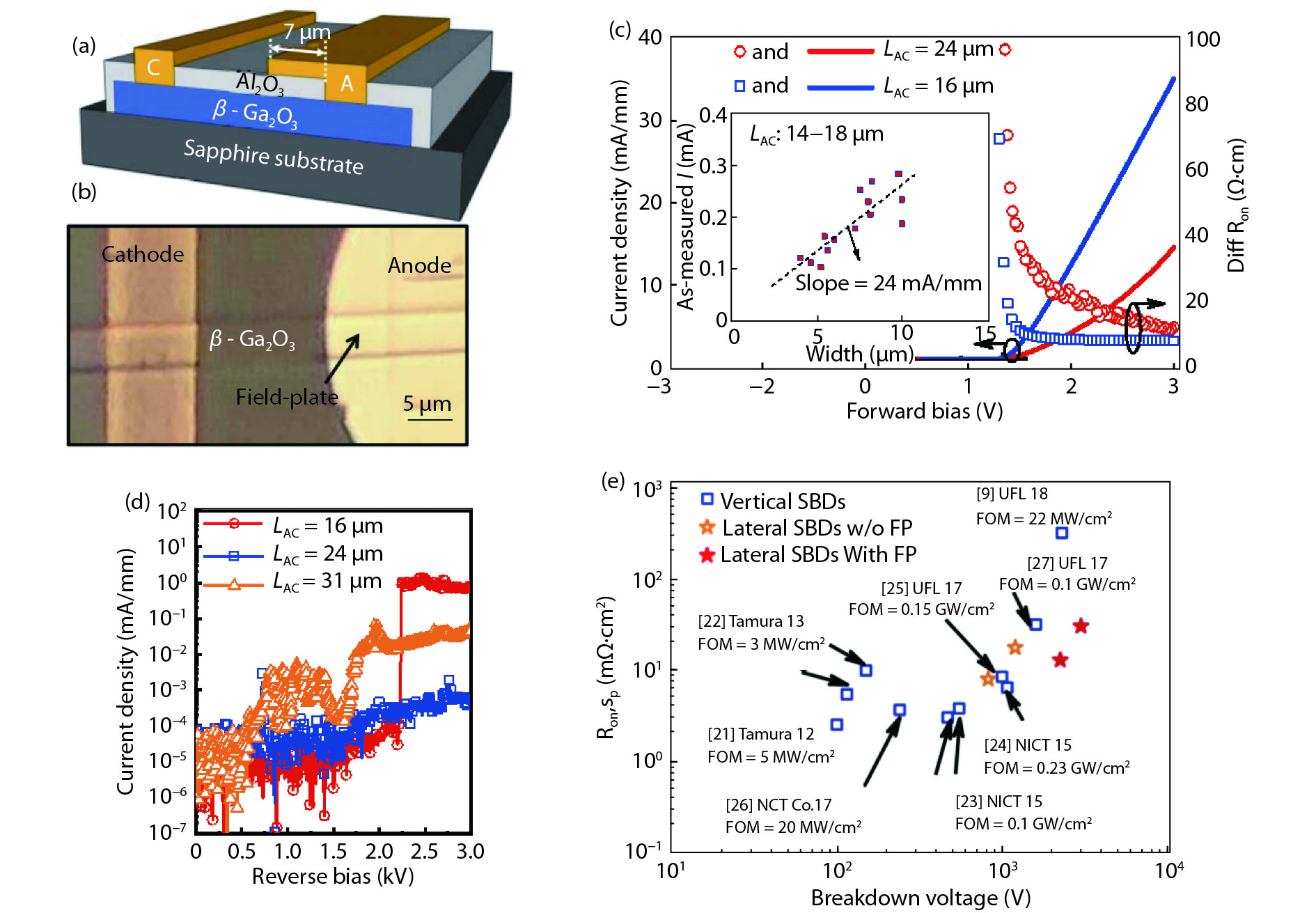 Until very recently, gallium oxide (Ga2O3) has aroused more and more interests in the area of power electronics due to its ultra-wide bandgap of 4.5–4.8 eV, estimated critical field of 8 MV/cm and decent intrinsic electron mobility limit of 250 cm2/(V·s), yielding a high Baliga’s figures-of-merit (FOM) of more than 3000, which is several times higher than GaN and SiC. In addition to its excellent material properties, potential low-cost and large size substrate through melt-grown methodology also endows β-Ga2O3 more potential for future low-cost power devices. This article focuses on reviewing the most recent advances of β-Ga2O3 based power devices. It will be starting with a brief introduction to the material properties of β-Ga2O3 and then the growth techniques of its native substrate, followed by the thin film epitaxial growth. The performance of state-of-art β-Ga2O3 devices, including diodes and FETs are fully discussed and compared. Finally, potential solutions to the challenges of β-Ga2O3 are also discussed and explored.