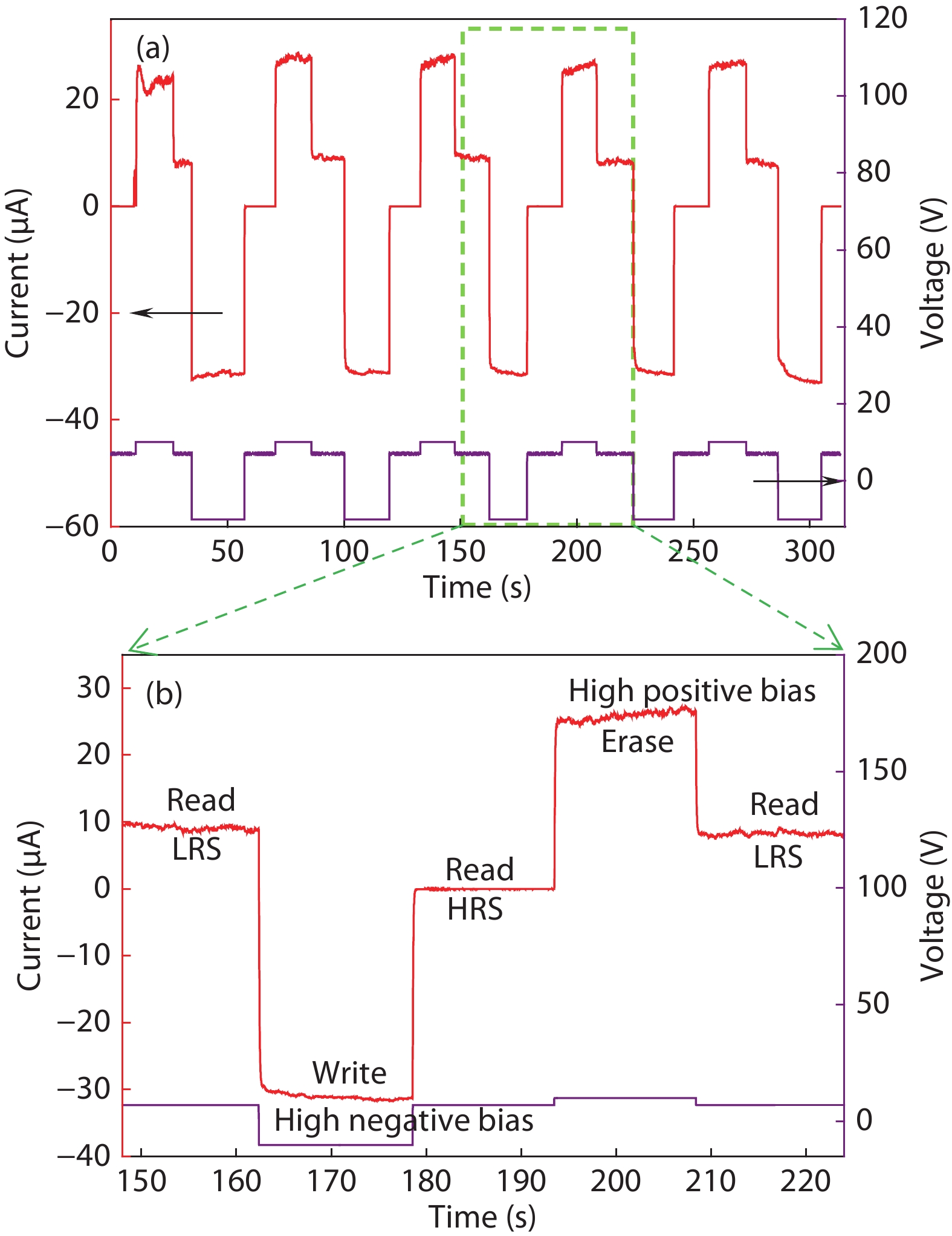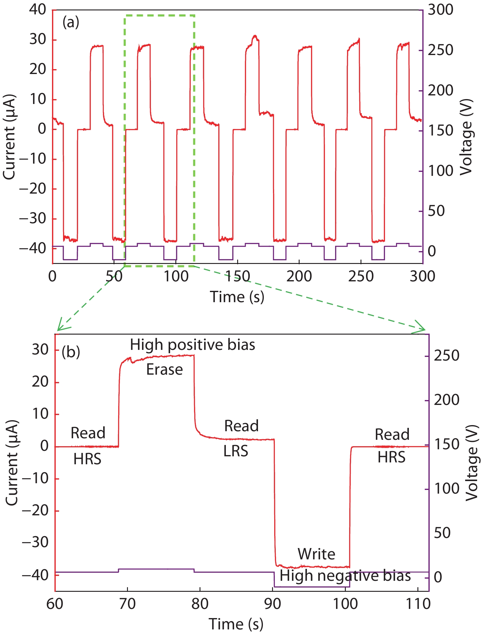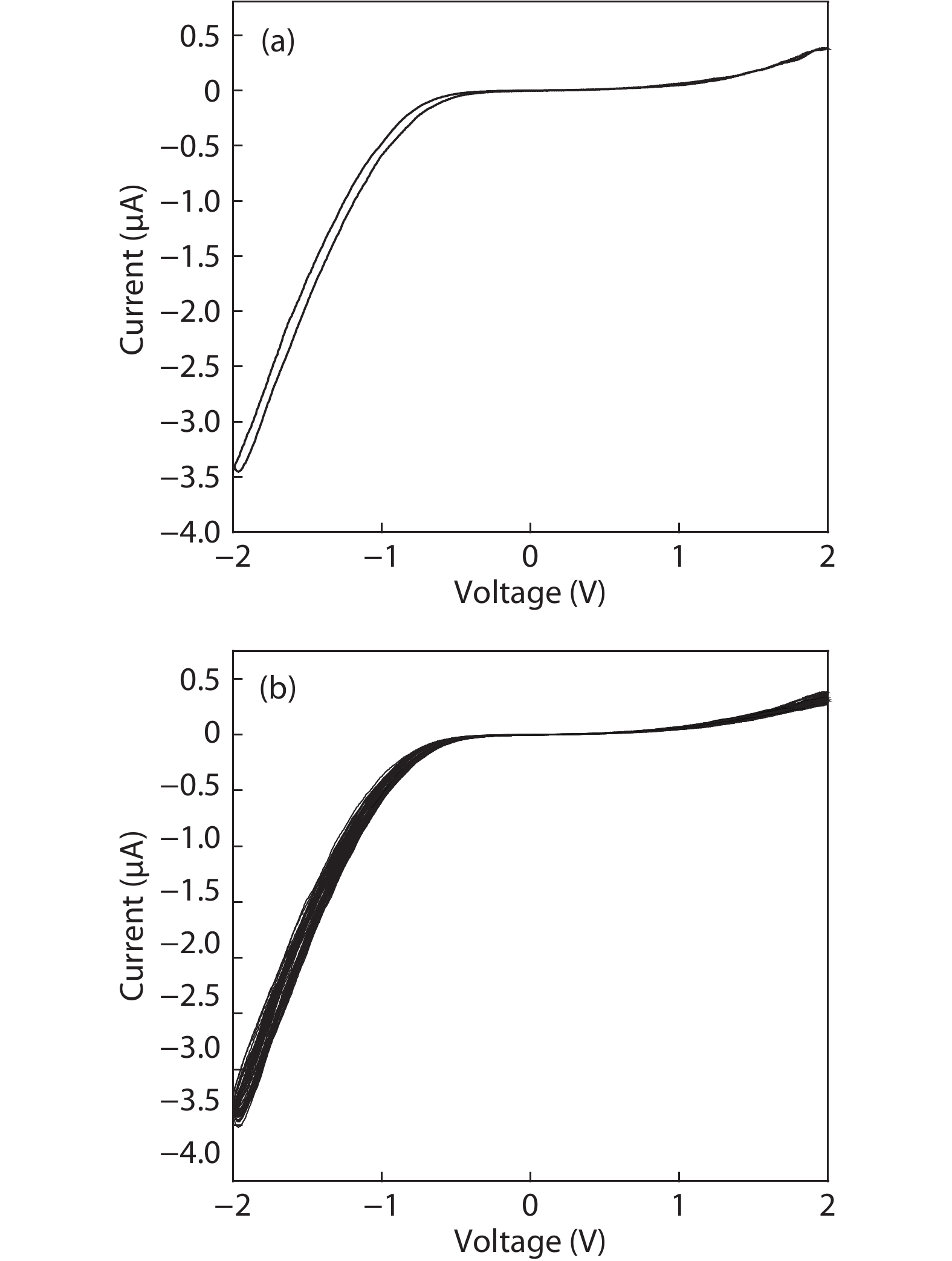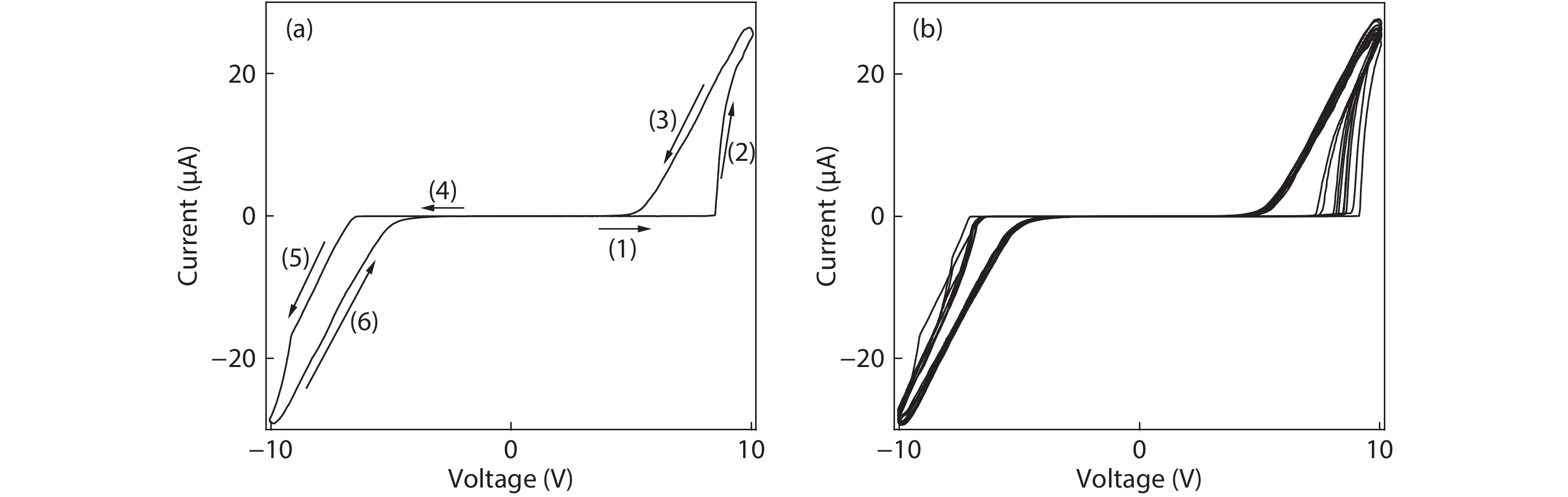 For nanostructure SnO2, it is very difficult for its electric properties to accurately control due to the presence of abundant surface states. The introduction of Sm can improve the traps in surface space charge region of SnO2 nanowires, resulting in a controllable storage charge effect. For the single nanowire-based two-terminal device, two surface state-related back-to-back diodes are formed. At a relatively large voltage, electrons can be injected into the traps in surface space charge region from negative electrode, resulting in a decrease of surface barrier connected with negative electrode, and contrarily electrons can be extracted from the traps in surface space charge region into positive electrode, resulting in an increase of surface barrier connected with positive electrode. The reversible injection and extraction induce a nonvolatile resistive switching memory effect.