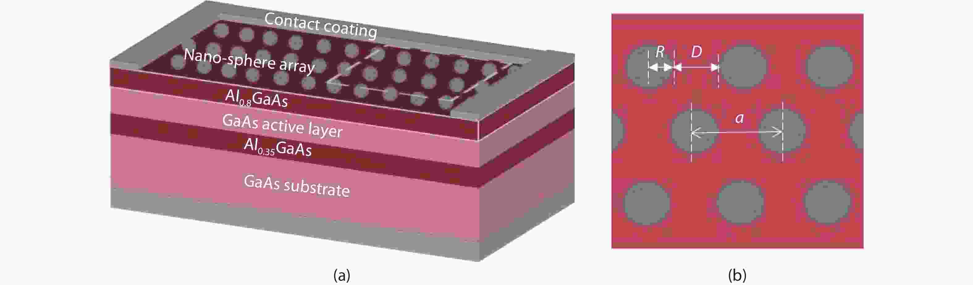 In this paper, we present our efforts on simulating and analyzing the effect of two-dimensional nano-sphere surface array on the characteristic of GaAs solar cells. Based on the scattering and diffraction theory of the photonic crystals, the simulation results show that the distance of adjacent nano-spheres (D) has the pronounced influence on the conversion efficiency and exhibits much poor tolerance, the absolutely conversion efficiency is reduced by exceeding of 2% as the D varies from 0 to 1 μm, in addition, the lower conversion efficiency (< 18%) is exhibited and almost remains unaltered when the D is of > 2 μm. The radius (R) of nano-spheres demonstrates much great tolerance. For D = 0, the solar cells exhibit high conversion efficiency (> 20%) and the efficiency is only varied by less than 1% when R is varied in a very wide region of 0.3–1.2 μm. One can also find out that there is good tolerance for efficiency around the optimal value of refractive index and there is only about 0.2% decrease in final cell efficiency for around ±24% variation in the optimal values, which implys that it does not demand high precision processing equipment and the whole nano-sphere array could be fully complemented using self-assembled chemical methods.
