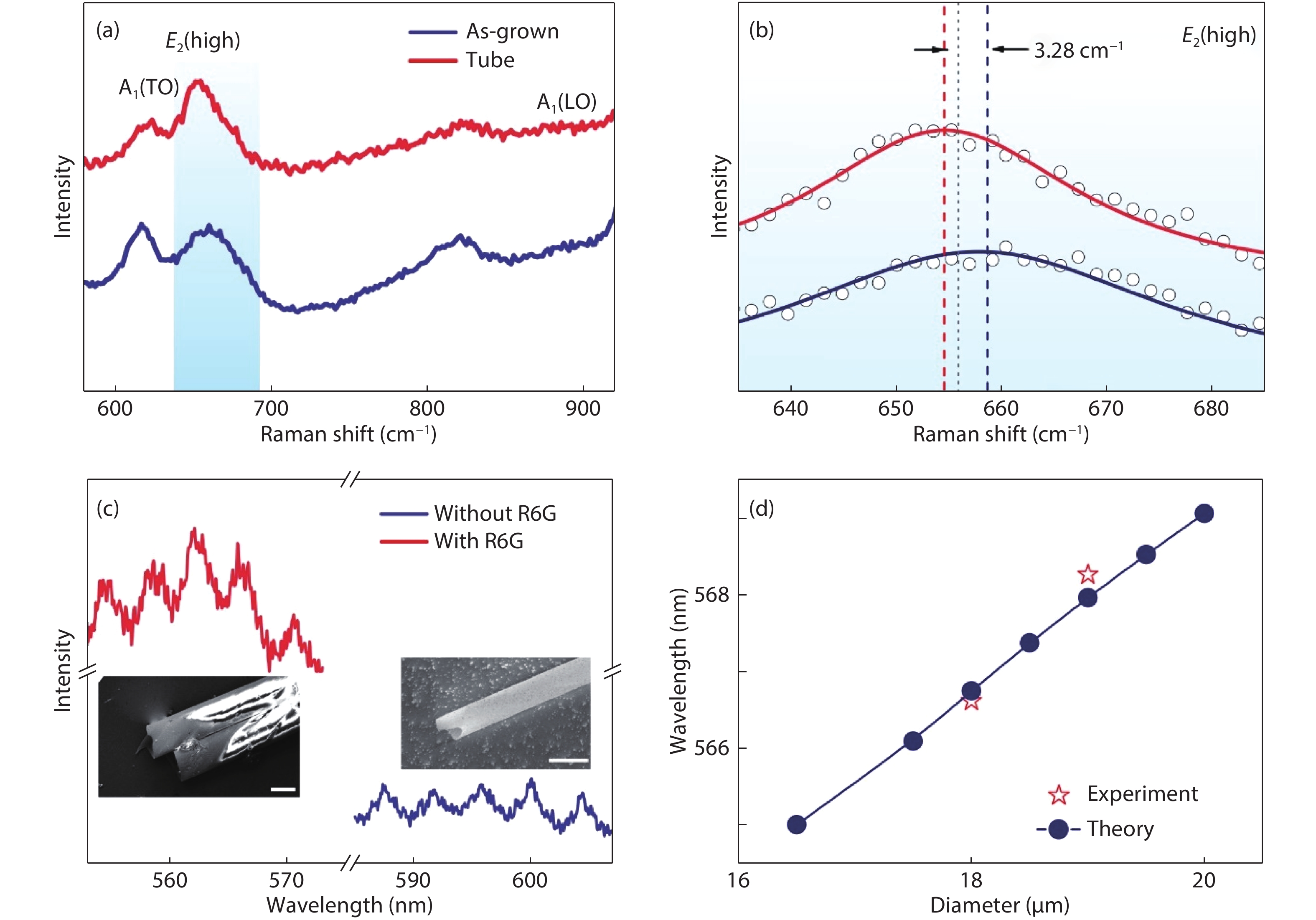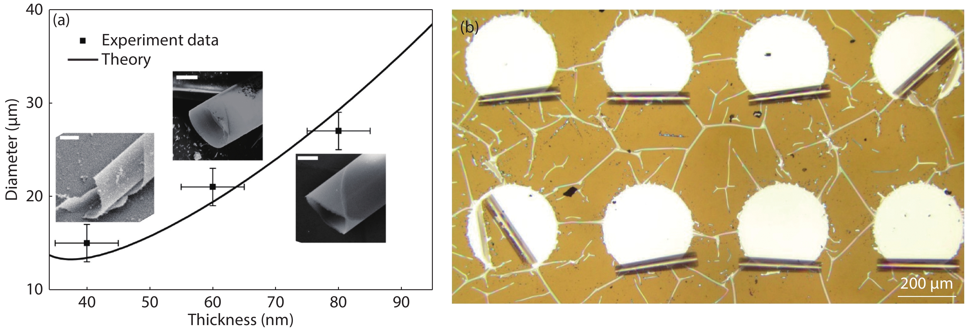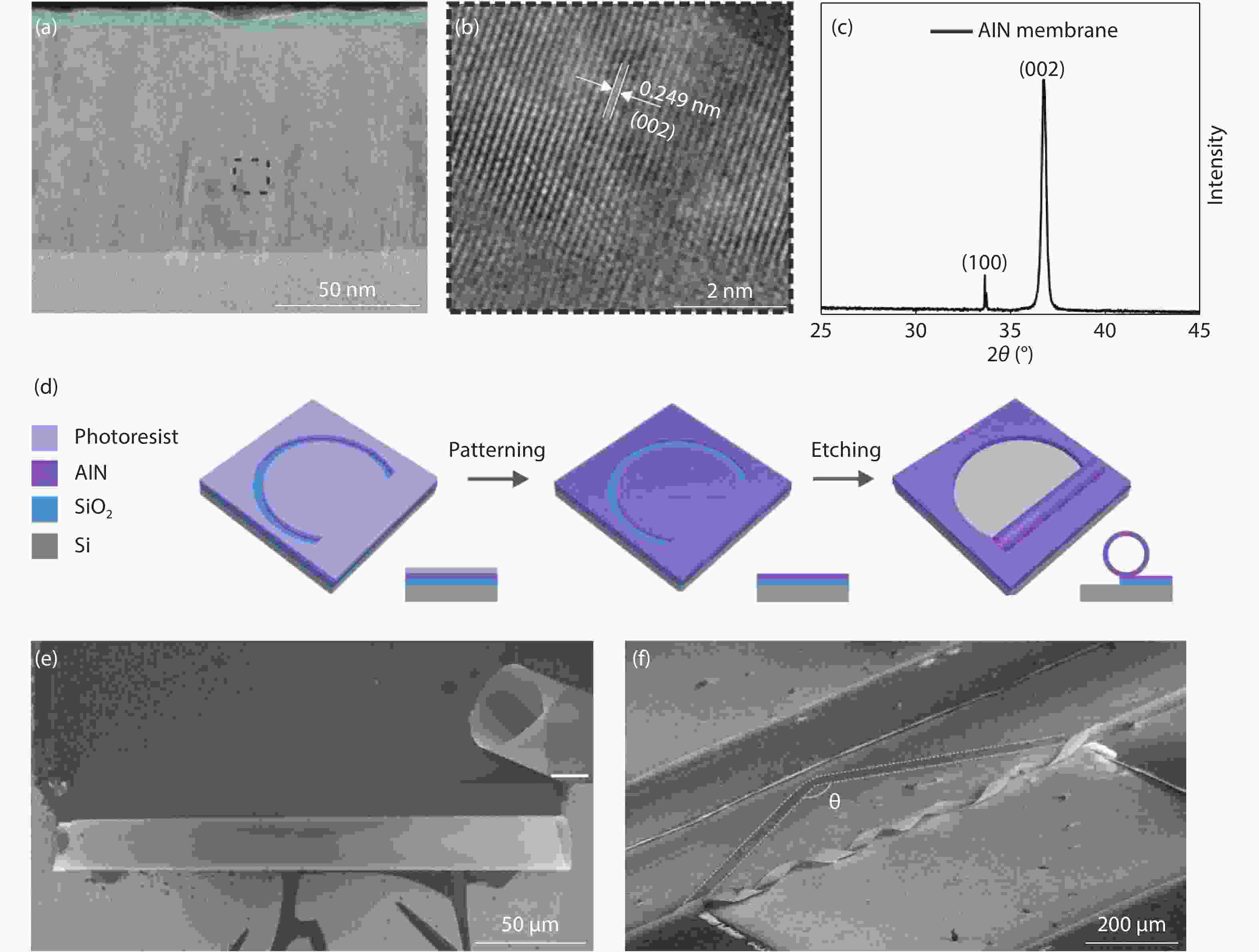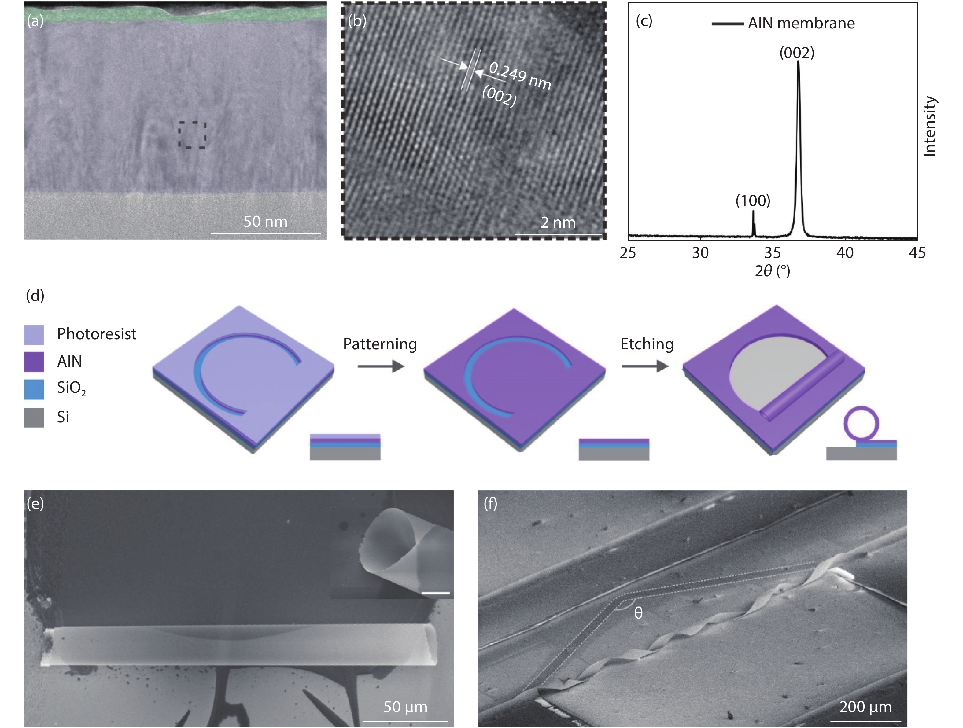 Aluminum nitride (AlN) has attracted a great amount of interest due to the fact that these group III–V semiconductors present direct band gap behavior and are compatible with current micro-electro-mechanical systems. In this work, three dimensional (3D) AlN architectures including tubes and helices were constructed by rolling up AlN nanomembranes grown on a silicon-on-insulator wafer via magnetron sputtering. The properties of the AlN membrane were characterized through transmission electron microscopy and X-ray diffraction. The thickness of AlN nanomembranes could be tuned via the RIE thinning method, and thus micro-tubes with different diameters were fabricated. The intrinsic strain in AlN membranes was investigated via micro-Raman spectroscopy, which agrees well with theory prediction. Whispering gallery mode was observed in AlN tubular optical microcavity in photoluminescence spectrum. A postprocess involving atomic layer deposition and R6G immersion were employed on as-fabricated AlN tubes to promote the Q-factor. The AlN tubular micro-resonators could offer a novel design route for Si-based integrated light sources. In addition, the rolled-up technology paves a new way for AlN 3D structure fabrication, which is promising for AlN application in MEMS and photonics fields.