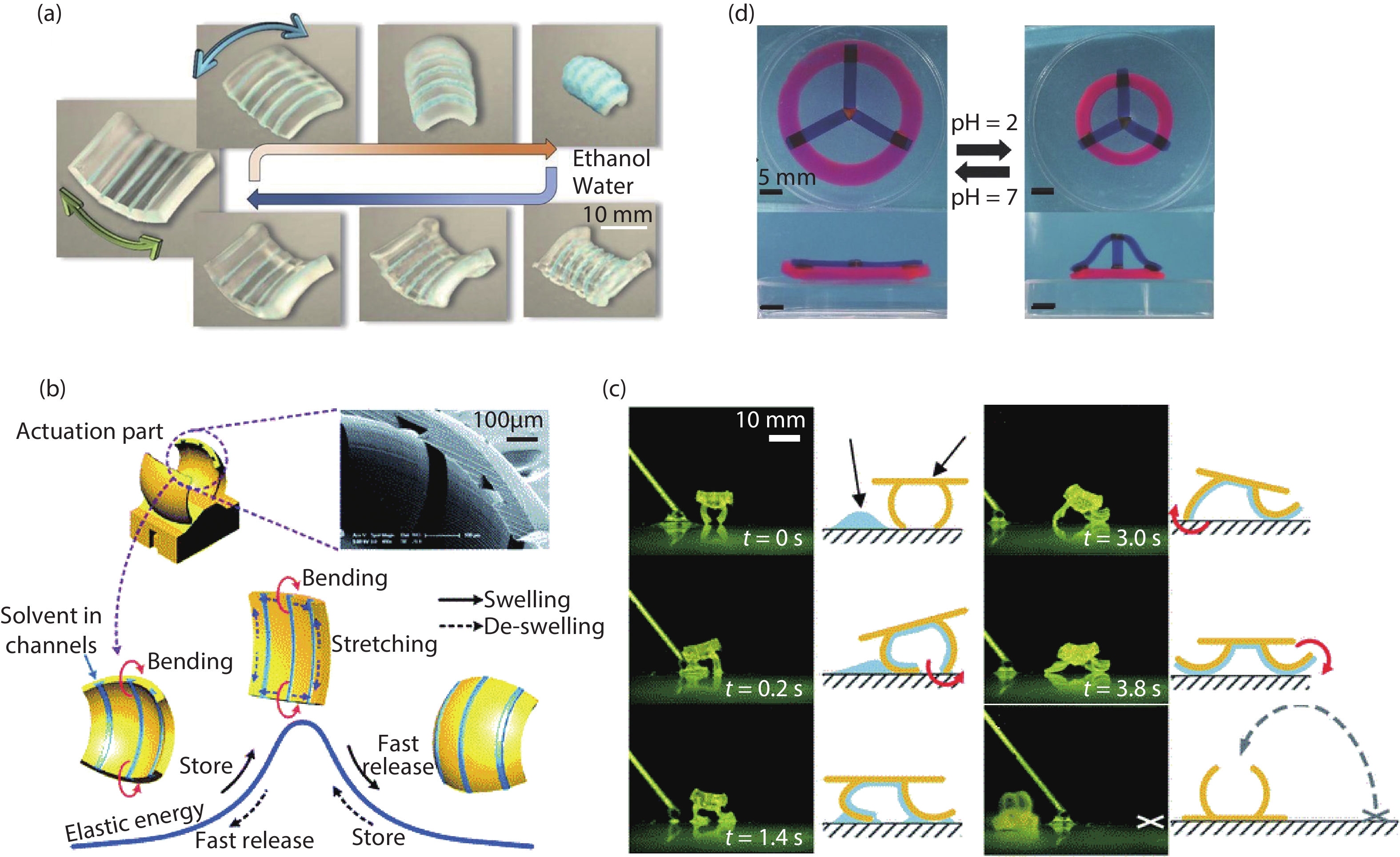 Soft robots complement the existing efforts of miniaturizing conventional, rigid robots, and have the potential to revolutionize areas such as military equipment and biomedical devices. This type of system can accomplish tasks in complex and time-varying environments through geometric reconfiguration induced by diverse external stimuli, such as heat, solvent, light, electric field, magnetic field, and mechanical field. Approaches to achieve reconfigurable mesostructures are essential to the design and fabrication of soft robots. Existing studies mainly focus on four key aspects: reconfiguration mechanisms, fabrication schemes, deformation control principles, and practical applications. This review presents a detailed survey of methodologies for morphable mesostructures triggered by a wide range of stimuli, with a number of impressive examples, demonstrating high degrees of deformation complexities and varied multi-functionalities. The latest progress based on the development of new materials and unique design concepts is highlighted. An outlook on the remaining challenges and open opportunities is provided.