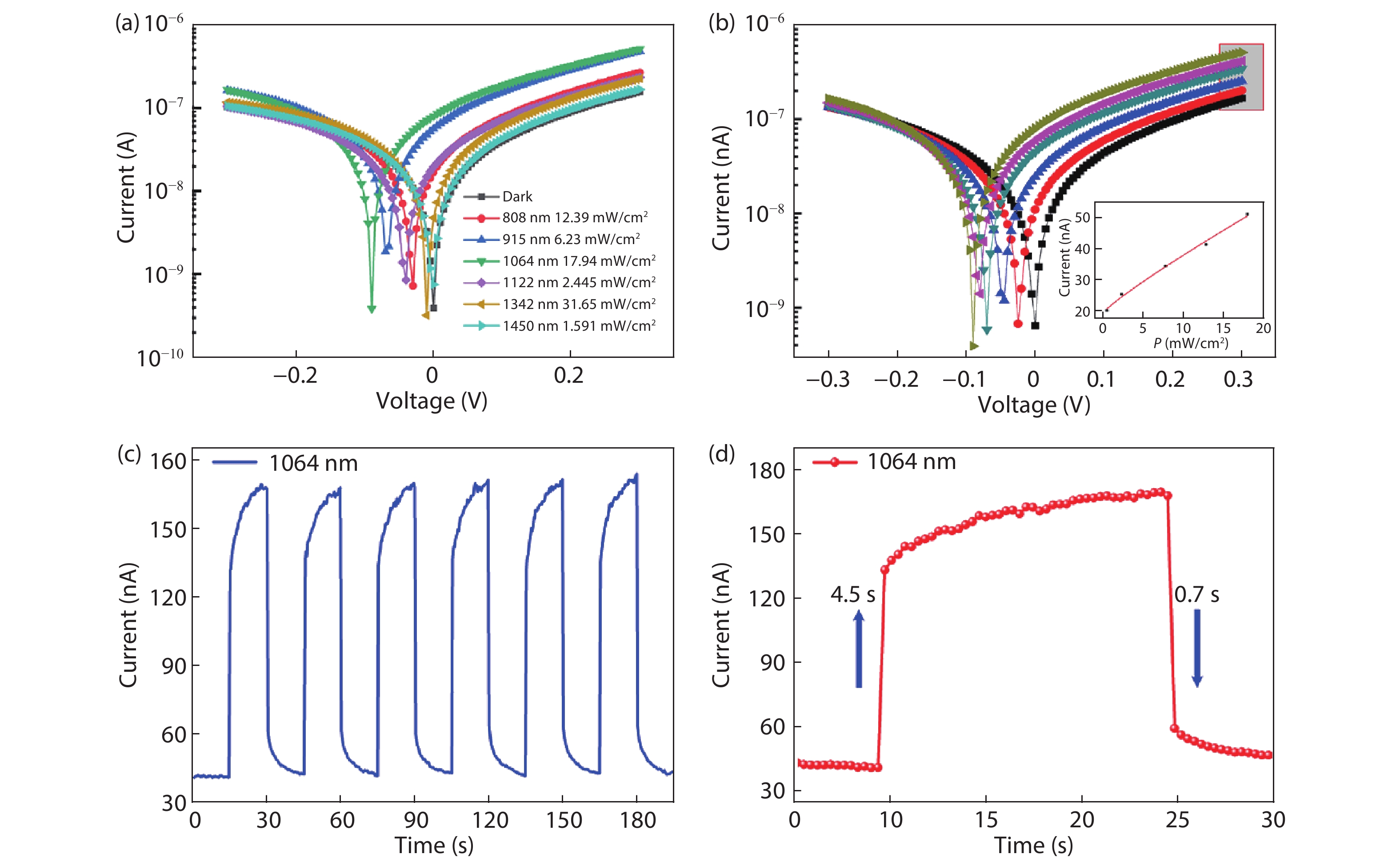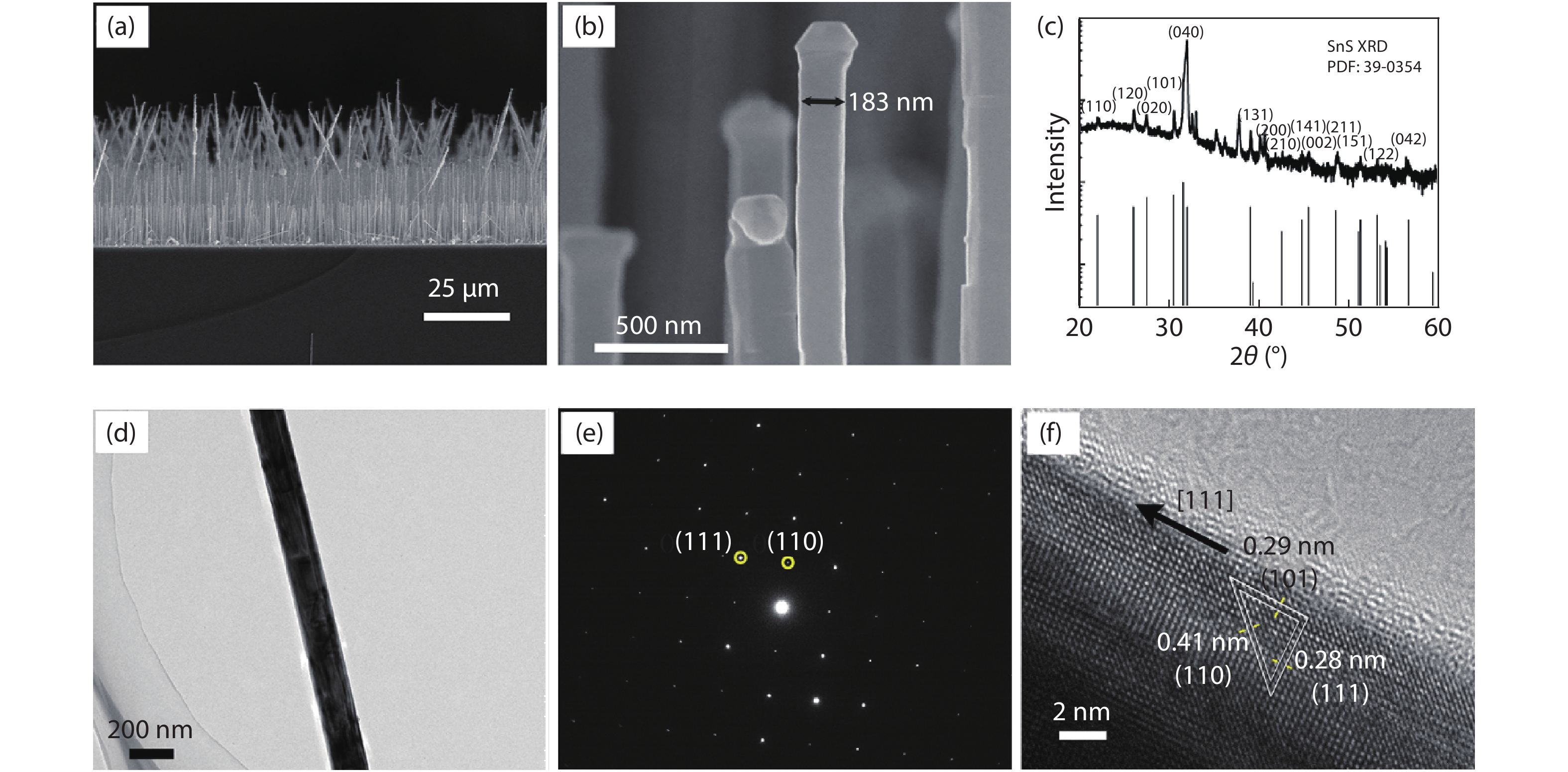 Aligned SnS nanowires arrays were grown via a simple chemical vapor deposition method. As-synthesized SnS nanowires are single crystals grown along the [111] direction. The single SnS nanowire based device showed excellent response to near infrared lights with good responsivity of 267.9 A/W, high external quantum efficiency of 3.12 × 104 % and fast response time. Photodetectors were built on the aligned SnS nanowire arrays, exhibiting a light on/off ratio of 3.6, and the response and decay time of 4.5 and 0.7 s, respectively, to 1064 nm light illumination.