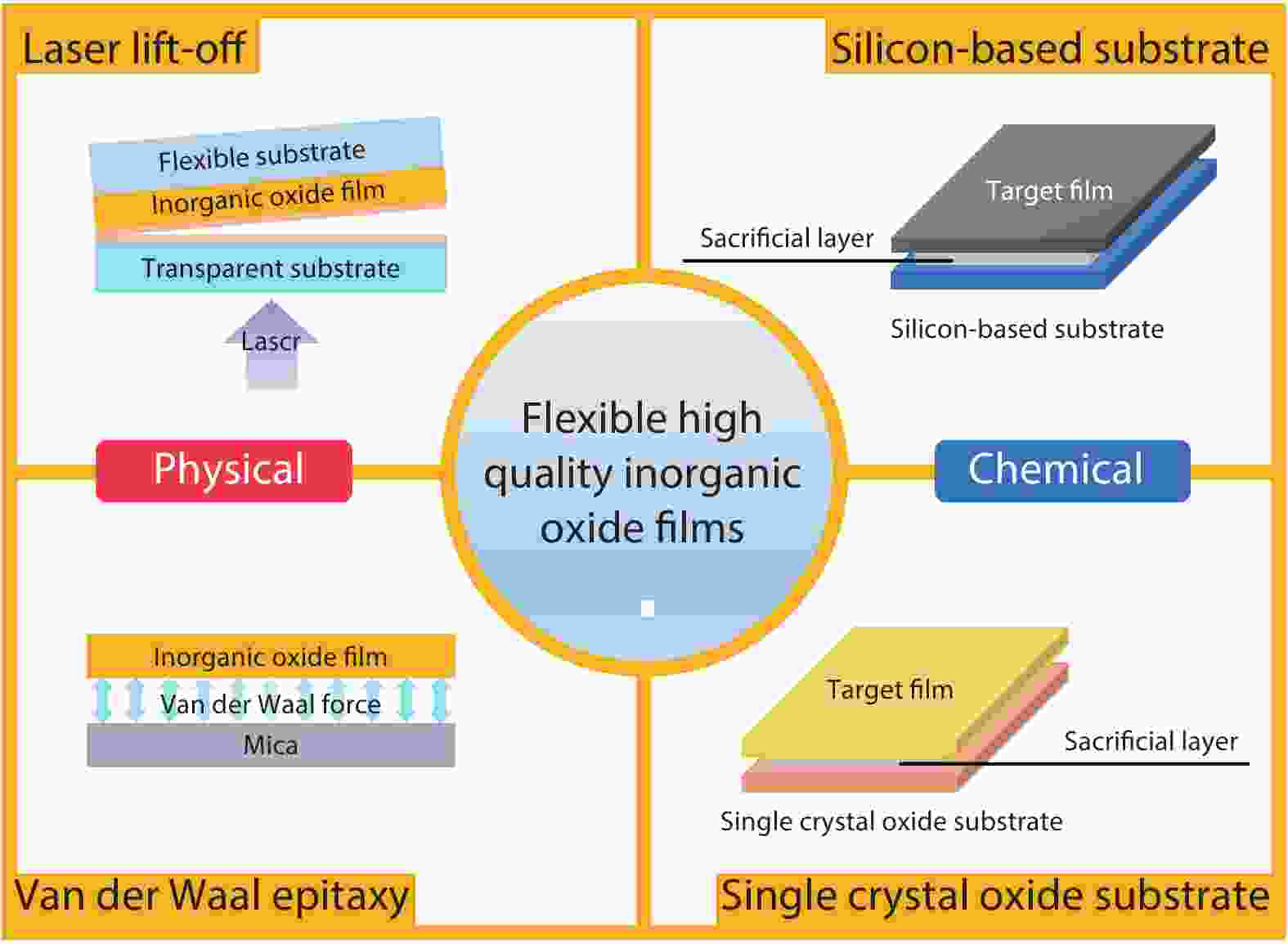 With the advent of human-friendly intelligent life, as well as increasing demands for natural and seamless human-machine interactions, flexibility and wearability are among the inevitable development trends for electronic devices in the future. Due to the advantages of rich physicochemical properties, flexible and stretchable inorganic oxide thin-film electronics play an increasingly important role in the emerging and exciting flexible electronic field, and they will act as a critical player in next-generation electronics. However, a stable strategy to render flexibility while maintaining excellent performance of oxide thin films is the most demanding and challenging problem, both for academic and industrial communities. Thus, this review focuses on the latest advanced strategies to achieve flexible inorganic oxide thin-film electronics. This review emphasizes the physical transferring strategies that are based on mechanical peeling and the chemical transferring strategies that are based on sacrificial layer etching. Finally, this review evaluates and summarizes the merits and demerits of these strategies toward actual applications, concluding with a future perspective into the challenges and opportunities for the next-generation of flexible inorganic oxide thin-film electronics.