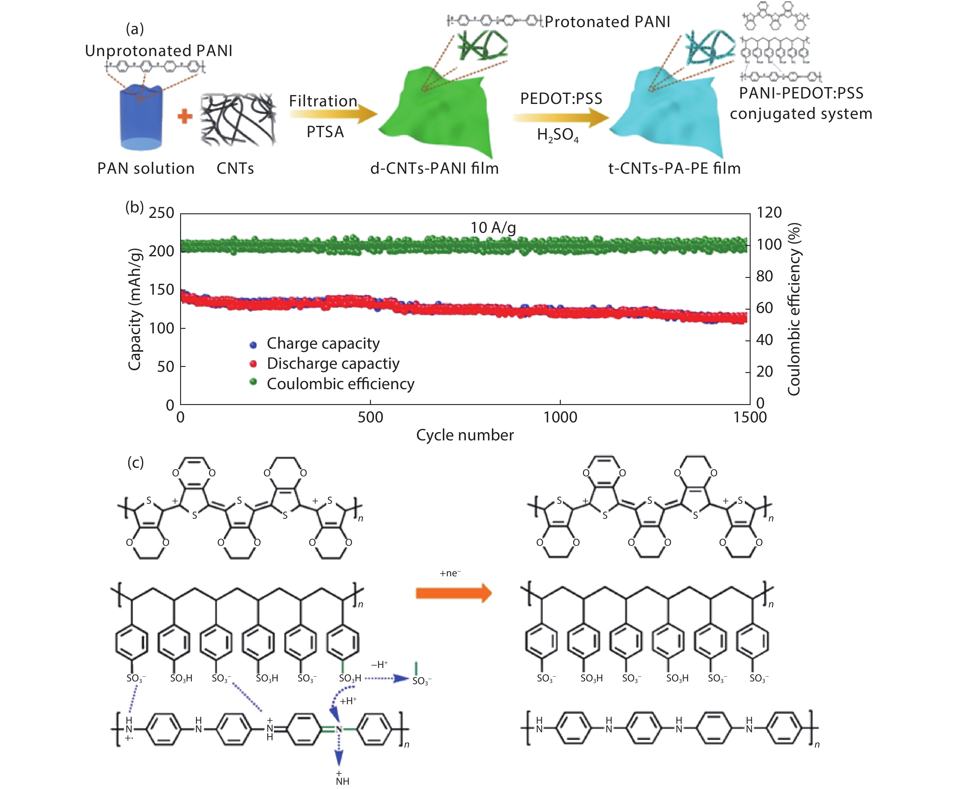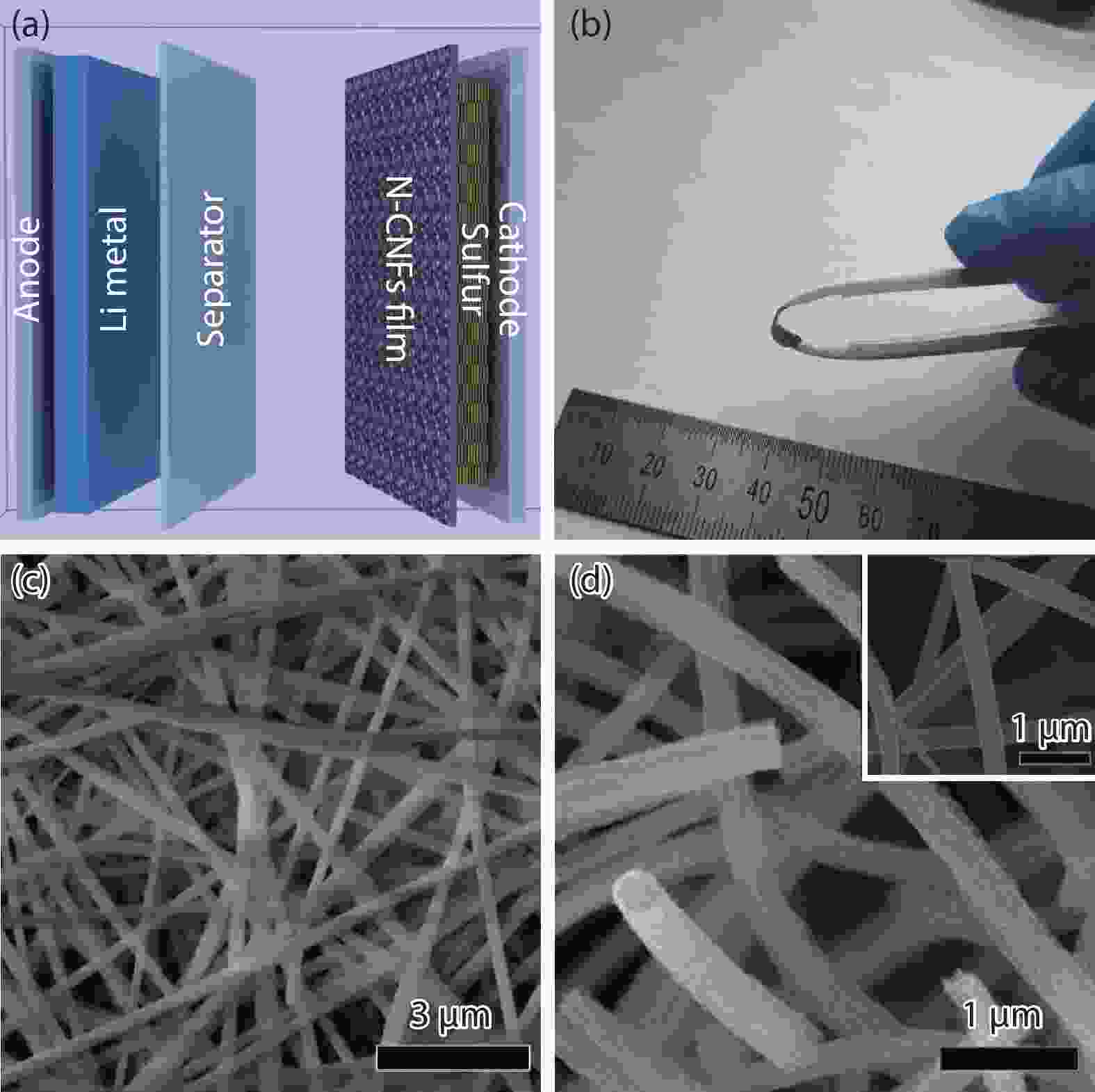Lithium–sulfur (Li–S) battery with a new configuration is demonstrated by inserting a flexible nitrogen-doping carbon nanofiber (N-CNFs) interlayer between the sulfur cathode and the separator. The N-CNFs film with high surface roughness and surface area is fabricated by electrospinning and a subsequent calcination process. The N-CNFs film interlayer not only effectively traps the shuttling migration of polysulfides but also gives the whole battery reliable electronic conductivity, which can effectively enhance the electrochemical performance of Li–S batteries. Finally, Li–S batteries with long cycling stability of 785 mAh/g after 200 cycles and good rate capability of 573 mAh/g at 5 C are achieved.