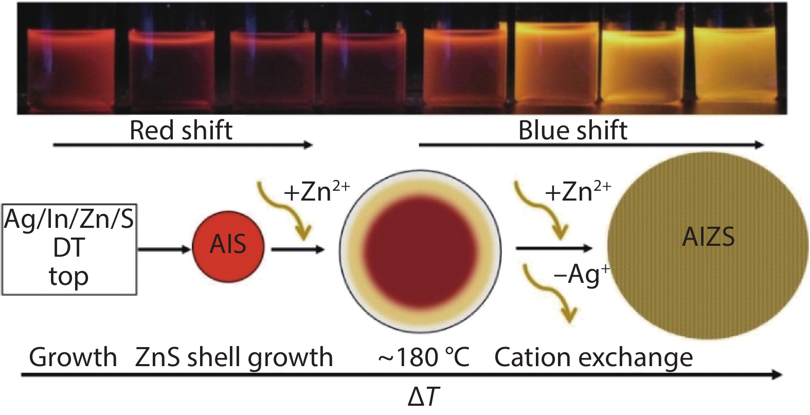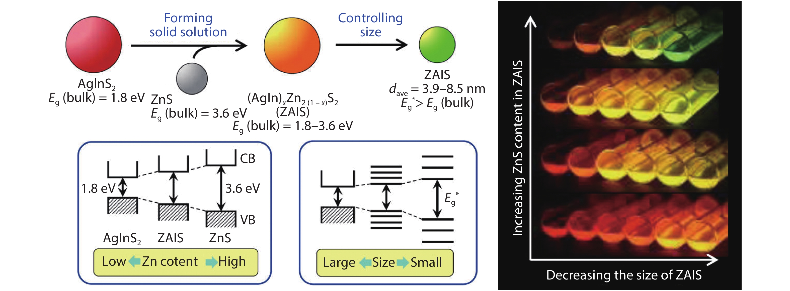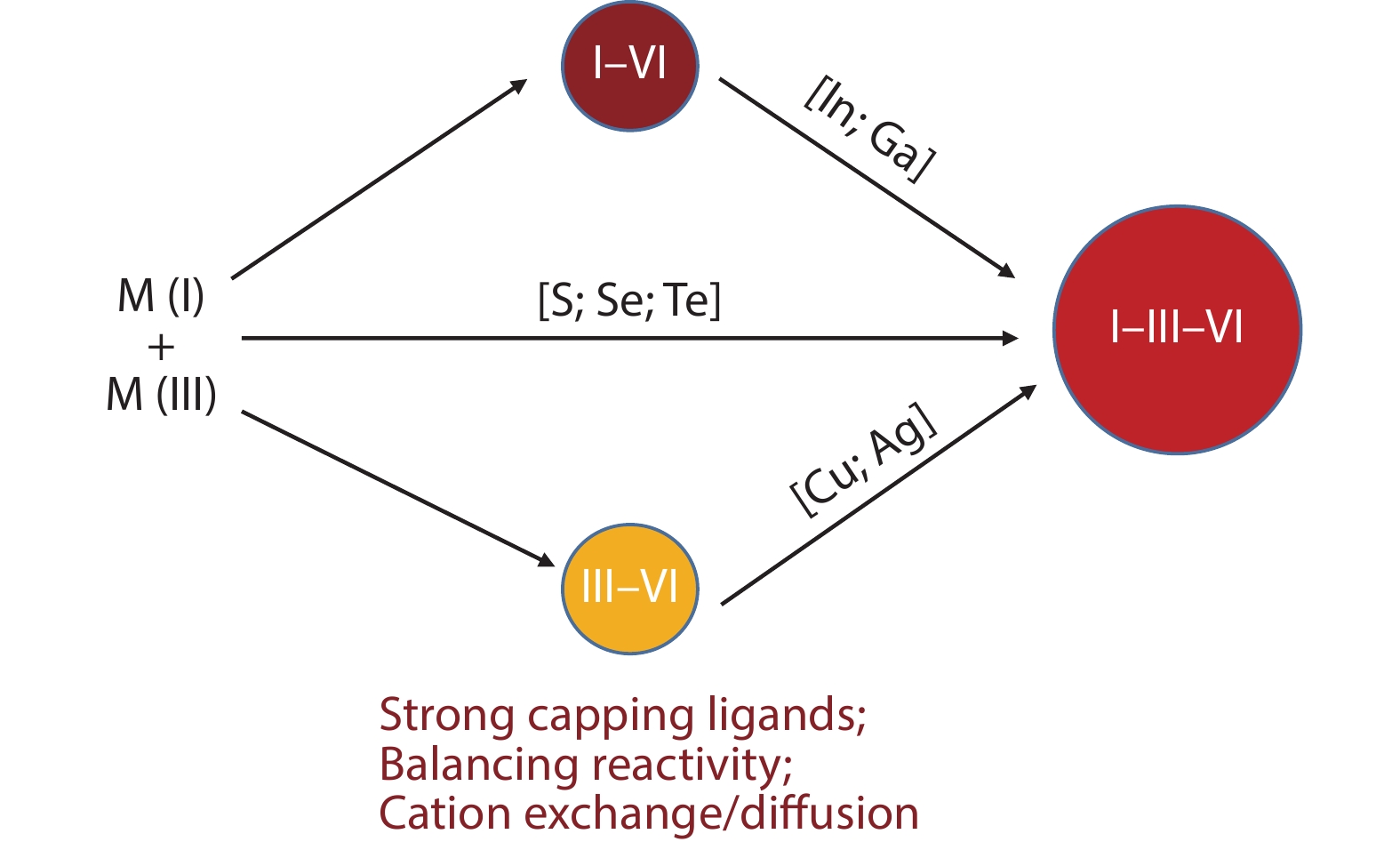 Due to the quantum size effect and other unique photoelectric properties, quantum dots (QDs) have attracted tremendous interest in nanoscience, leading a lot of milestone works. Meantime, the scope and scientific connotation of QDs are constantly expanding, which demonstrated amazing development vitality. Besides the well-developed Cd-containing II–VI semiconductors, QDs of environmentally friendly I–III–VI (I = Cu, Ag; III = Ga, In; VI = S, Se) chalcogenides have been a hot spot in the QDs family, which are different from traditional II–VI QDs in terms of multi-composition, complex defect structure, synthetic chemistry and optical properties, bringing a series of new laws, new phenomena and new challenges. The composition of I–III–VI chalcogenides and their solid solutions can be adjusted within a very large range while the anion framework remains stable, giving them excellent capability of photoelectric property manipulation. The important features of I–III–VI QDs include wide-range bandgap tuning, large Stokes shift and long photoluminescence (PL) lifetime, which are crucial for biological, optoelectronic and energy applications. This is due to the coexistence of two or more metal cations leading to a large number of intrinsic defects within the crystal lattice also known as deep-donor-acceptor states, besides the commonly observed surface defects in all QDs. However, a profound understanding of their structure and optoelectronic properties remains a huge challenge with many key issues unclear. On one hand, the achievements and experience of traditional QD research are expected to provide vital value for further development of I–III–VI QDs. On the other hand, the understanding of the emerging new QDs, such as carbon and other 2D materials, are even more challenging because of the dramatically different composition and structure from II–VI semiconductors. For this, I–III–VI QDs, as a close relative to II–VI QDs but with much more complex composition and structure variation, provide a great opportunity as a gradual bridge to make up the big gap between traditional QDs and emerging new QDs, such as carbon dots. Here, we hope to compare the research progress of I–III–VI QDs and II–VI QDs, in an effort to comprehensively understand their structure, synthetic chemistry, optical electronic and photocatalytic properties. We further give insights on the key potential issues of I–III–VI QDs from the perspective of bridging between traditional QDs and emerging carbon dots, especially the profound principles behind synthetic chemistry, PL mechanism and optoelectronic applications.