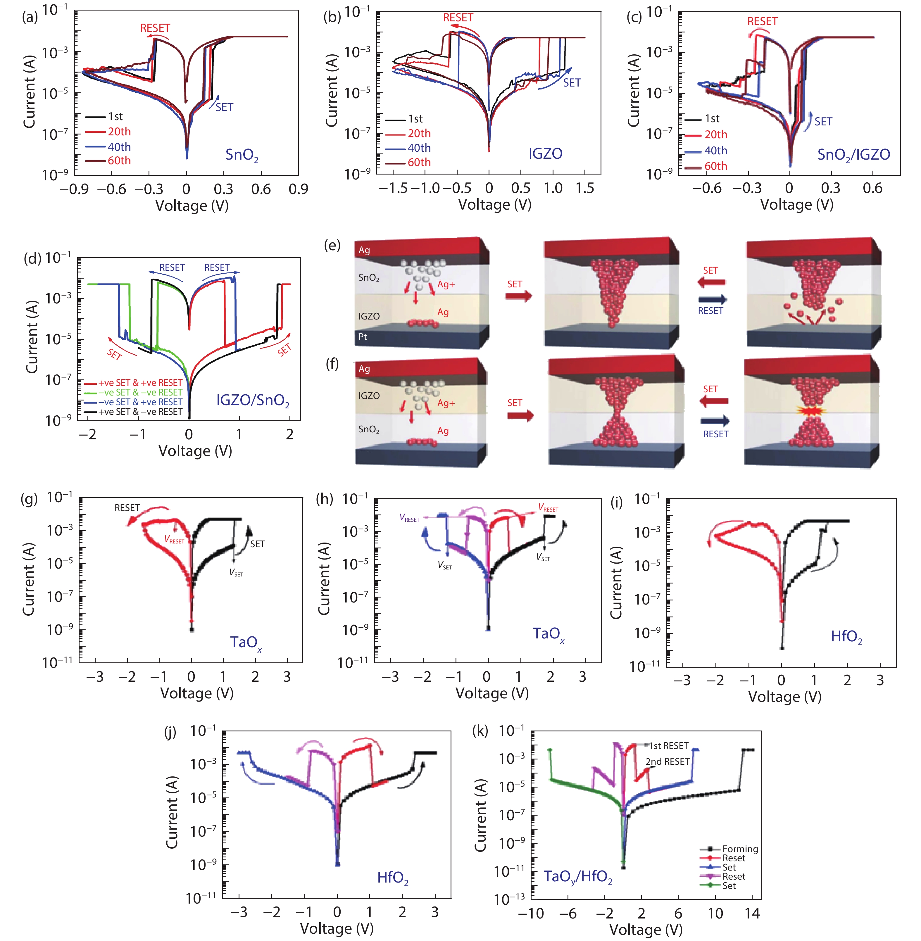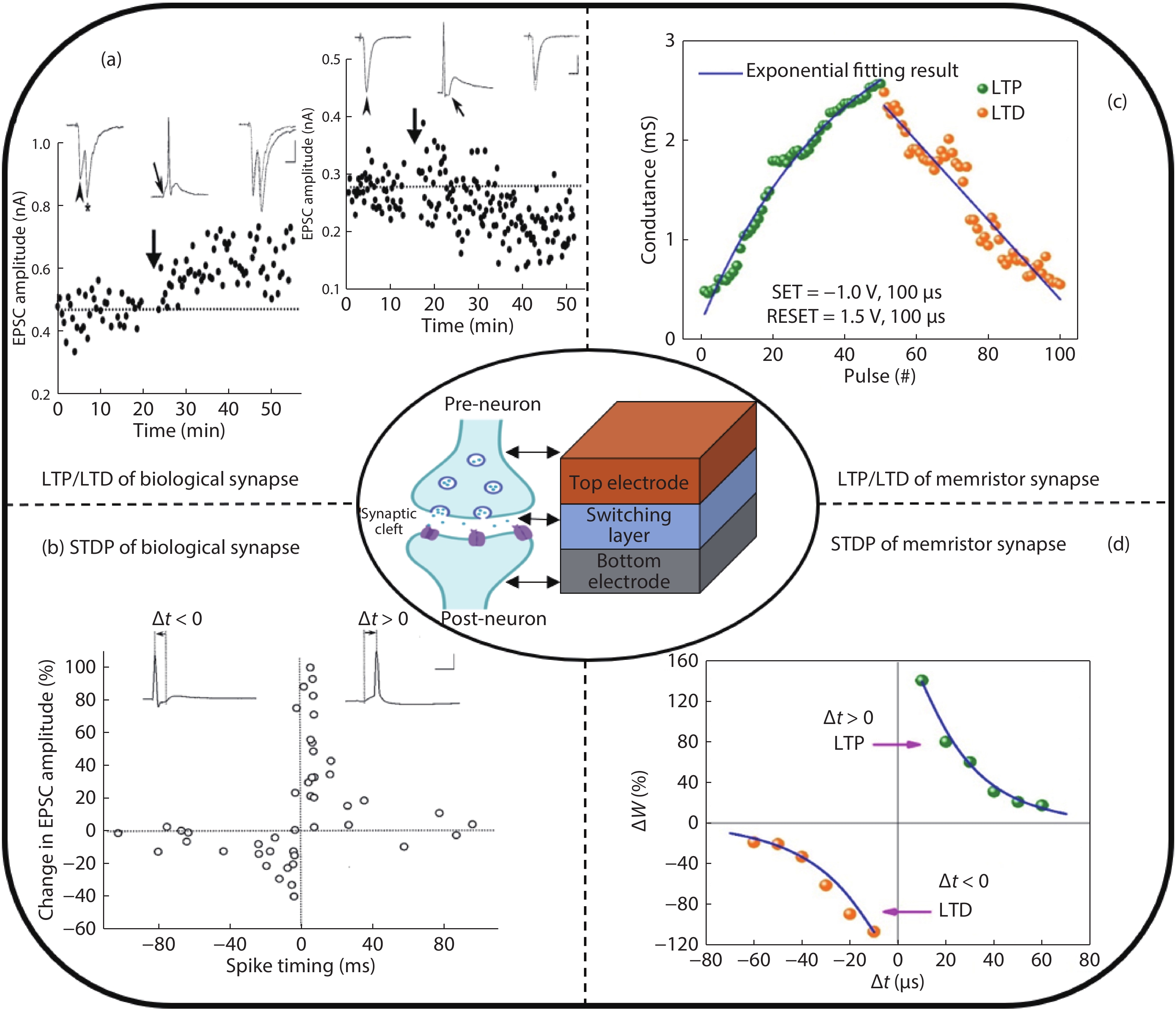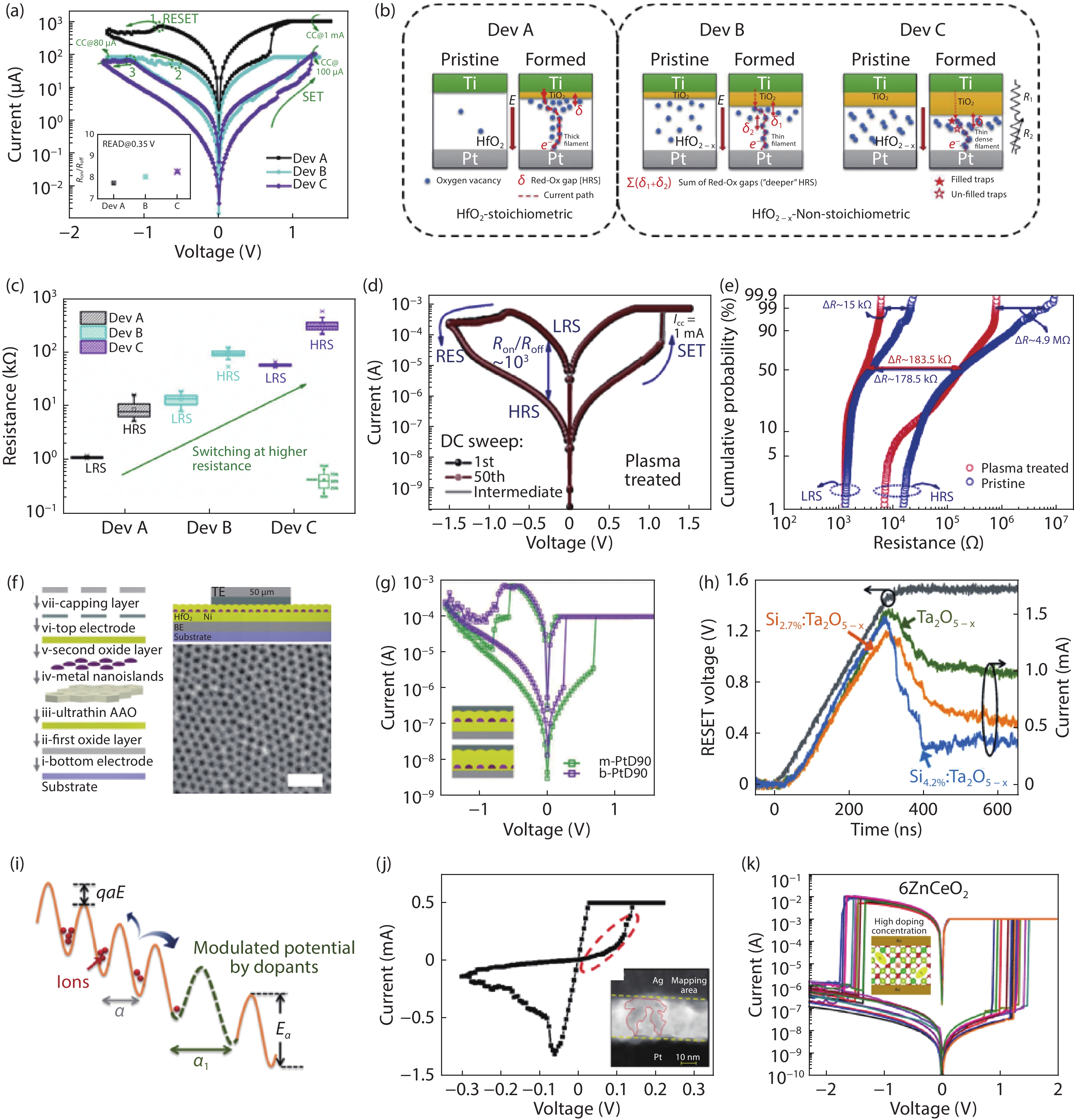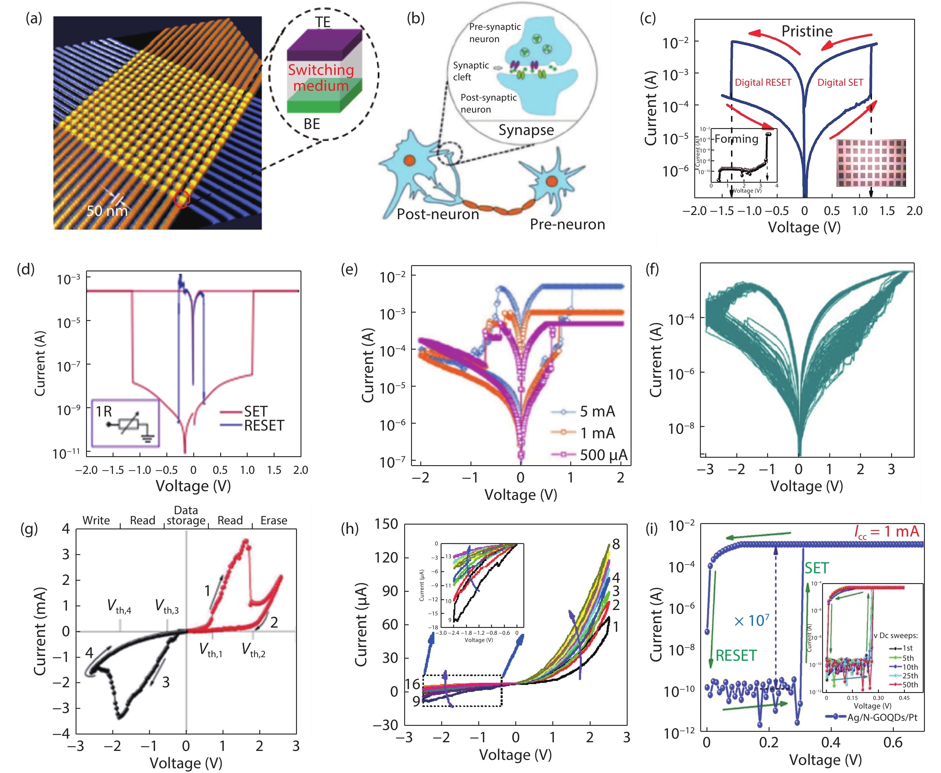 Resistive random-access memory (RRAM), also known as memristors, having a very simple device structure with two terminals, fulfill almost all of the fundamental requirements of volatile memory, nonvolatile memory, and neuromorphic characteristics. Its memory and neuromorphic behaviors are currently being explored in relation to a range of materials, such as biological materials, perovskites, 2D materials, and transition metal oxides. In this review, we discuss the different electrical behaviors exhibited by RRAM devices based on these materials by briefly explaining their corresponding switching mechanisms. We then discuss emergent memory technologies using memristors, together with its potential neuromorphic applications, by elucidating the different material engineering techniques used during device fabrication to improve the memory and neuromorphic performance of devices, in areas such as ION/IOFF ratio, endurance, spike time-dependent plasticity (STDP), and paired-pulse facilitation (PPF), among others. The emulation of essential biological synaptic functions realized in various switching materials, including inorganic metal oxides and new organic materials, as well as diverse device structures such as single-layer and multilayer hetero-structured devices, and crossbar arrays, is analyzed in detail. Finally, we discuss current challenges and future prospects for the development of inorganic and new materials-based memristors.