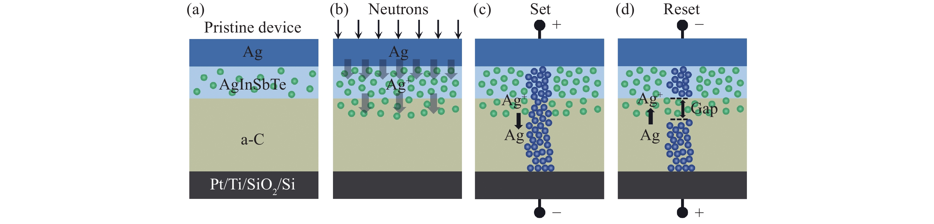 In this work, electrochemical metallization memory (ECM) devices with an Ag/AgInSbTe (AIST)/amorphous carbon (a-C)/Pt structure were irradiated with 14 MeV neutrons. The switching reliability performance before and after neutron irradiation was compared and analyzed in detail. The results show that the irradiated memory cells functioned properly, and the initial resistance, the resistance at the low-resistance state (LRS), the RESET voltage and the data retention performance showed little degradation even when the total neutron fluence was as high as 2.5 × 1011 n/cm2. Other switching characteristics such as the forming voltage, the resistance at the high-resistance state (HRS), and the SET voltage were also studied, all of which merely showed a slight parameter drift. Irradiation-induced Ag ions doping of the a-C layer is proposed to explain the damaging effects of neutron irradiation. The excellent hard characteristics of these Ag/AIST/a-C/Pt-based ECM devices suggest potential beneficial applications in the aerospace and nuclear industries.
