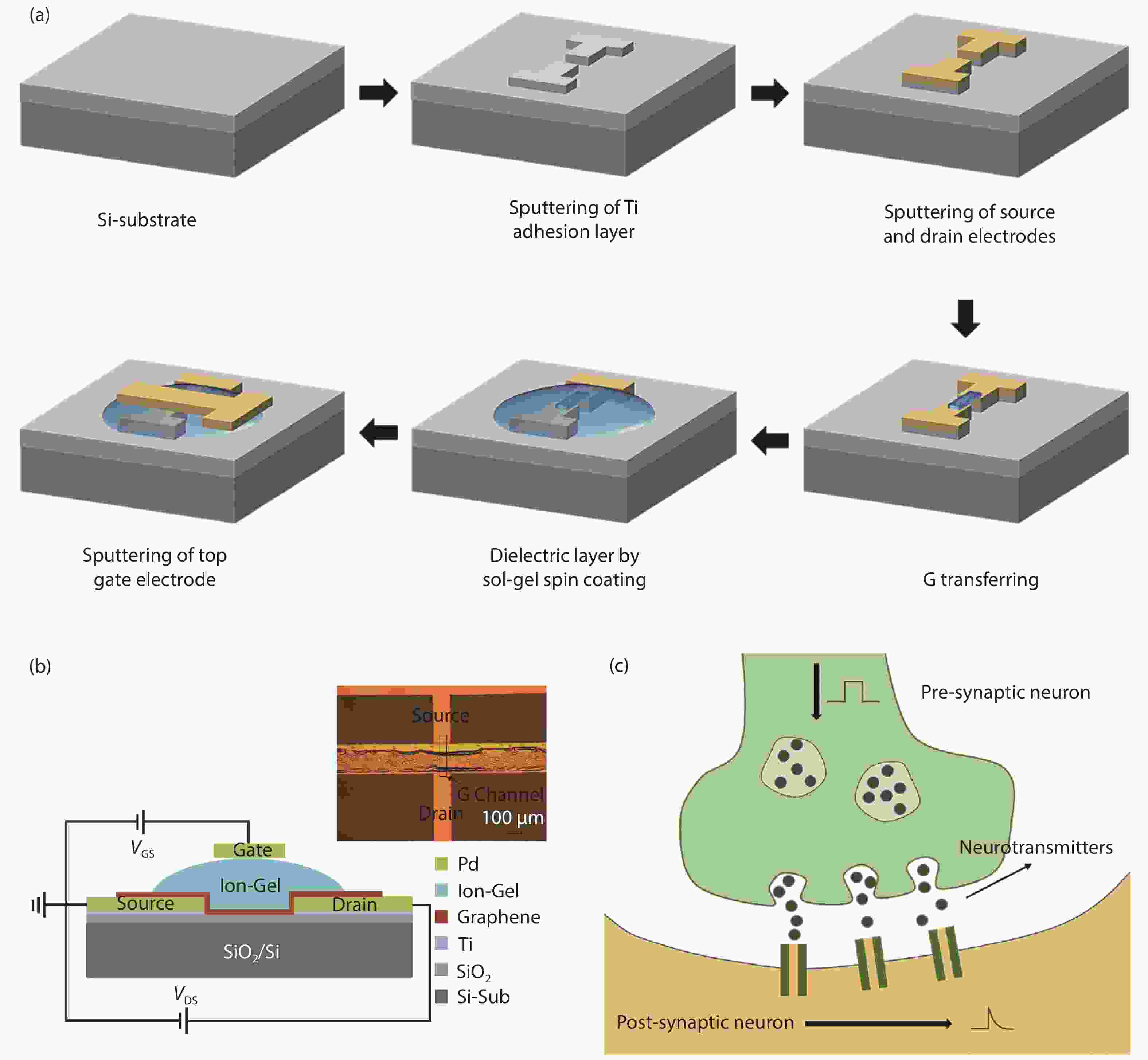 Multi-terminal electric-double-layer transistors have recently attracted extensive interest in terms of mimicking synaptic and neural functions. In this work, an Ion-Gel gated graphene synaptic transistor was proposed to mimic the essential synaptic behaviors by exploiting the bipolar property of graphene and the ionic conductivity of Ion-Gel. The Ion-Gel dielectrics were deposited onto the graphene film by the spin coating process. We consider the top gate and graphene channel as a presynaptic and postsynaptic terminal, respectively. Basic synaptic functions were successfully mimicked, including the excitatory postsynaptic current (EPSC), the effect of spike amplitude and duration on EPSC, and paired-pulse facilitation (PPF). This work may facilitate the application of graphene synaptic transistors in flexible electronics.