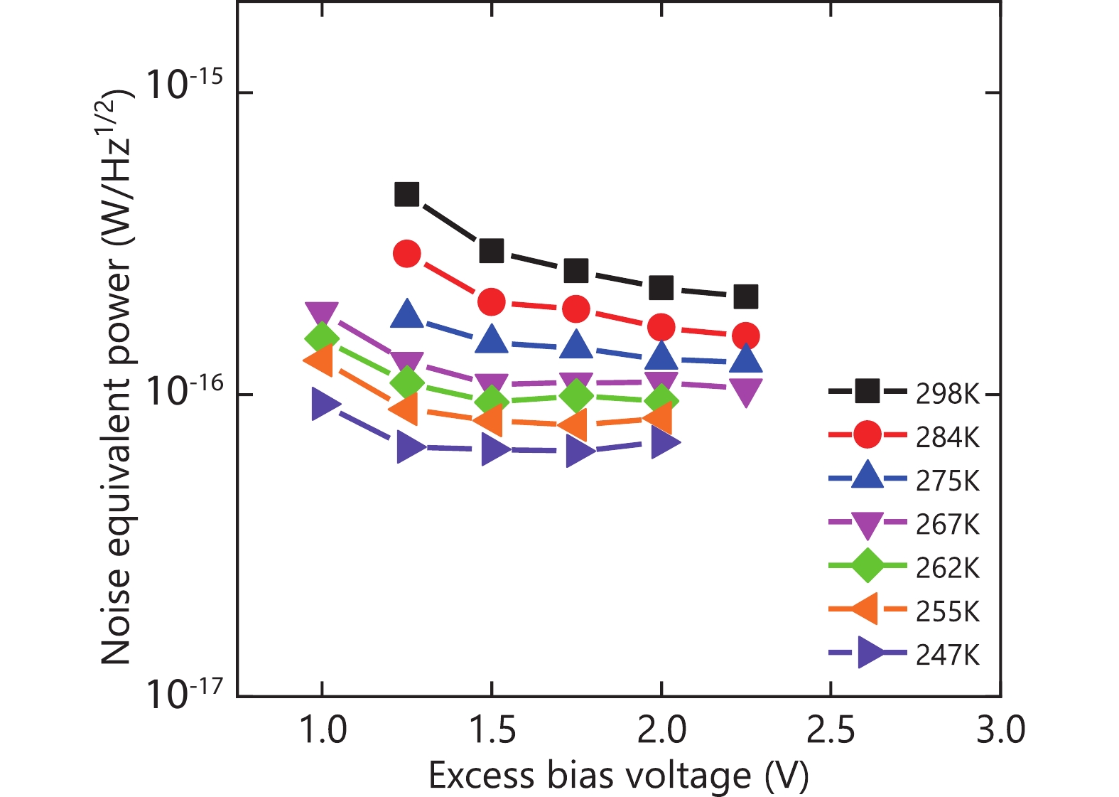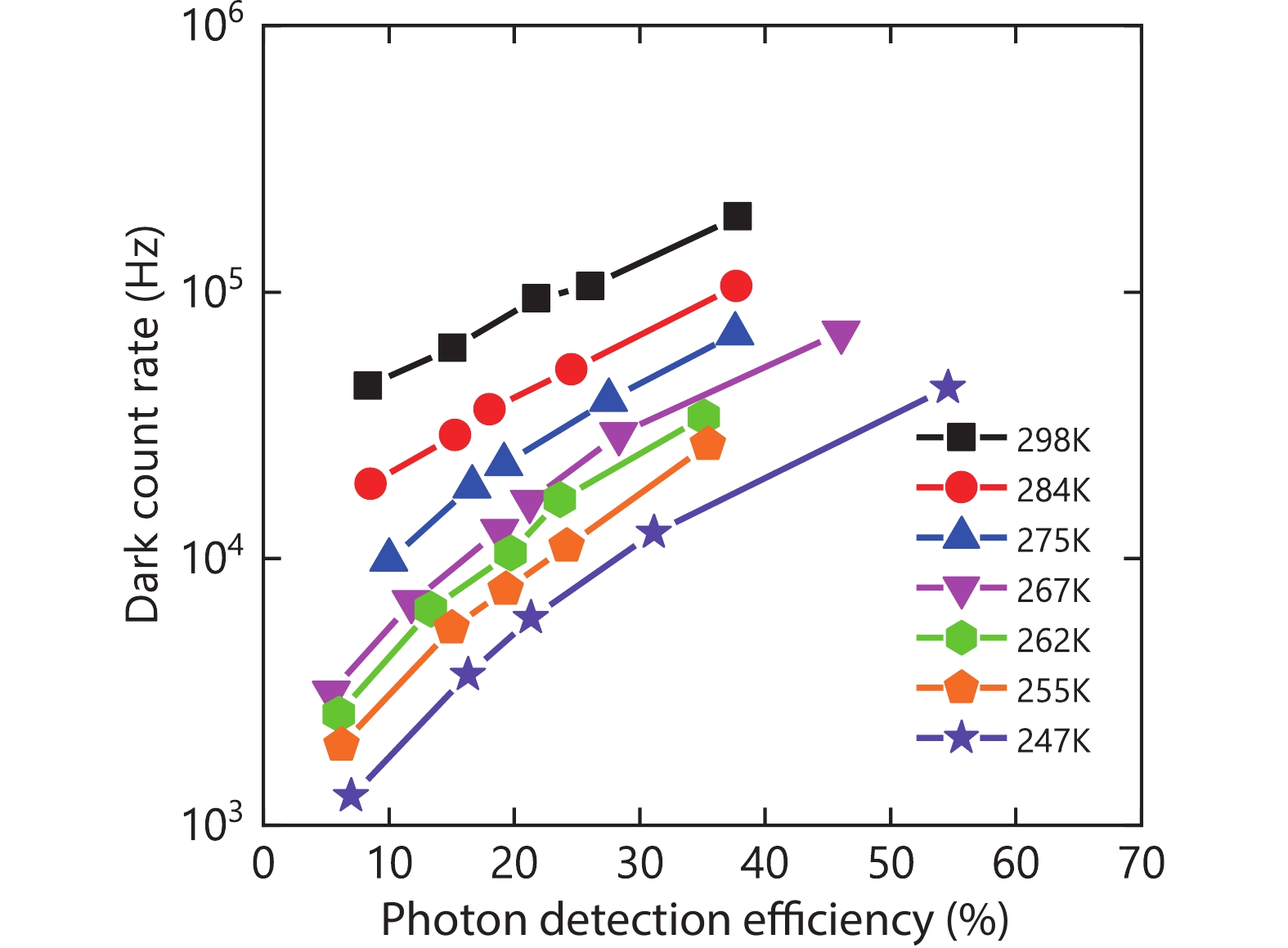Planar semiconductor InGaAs/InP single photon avalanche diodes with high responsivity and low dark count rate are preferred single photon detectors in near-infrared communication. However, even with well-designed structures and well-controlled operational conditions, the performance of InGaAs/InP SPADs is limited by the inherent characteristics of avalanche process and the growth quality of InGaAs/InP materials. It is difficult to ensure high detection efficiency while the dark count rate is controlled within a certain range at present. In this paper, we fabricated a device with a thick InGaAs absorption region and an anti-reflection layer. The quantum efficiency of this device reaches 83.2%. We characterized the single-photon performance of the device by a quenching circuit consisting of parallel-balanced InGaAs/InP single photon detectors and single-period sinusoidal pulse gating. The spike pulse caused by the capacitance effect of the device is eliminated by using the characteristics of parallel balanced common mode signal elimination, and the detection of small avalanche pulse amplitude signal is realized. The maximum detection efficiency is 55.4% with a dark count rate of 43.8 kHz and a noise equivalent power of 6.96 × 10?17 W/Hz1/2 at 247 K. Compared with other reported detectors, this SPAD exhibits higher SPDE and lower noise-equivalent power at a higher cooling temperature.