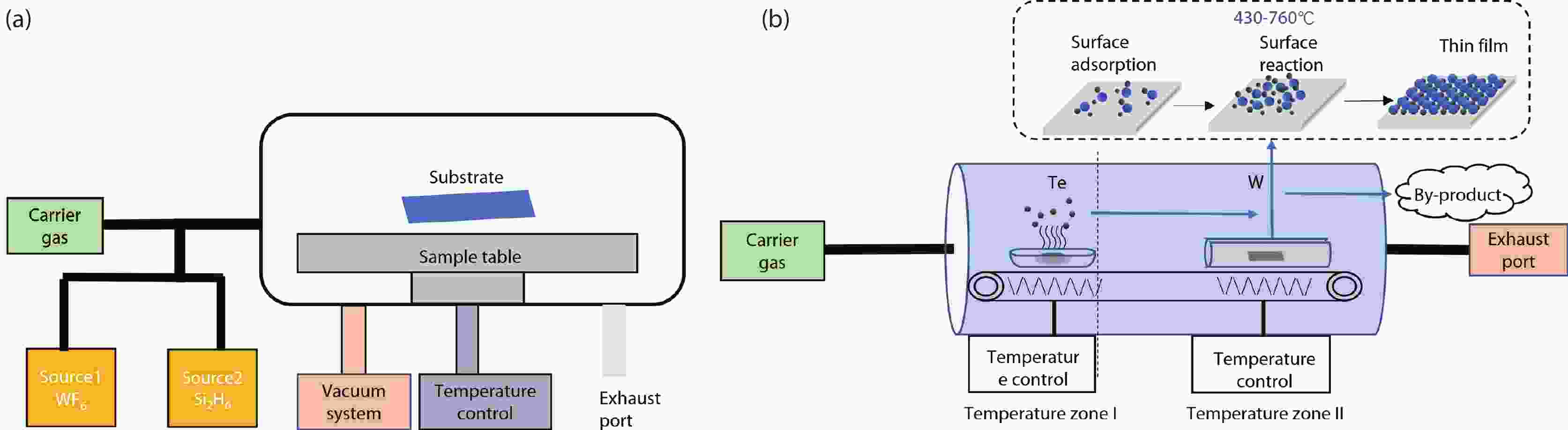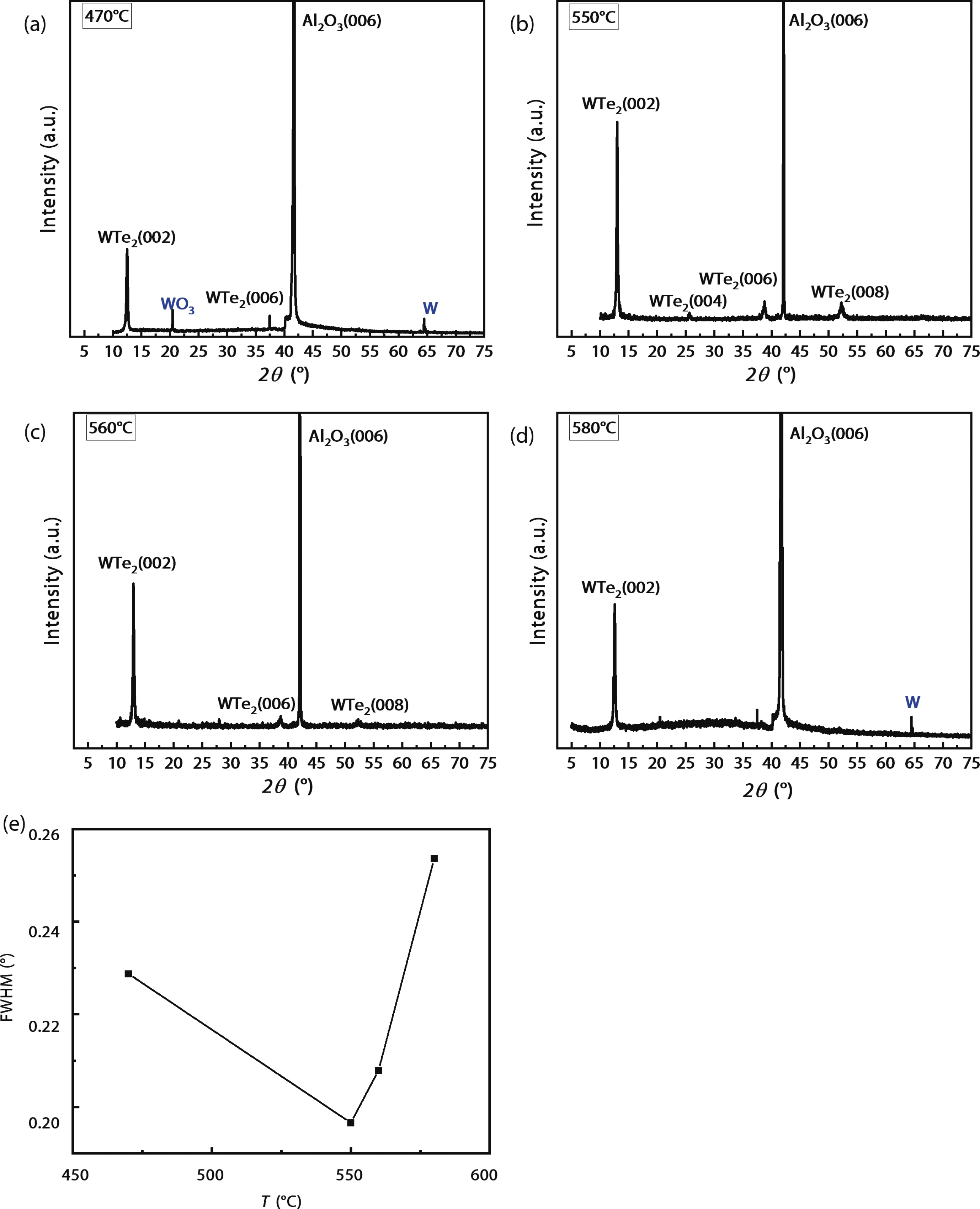 Tungsten telluride thin films were successfully prepared on monocrystal sapphire substrates by using atomic layer deposition and chemical vapor deposition technology, and the effects of different tellurization temperatures on the properties of tungsten telluride films were investigated. The growth rate, crystal structure and composition of the film samples were characterized and analyzed by using scanning electron microscope, Raman spectroscopy and X-ray photoelectron spectroscopy. The results showed that tungsten telluride thin films with good crystal orientation in (001) were obtained at telluride temperature of 550 °C. When the telluride temperature reached 570 °C, the tungsten telluride began to decompose and unsaturated magnetoresistance was found.