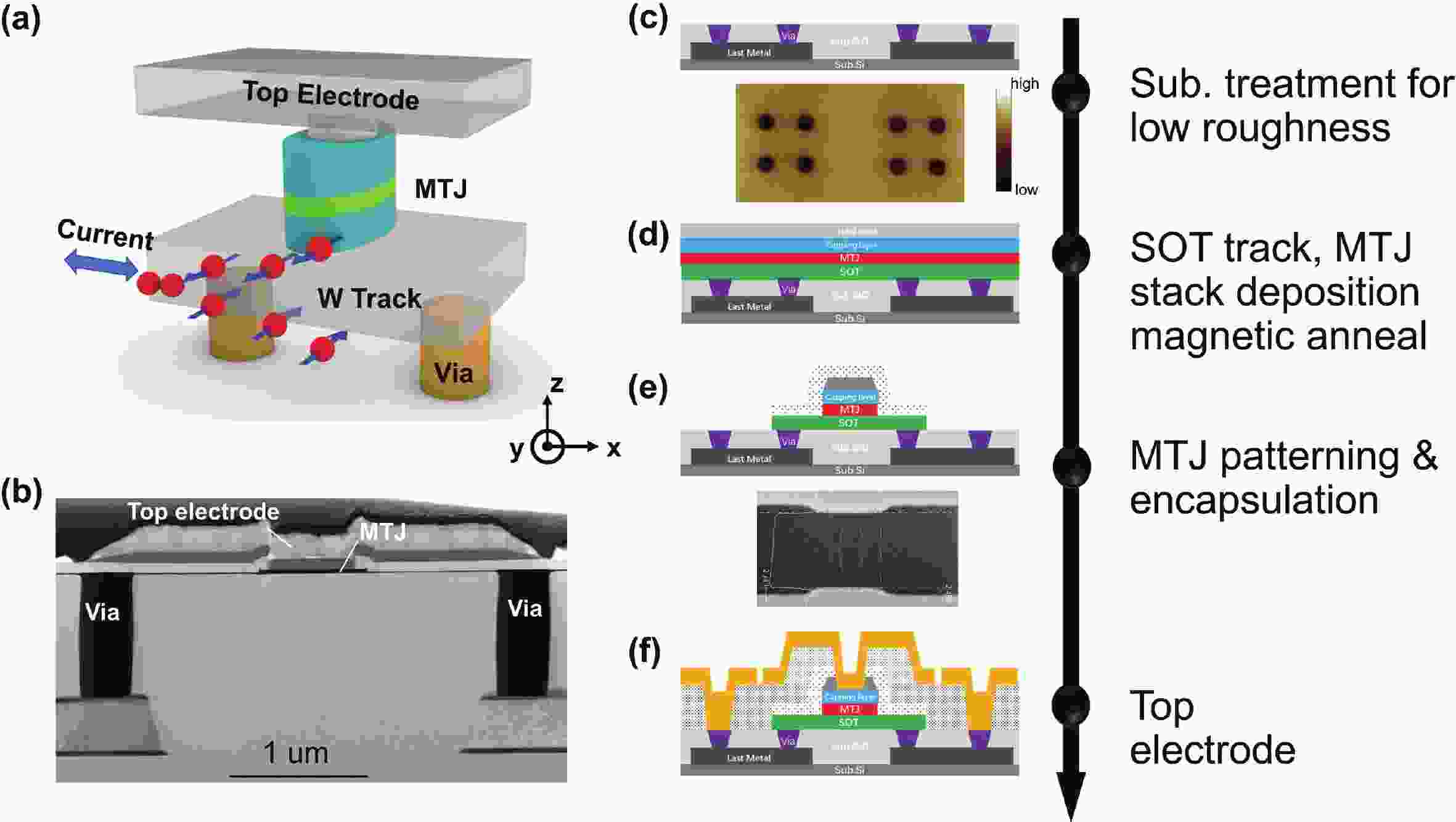 We demonstrate in-plane field-free-switching spin-orbit torque (SOT) magnetic tunnel junction (MTJ) devices that are capable of low switching current density, fast speed, high reliability, and, most importantly, manufactured uniformly by the 200-mm-wafer platform. The performance of the devices is systematically studied, including their magnetic properties, switching behaviors, endurance and data retention. The successful integration of SOT devices within the 200-mm-wafer manufacturing platform provides a feasible way to industrialize SOT MRAMs. It is expected to obtain excellent performance of the devices by further optimizing the MTJ film stacks and the corresponding fabrication processes in the future.