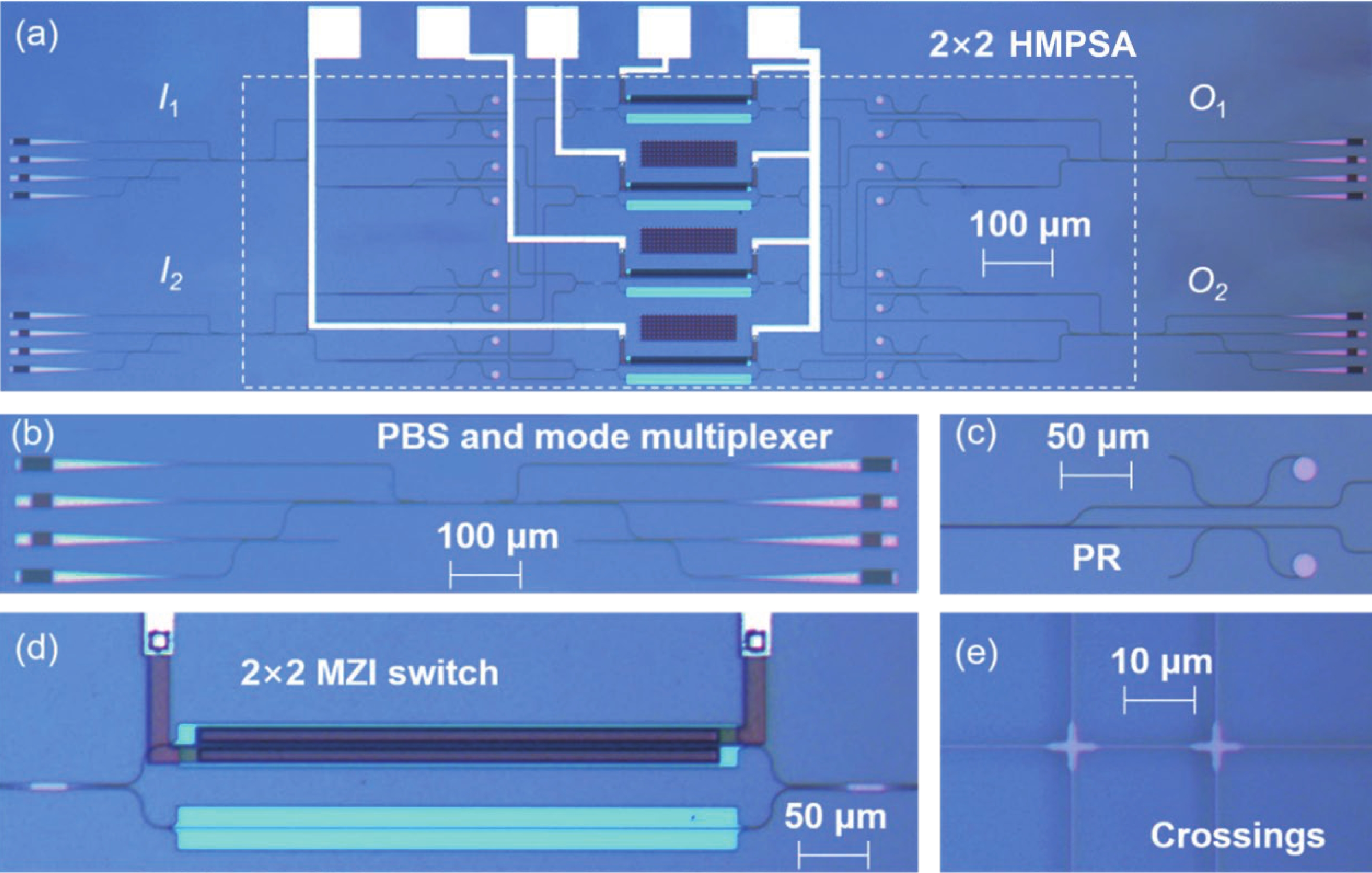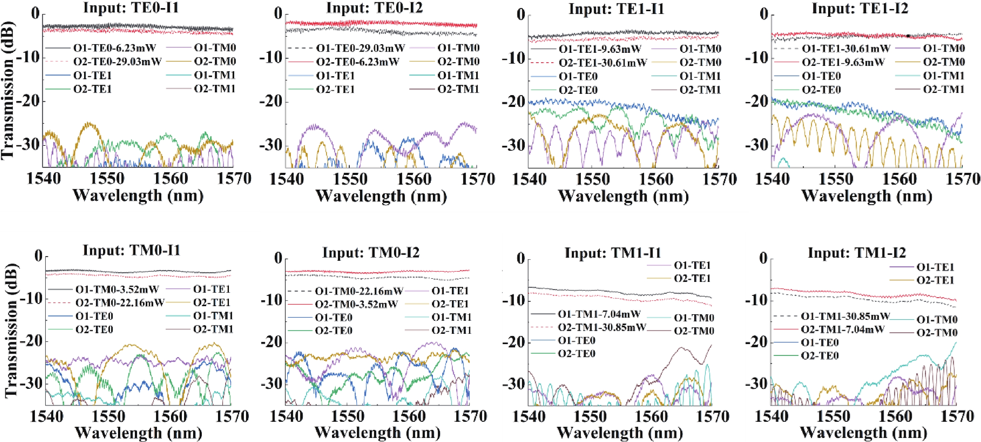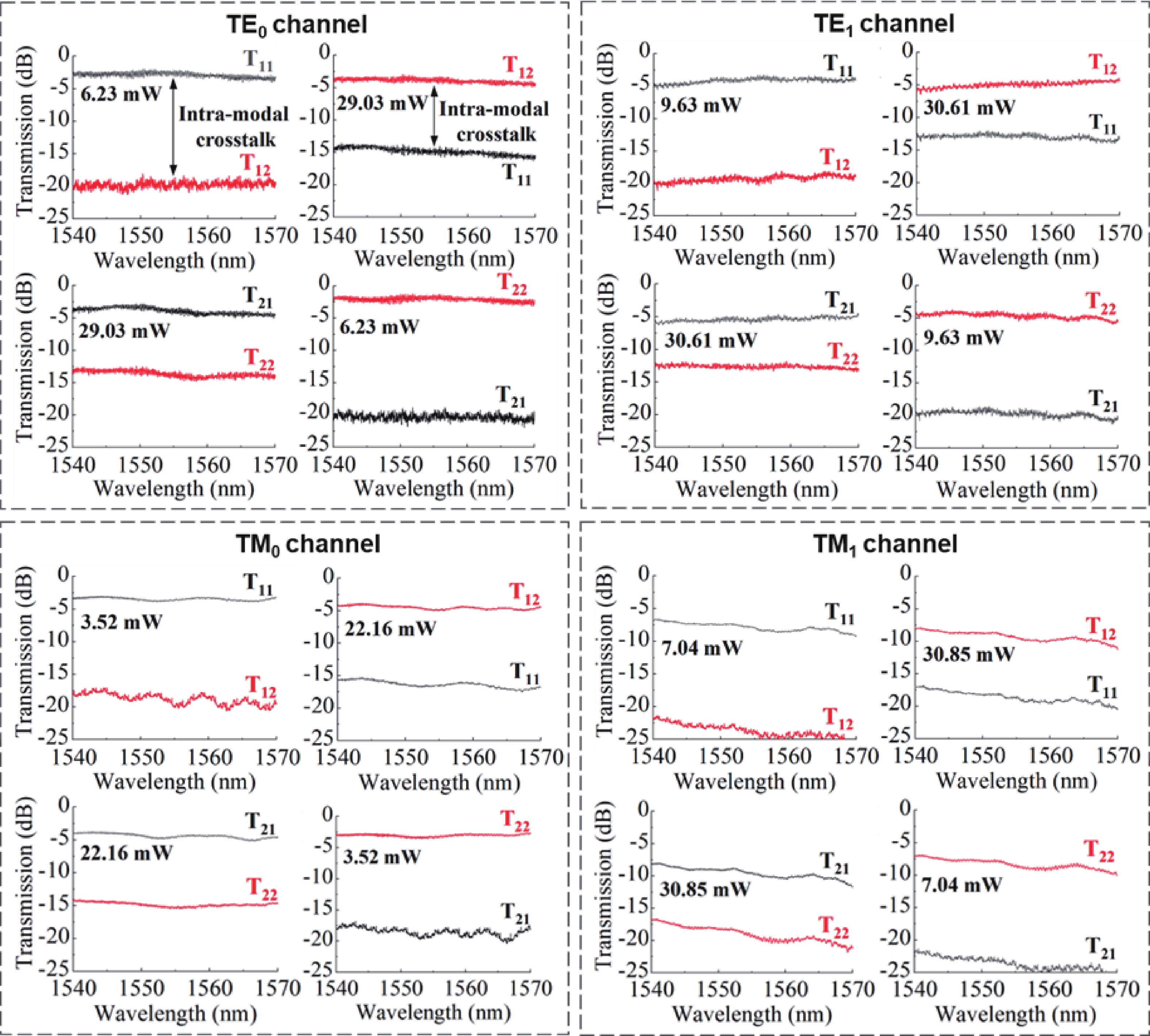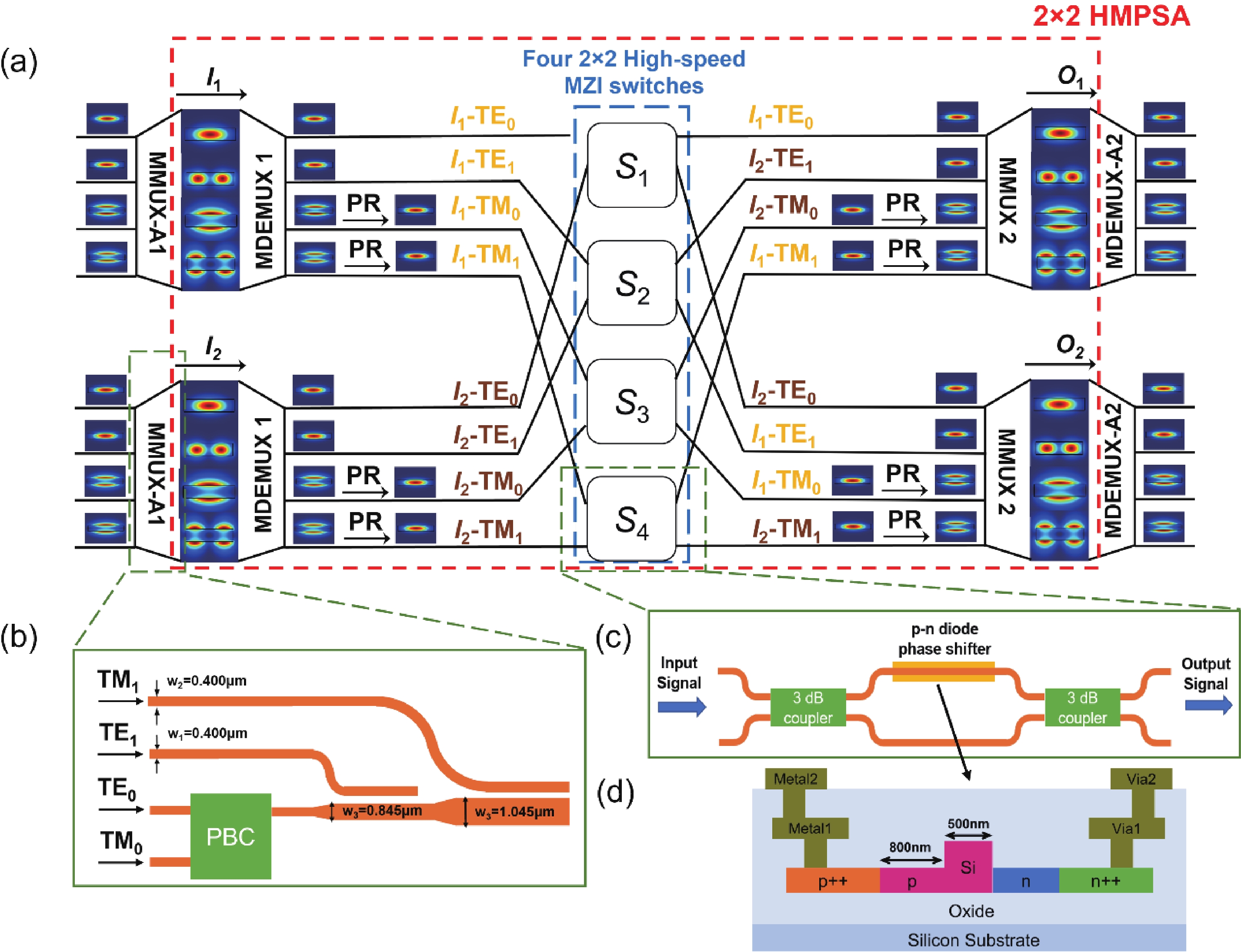 On-chip optical communications are growingly aiming at multimode operation together with mode-division multiplexing to further increase the transmission capacity. Optical switches, which are capable of optical signals switching at the nodes, play a key role in optical networks. We demonstrate a 2 × 2 electro-optic Mach–Zehnder interferometer-based mode- and polarization-selective switch fabricated by standard complementary metal–oxide–semiconductor process. An electro optic tuner based on a PN-doped junction in one of the Mach–Zehnder interferometer arms enables dynamic switching in 11 ns. For all the channels, the overall insertion losses and inter-modal crosstalk values are below 9.03 and –15.86 dB at 1550 nm, respectively.