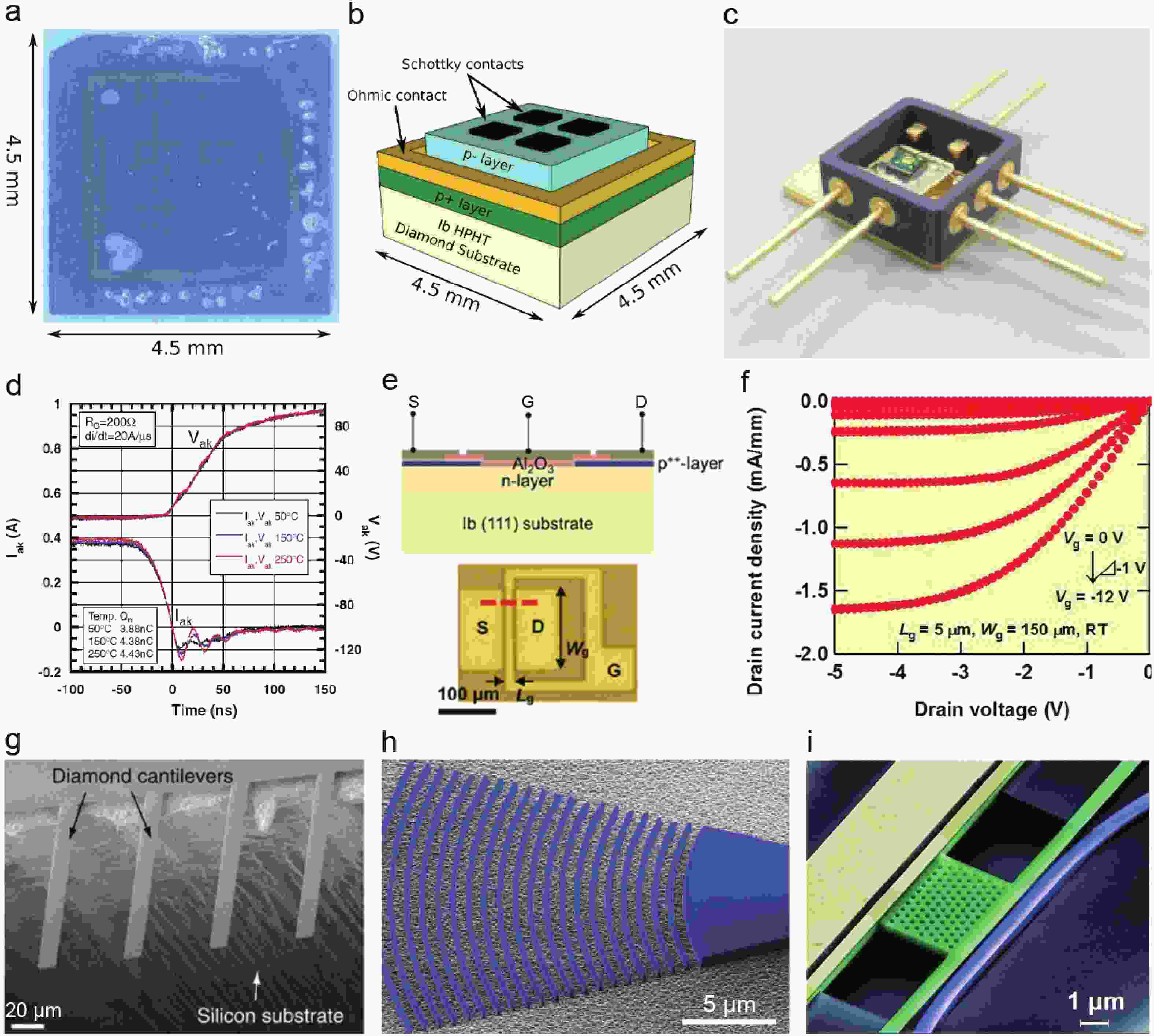 Diamond, as an ultra-wide bandgap semiconductor, has become a promising candidate for next-generation microelectronics and optoelectronics due to its numerous advantages over conventional semiconductors, including ultrahigh carrier mobility and thermal conductivity, low thermal expansion coefficient, and ultra-high breakdown voltage, etc. Despite these extraordinary properties, diamond also faces various challenges before being practically used in the semiconductor industry. This review begins with a brief summary of previous efforts to model and construct diamond-based high-voltage switching diodes, high-power/high-frequency field-effect transistors, MEMS/NEMS, and devices operating at high temperatures. Following that, we will discuss recent developments to address scalable diamond device applications, emphasizing the synthesis of large-area, high-quality CVD diamond films and difficulties in diamond doping. Lastly, we show potential solutions to modulate diamond’s electronic properties by the “elastic strain engineering” strategy, which sheds light on the future development of diamond-based electronics, photonics and quantum systems.