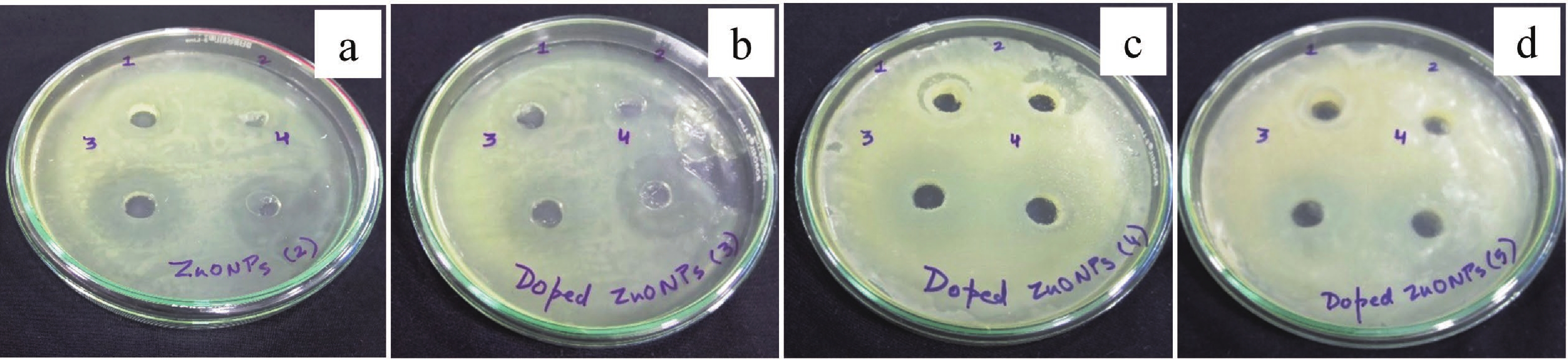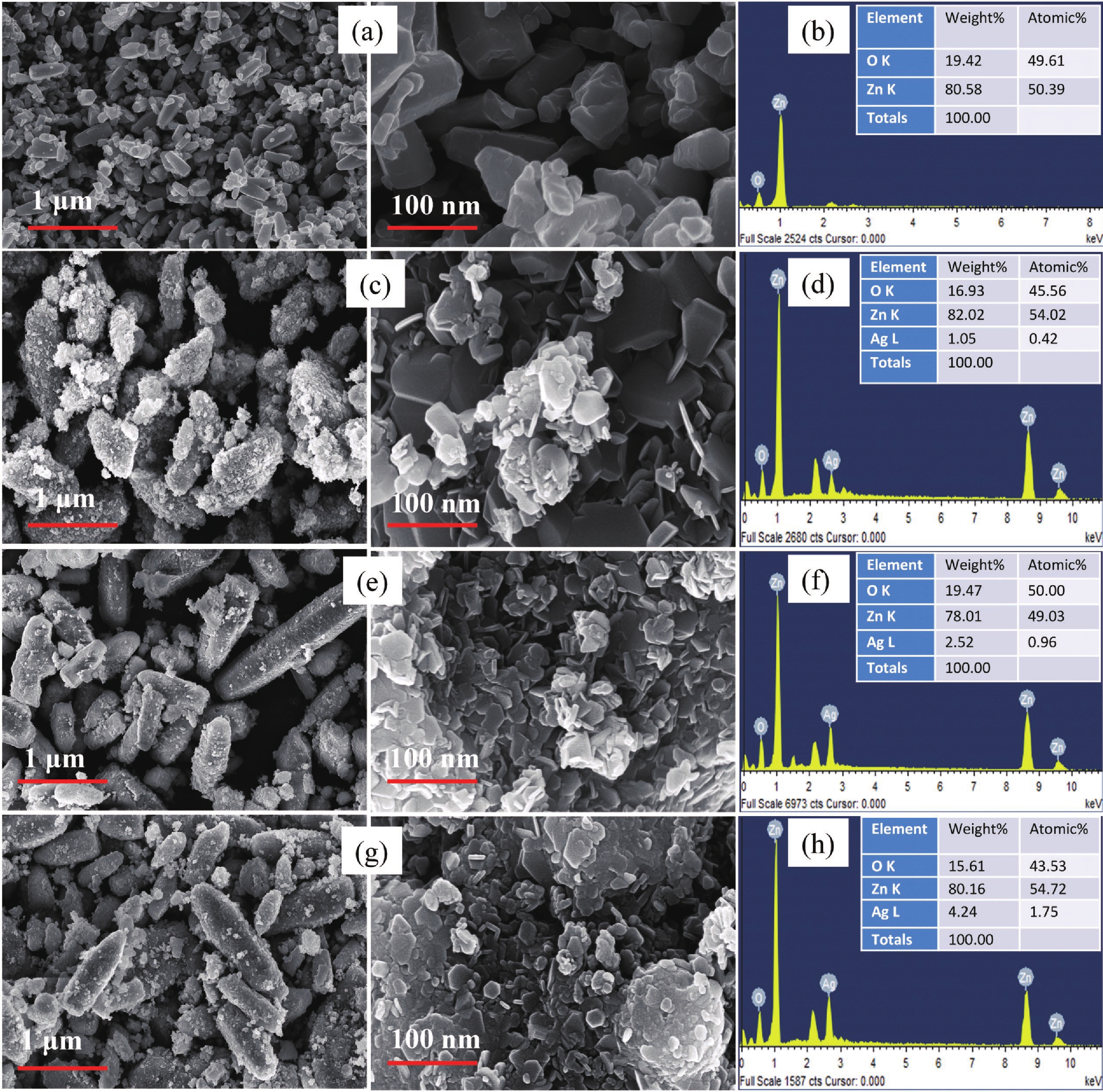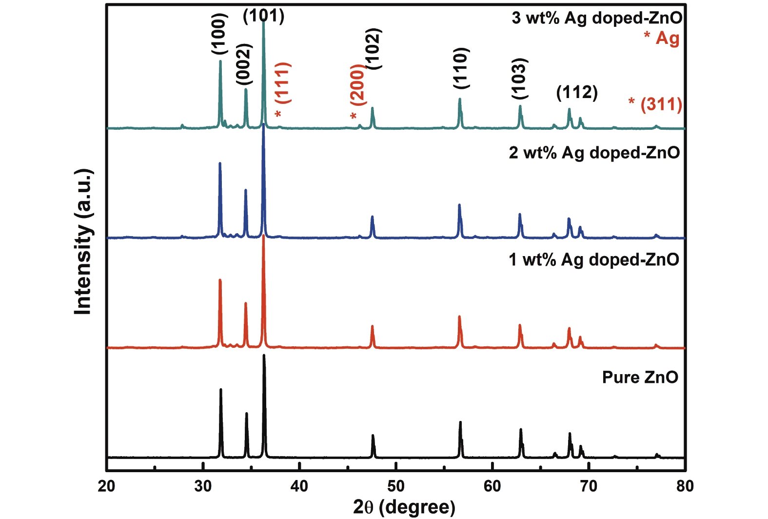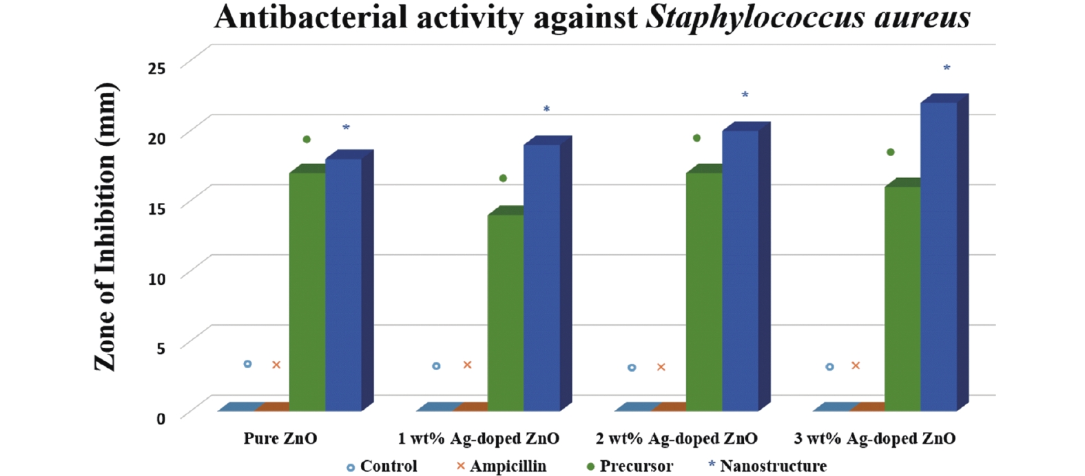 In the present work, zinc oxide (ZnO) and silver (Ag) doped ZnO nanostructures are synthesized using a hydrothermal method. Structural quality of the products is attested using X-ray diffraction, which confirms the hexagonal wurtzite structure of pure ZnO and Ag-doped ZnO nanostructures. XRD further confirms the crystallite orientation along the c-axis, (101) plane. The field emission scanning electron microscope study reveals the change in shape of the synthesized ZnO particles from hexagonal nanoparticles to needle-shaped nanostructures for 3 wt% Ag-doped ZnO. The optical band gaps and lattice strain of nanostructures is increased significantly with the increase of doping concentration of Ag in ZnO nanostructure. The antimicrobial activity of synthesized nanostructures has been evaluated against the gram-positive human pathogenic bacteria, Staphylococcus aureus via an agarose gel diffusion test. The maximum value of zone of inhibition (22 mm) is achieved for 3 wt% Ag-doped ZnO nanostructure and it clearly demonstrates the remarkable antibacterial activity.