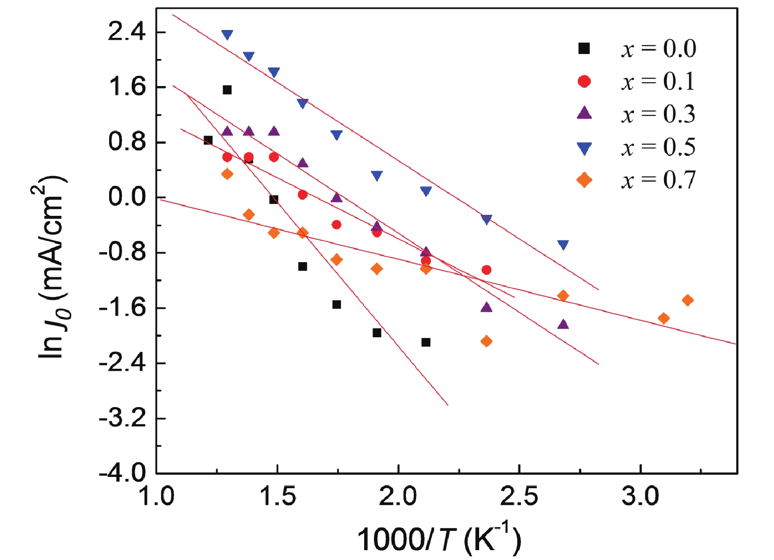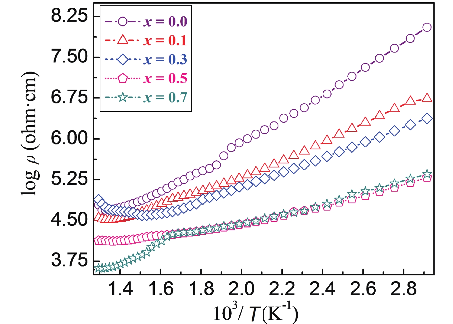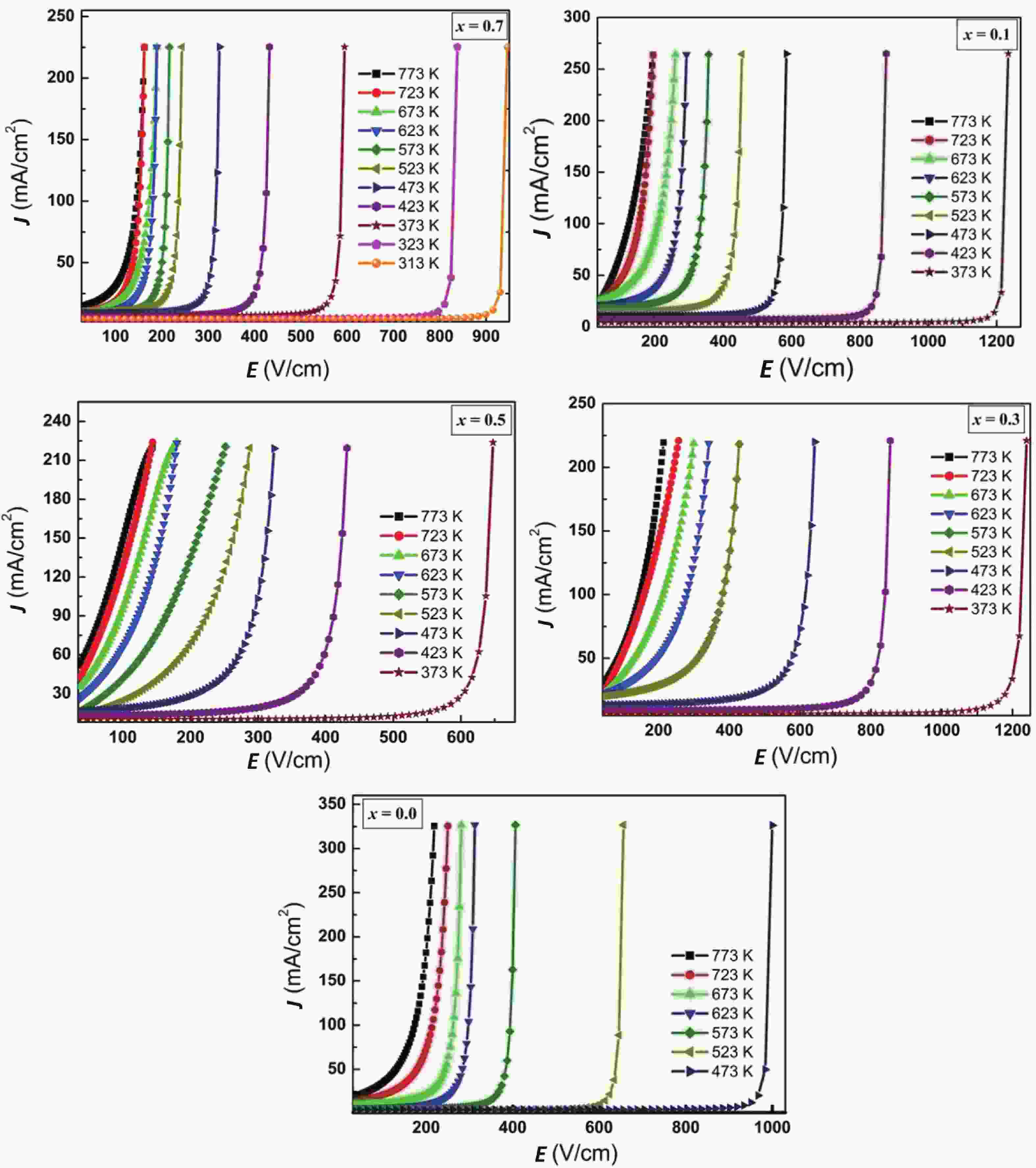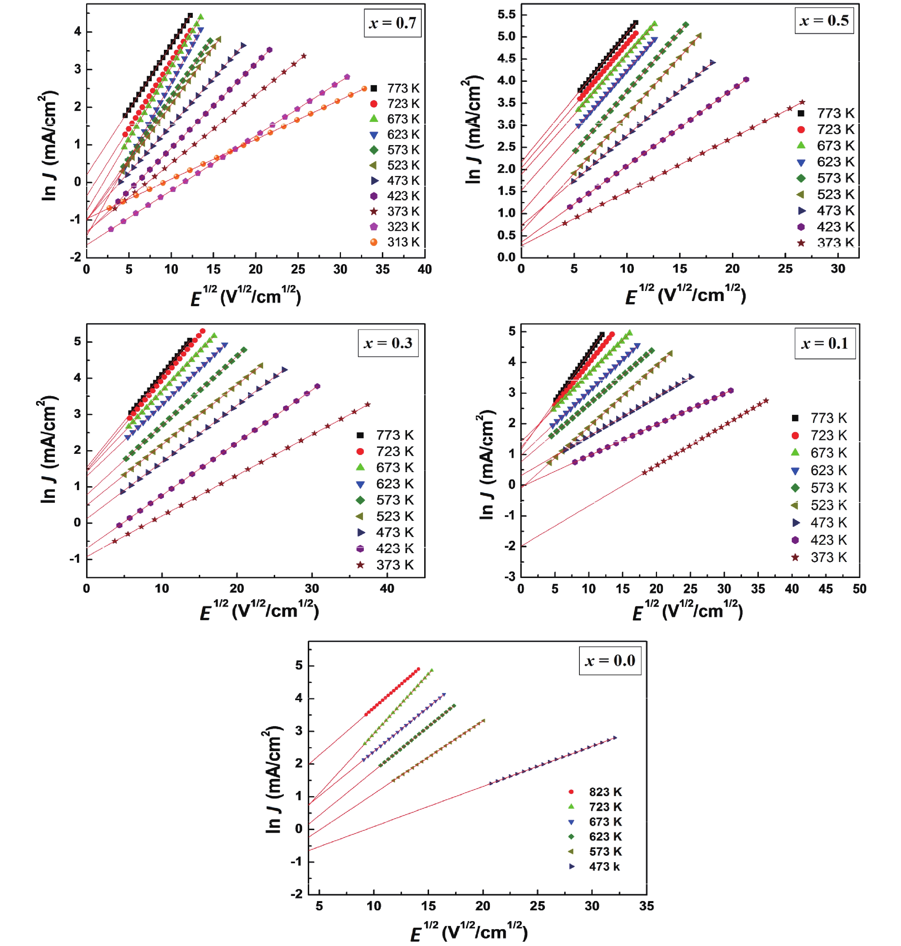 The electrical properties of cubic perovskite series, CaCu3–xTi4–xFe2xO12 with x = 0.0, 0.1, 0.3, 0.5, and 0.7, have been studied by employing current density as a function of electric field characteristics registered at different temperatures and thermal variations of direct current electrical resistivity measurements. All of the compositions exhibit strong non-ohmic behavior. The concentration dependence of breakdown field, the temperature at which switching action takes place, and maximum value of current density (Jmax) has been explained on account of structural, microstructural, and positron lifetime parameters. The highest ever reported value of Jmax = 327 mA/cm2 has been observed for pristine composition. The values of the nonlinear coefficient advise the suitability of ceramics for low-voltage varistor applications. The Arrhenius plots show typical semiconducting nature. The activation energy values indicate that electric conduction proceeds through electrons with deformation in the system.