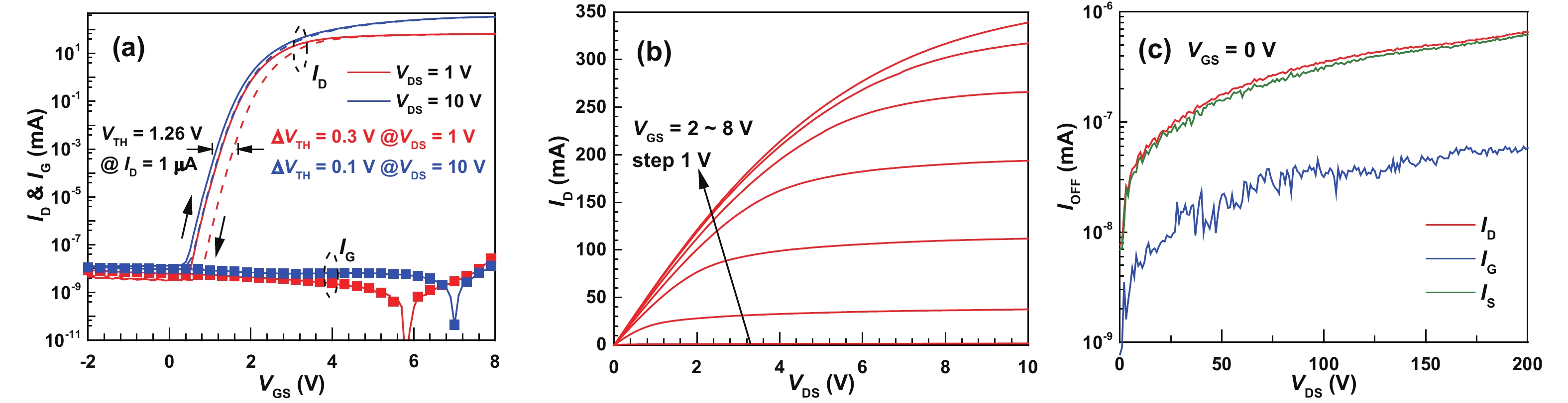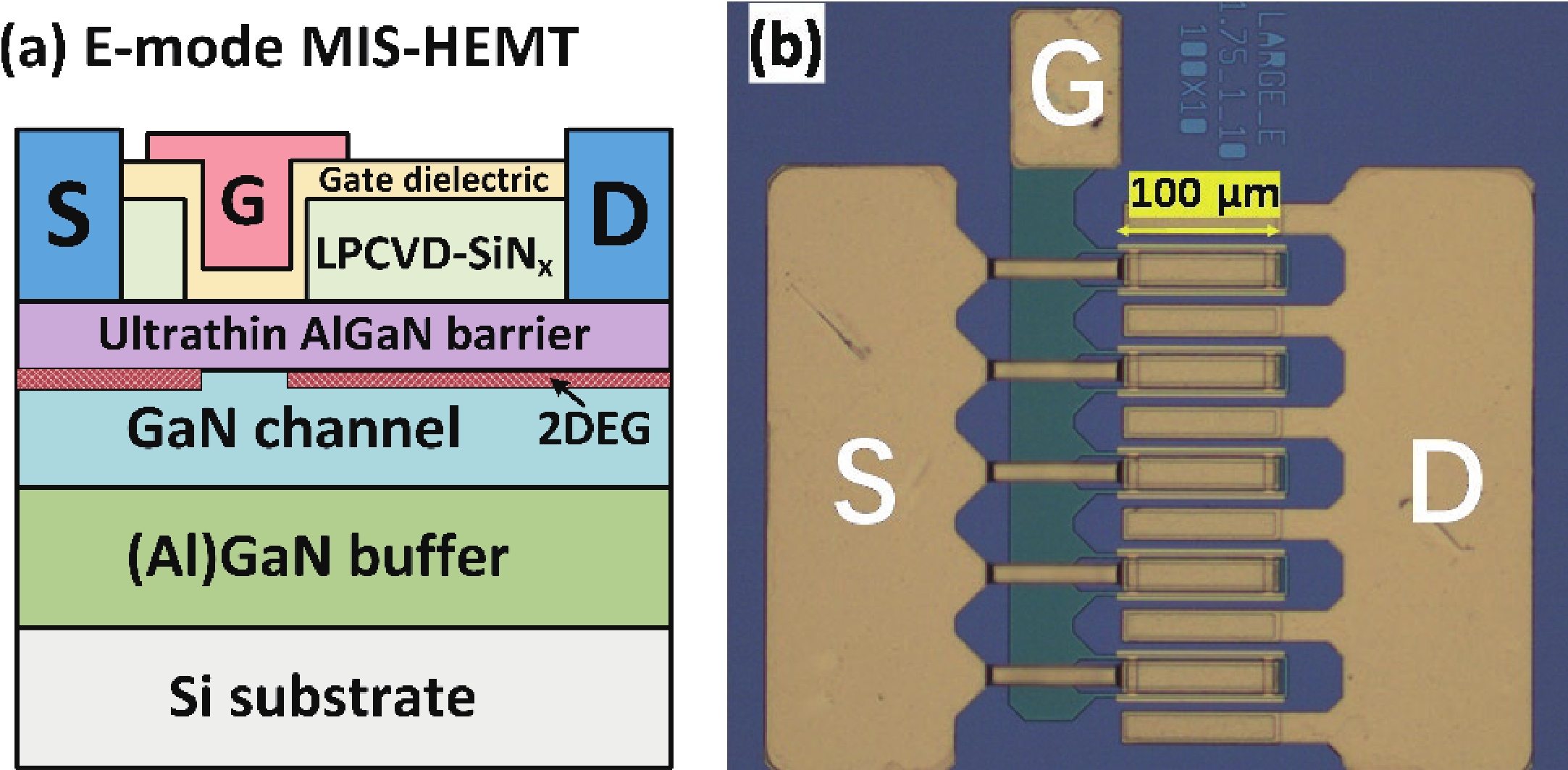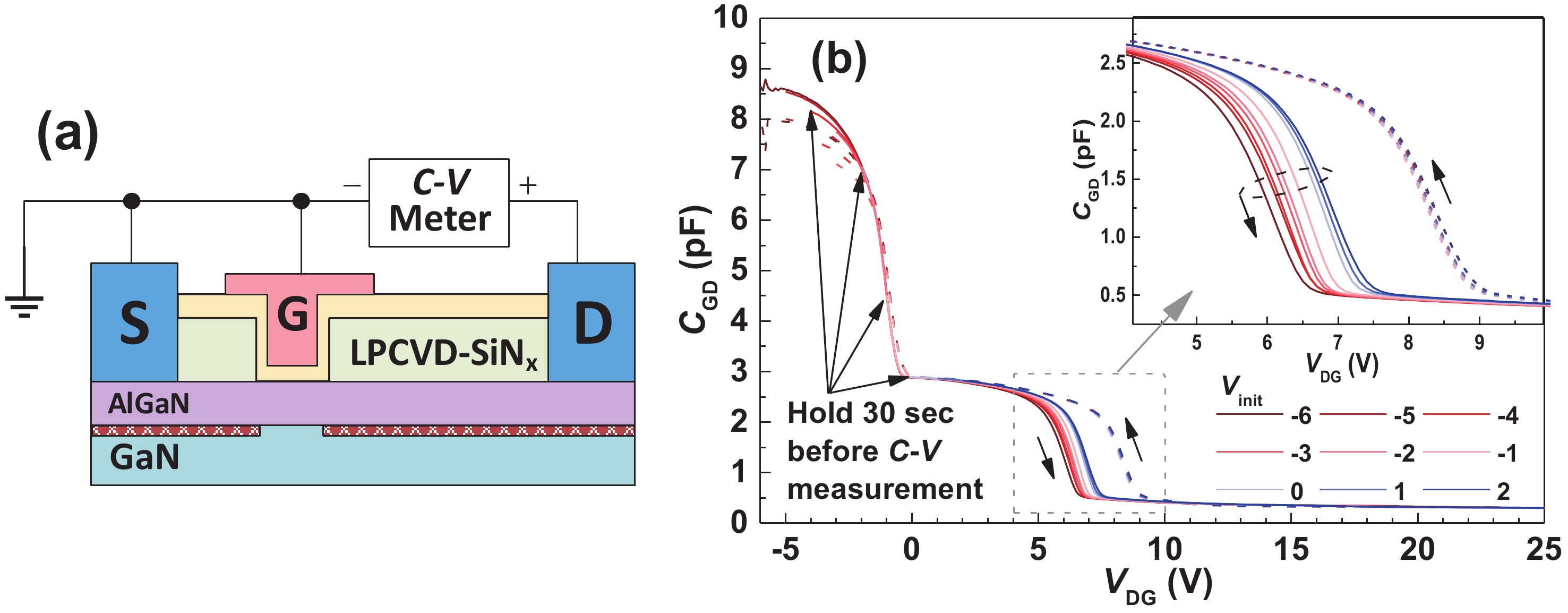 Parasitic capacitances associated with overhangs of the T-shape-gate enhancement-mode (E-mode) GaN-based power device, were investigated by frequency/voltage-dependent capacitance–voltage and inductive-load switching measurements. The overhang capacitances induce a pinch-off voltage distinguished from that of the E-mode channel capacitance in the gate capacitance and the gate–drain capacitance characteristic curves. Frequency- and voltage-dependent tests confirm the instability caused by the trapping of interface/bulk states in the LPCVD-SiNx passivation dielectric. Circuit-level double pulse measurement also reveals its impact on switching transition for power switching applications.