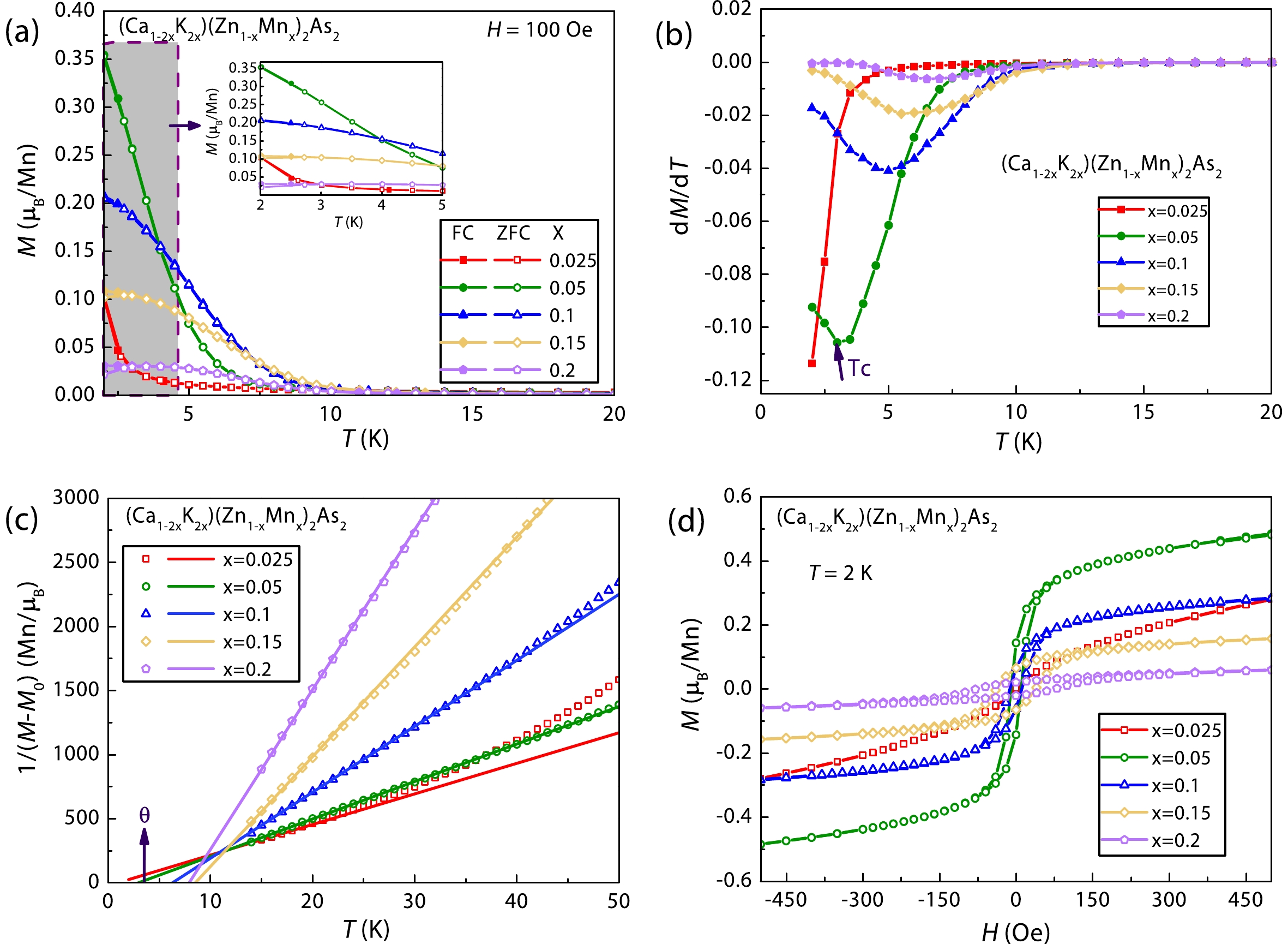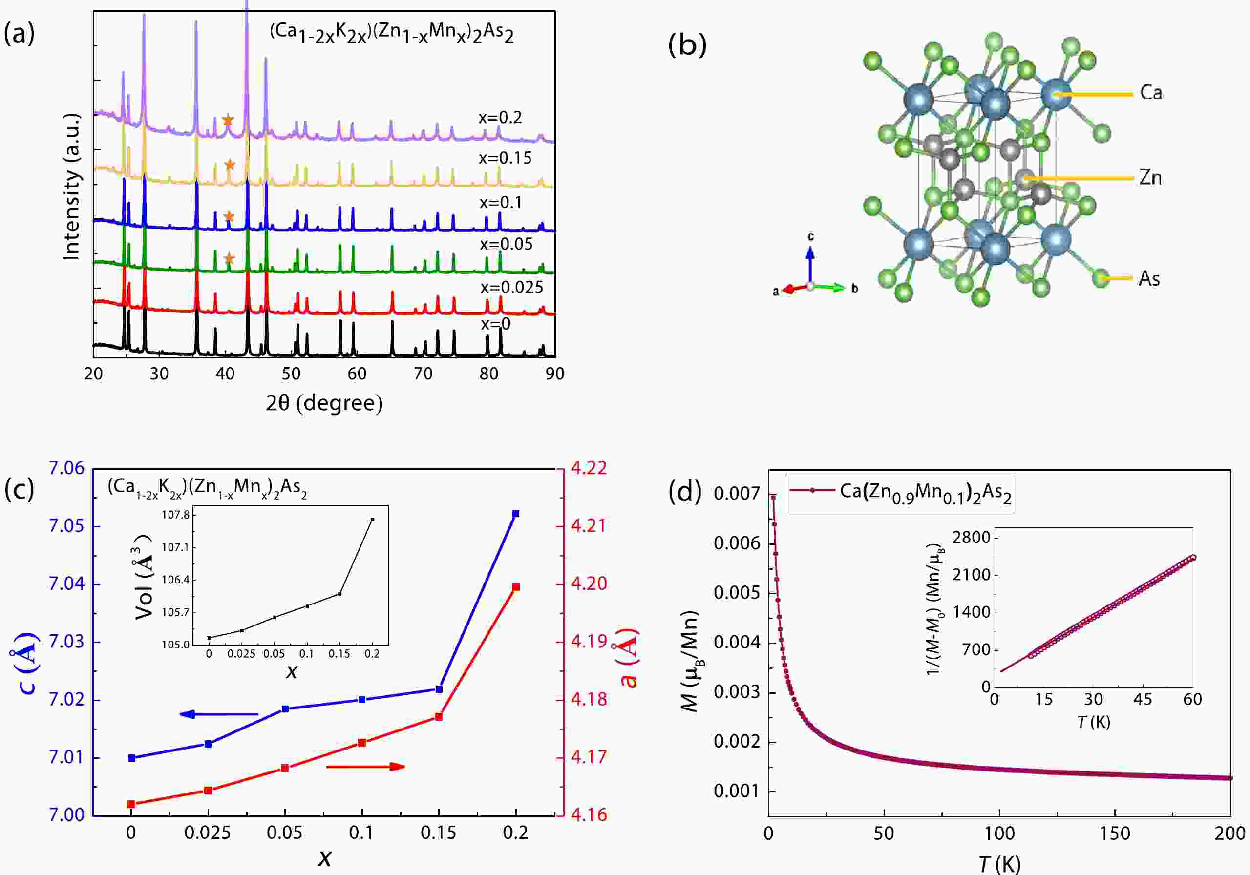 We have successfully synthesized a novel diluted magnetic semiconductor (Ca1?2xK2x)(Zn1?xMnx)2As2 with decoupled charge and spin doping. The substitutions of (Ca2+, K+) and (Zn2+, Mn2+) in the parent compound CaZn2As2 (space group P