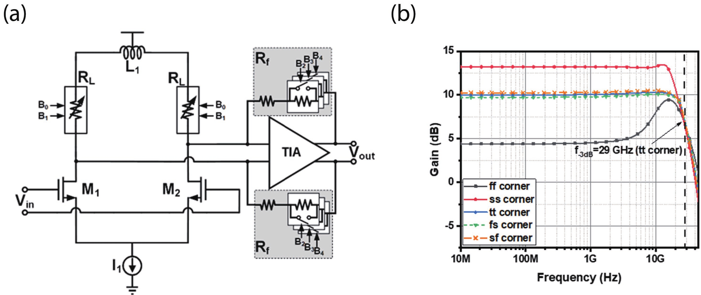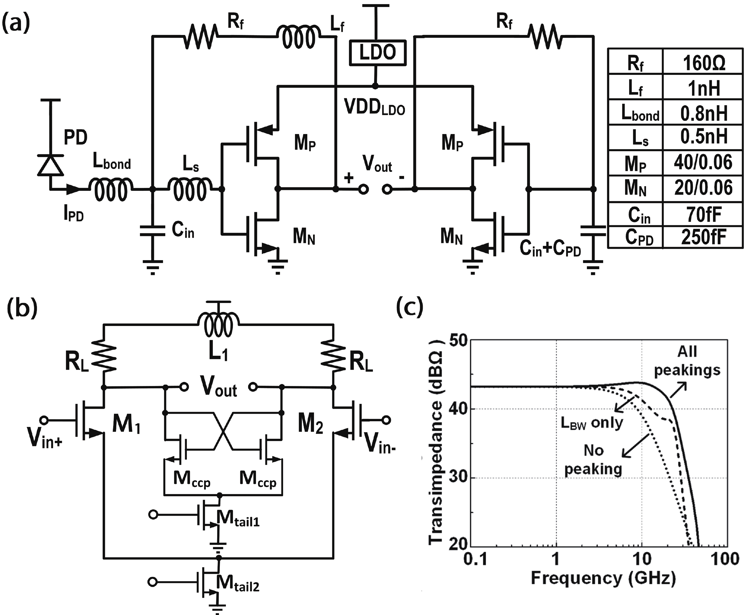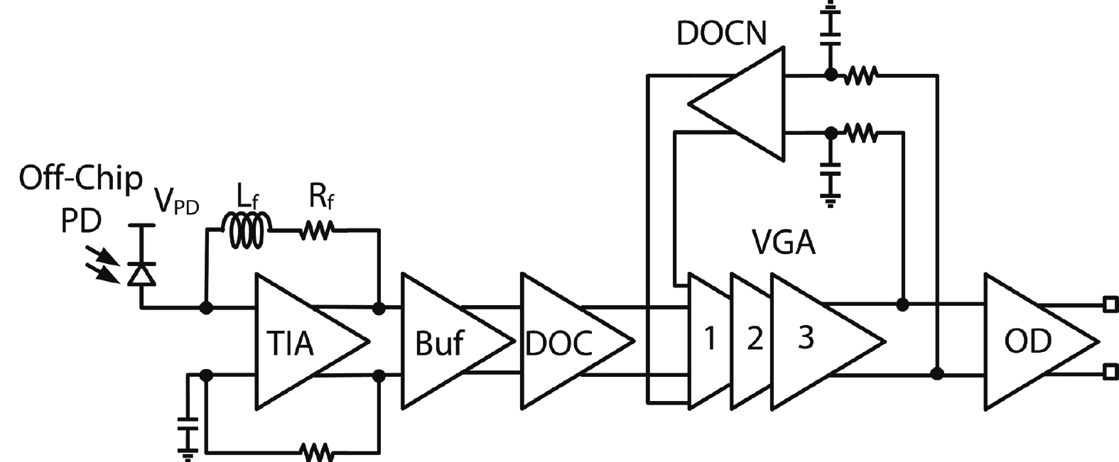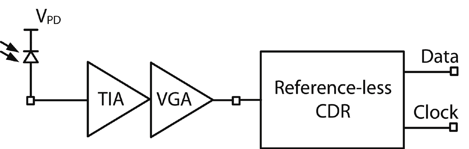 This paper presents a 26-Gb/s CMOS optical receiver that is fabricated in 65-nm technology. It consists of a triple-inductive transimpedance amplifier (TIA), direct current (DC) offset cancellation circuits, 3-stage gm-TIA variable-gain amplifiers (VGA), and a reference-less clock and data recovery (CDR) circuit with built-in equalization technique. The TIA/VGA front-end measurement results demonstrate 72-dB? transimpedance gain, 20.4-GHz ?3-dB bandwidth, and 12-dB DC gain tuning range. The measurements of the VGA’s resistive networks also demonstrate its efficient capability of overcoming the voltage and temperature variations. The CDR adopts a full-rate topology with 12-dB imbedded equalization tuning range. Optical measurements of this chipset achieve a 10?12 BER at 26 Gb/s for a 215?1 PRBS input with a ?7.3-dBm input sensitivity. The measurement results with a 10-dB @ 13 GHz attenuator also demonstrate the effectiveness of the gain tuning capability and the built-in equalization. The entire system consumes 140 mW from a 1/1.2-V supply.