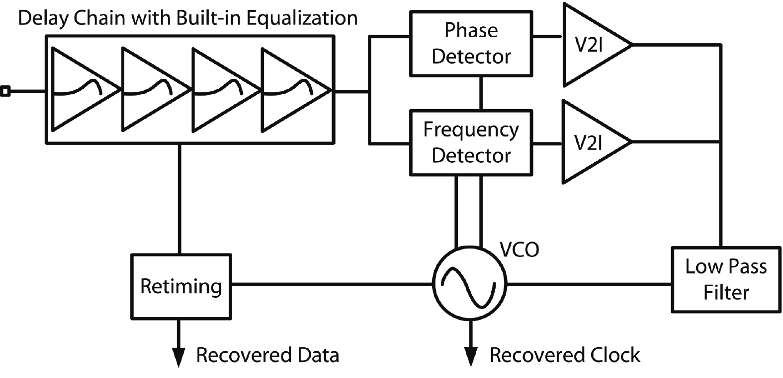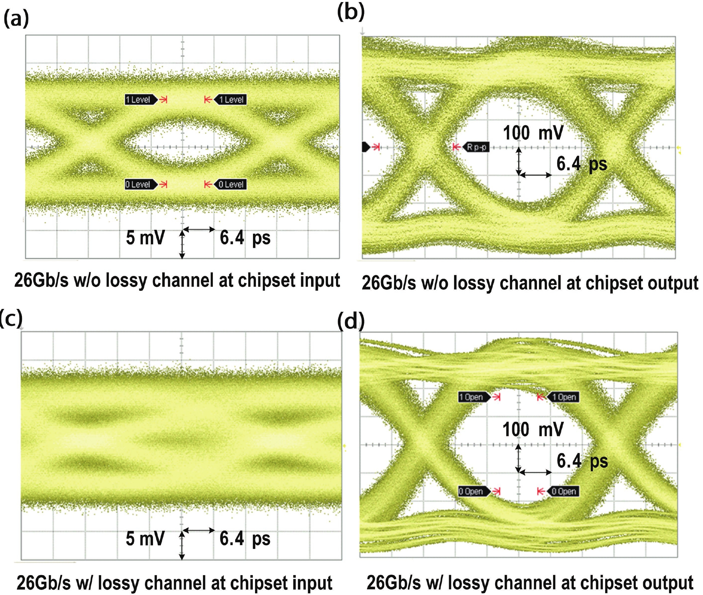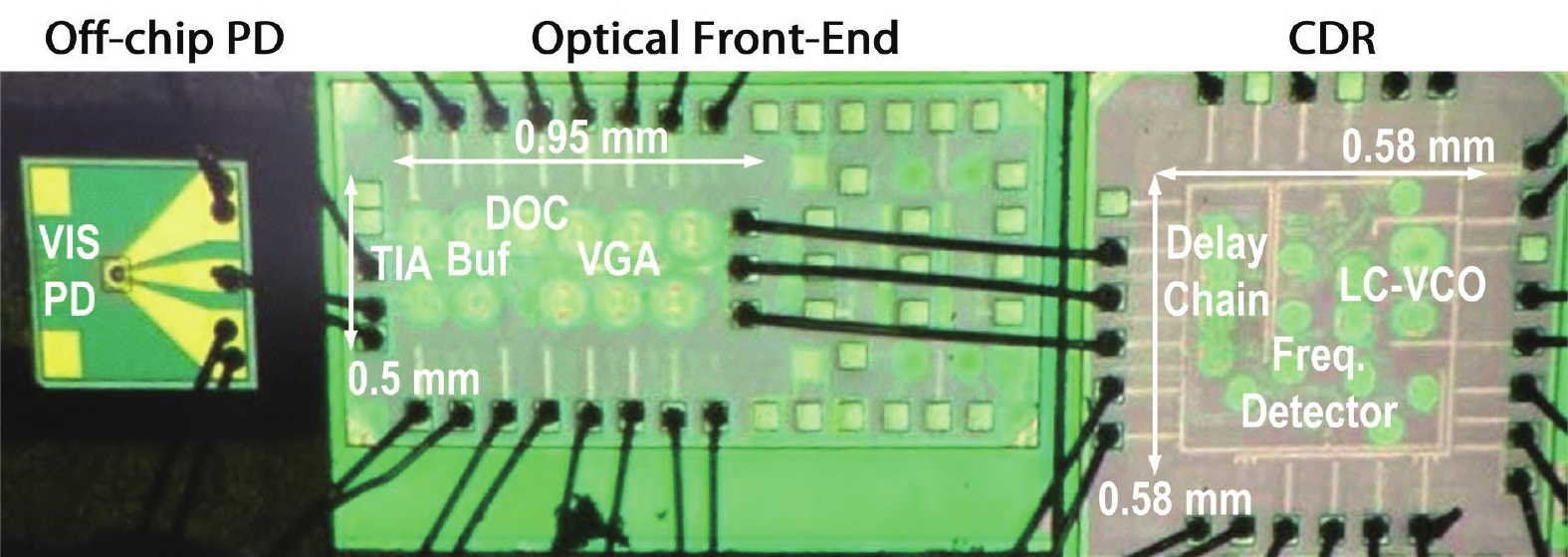 This paper presents a 26-Gb/s CMOS optical receiver that is fabricated in 65-nm technology. It consists of a triple-inductive transimpedance amplifier (TIA), direct current (DC) offset cancellation circuits, 3-stage gm-TIA variable-gain amplifiers (VGA), and a reference-less clock and data recovery (CDR) circuit with built-in equalization technique. The TIA/VGA front-end measurement results demonstrate 72-dB? transimpedance gain, 20.4-GHz ?3-dB bandwidth, and 12-dB DC gain tuning range. The measurements of the VGA’s resistive networks also demonstrate its efficient capability of overcoming the voltage and temperature variations. The CDR adopts a full-rate topology with 12-dB imbedded equalization tuning range. Optical measurements of this chipset achieve a 10?12 BER at 26 Gb/s for a 215?1 PRBS input with a ?7.3-dBm input sensitivity. The measurement results with a 10-dB @ 13 GHz attenuator also demonstrate the effectiveness of the gain tuning capability and the built-in equalization. The entire system consumes 140 mW from a 1/1.2-V supply.
