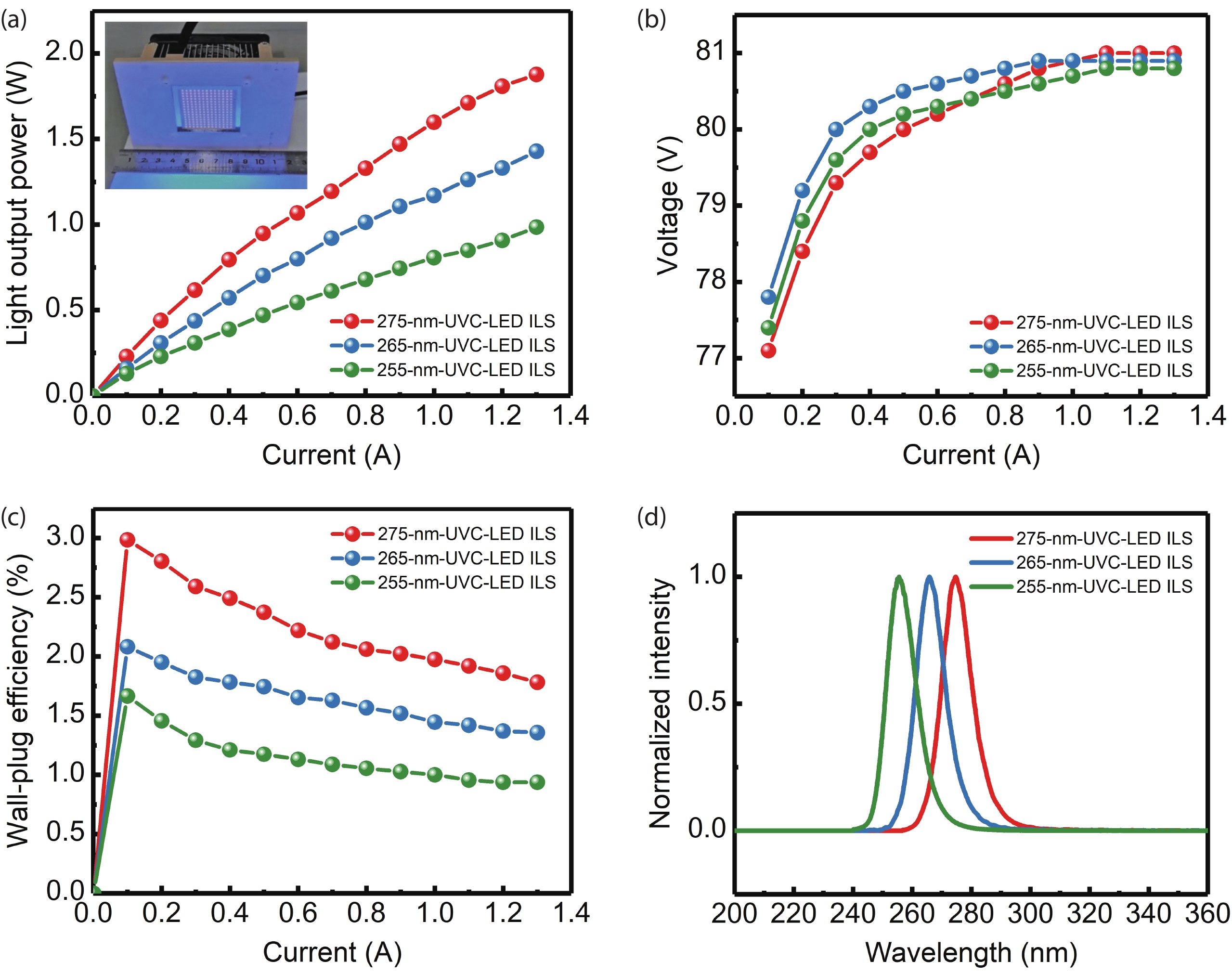 With the epidemic of the coronavirus disease (COVID-19) infection, AlGaN-based ultraviolet-C light emitting diodes (UVC-LEDs) have attracted widespread attention for their sterilization application. However, the sterilization characters of high power integrated light sources (ILSs) haven’t been widely investigated before utilizing in public sanitary security. In this work, by integrating up to 195 UVC-LED chips, high power UVC-LED ILSs with a light output power (LOP) of 1.88 W were demonstrated. The UVC-LED ILSs were verified to have efficient and rapid sterilization capability, which have achieved more than 99.9% inactivation rate of several common pathogenic microorganisms within 1 s. In addition, the corresponding air sterilization module based on them was also demonstrated to kill more than 97% of Staphylococcus albus in the air of 20 m3 confined room within 30 min. This work demonstrates excellent sterilization ability of UVC-LED ILSs with high LOP, revealing great potential of UVC-LEDs in sterilization applications in the future.