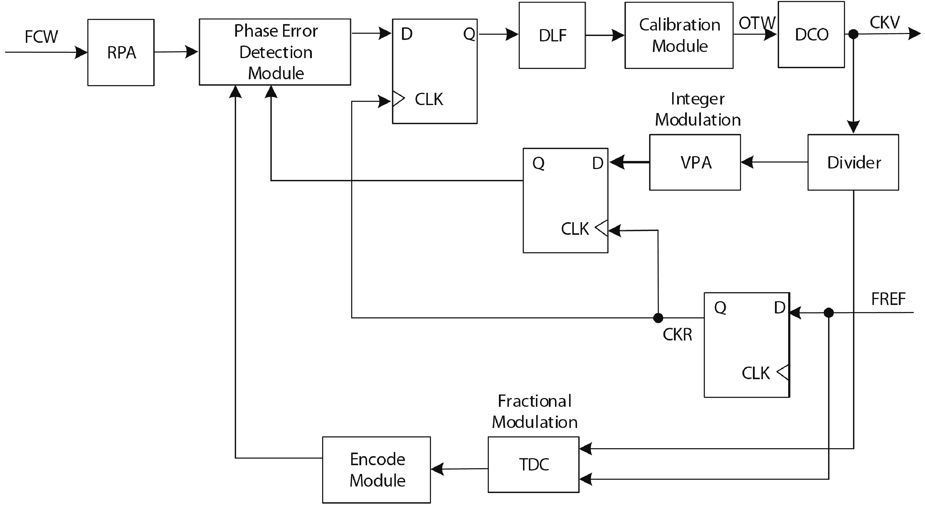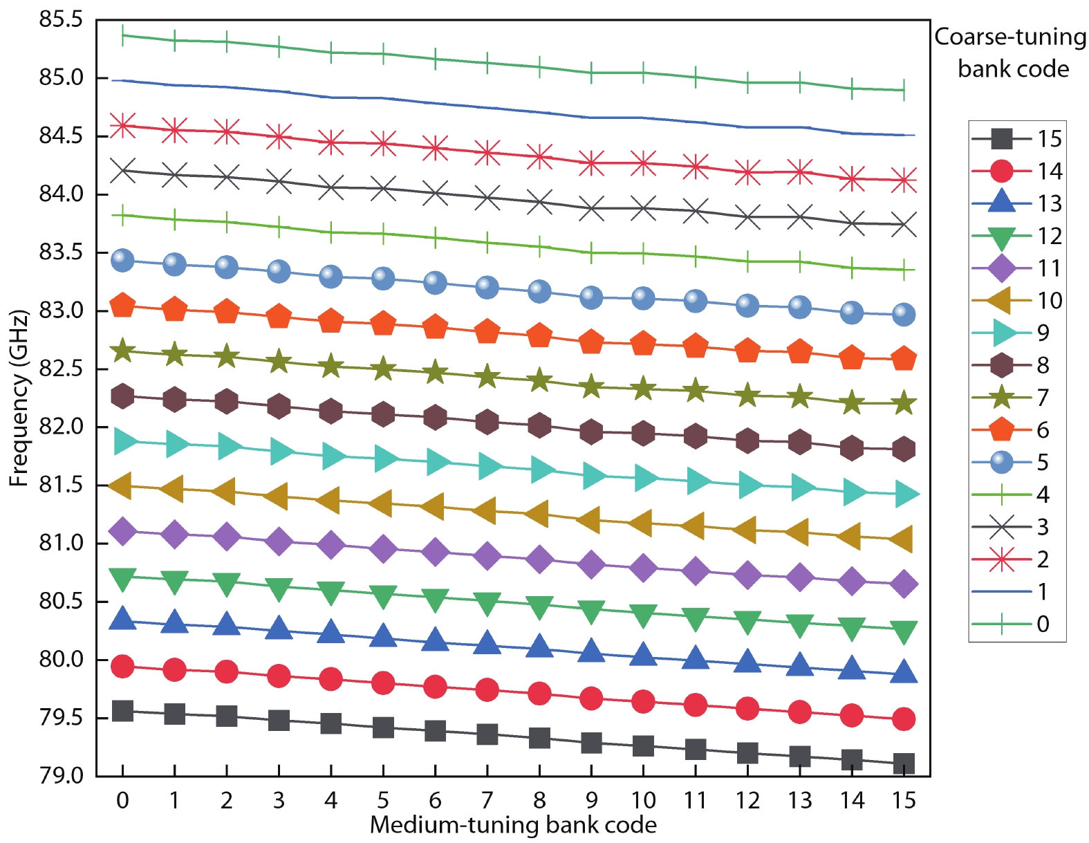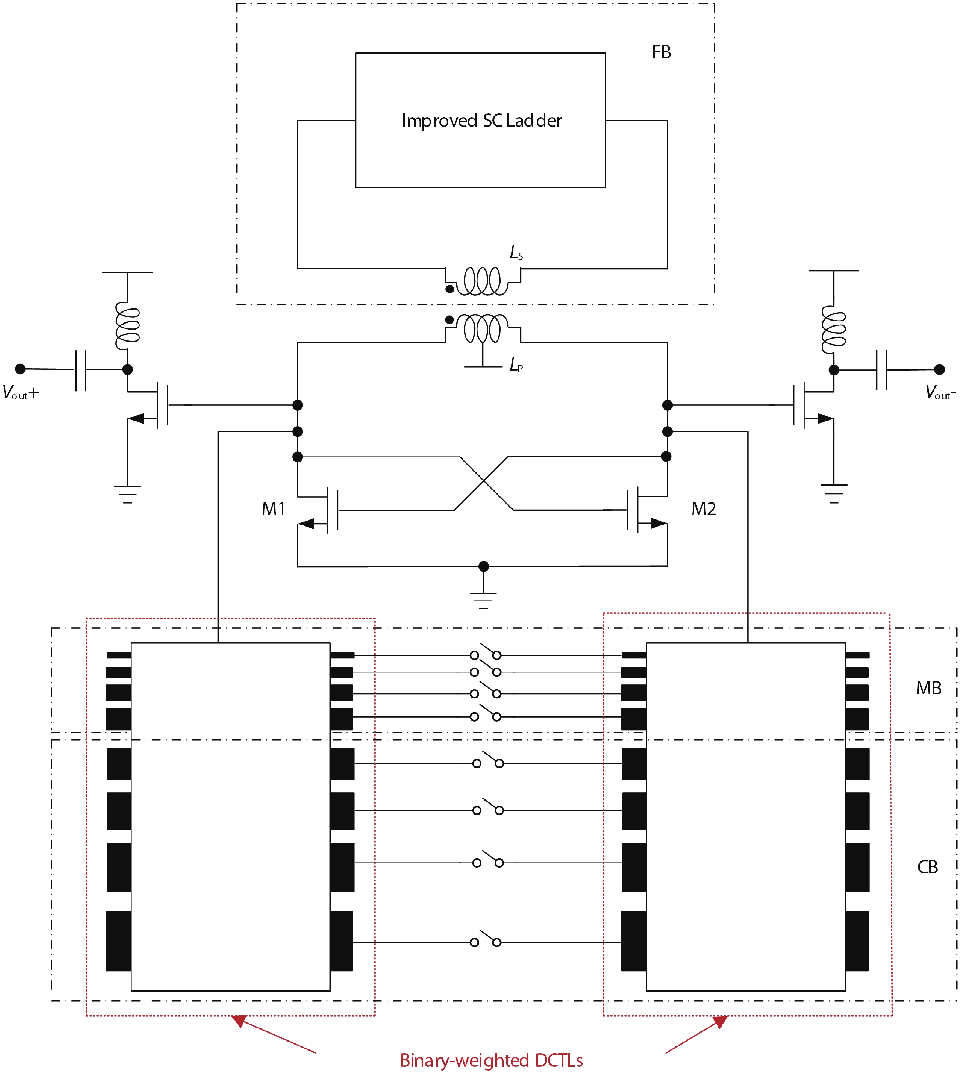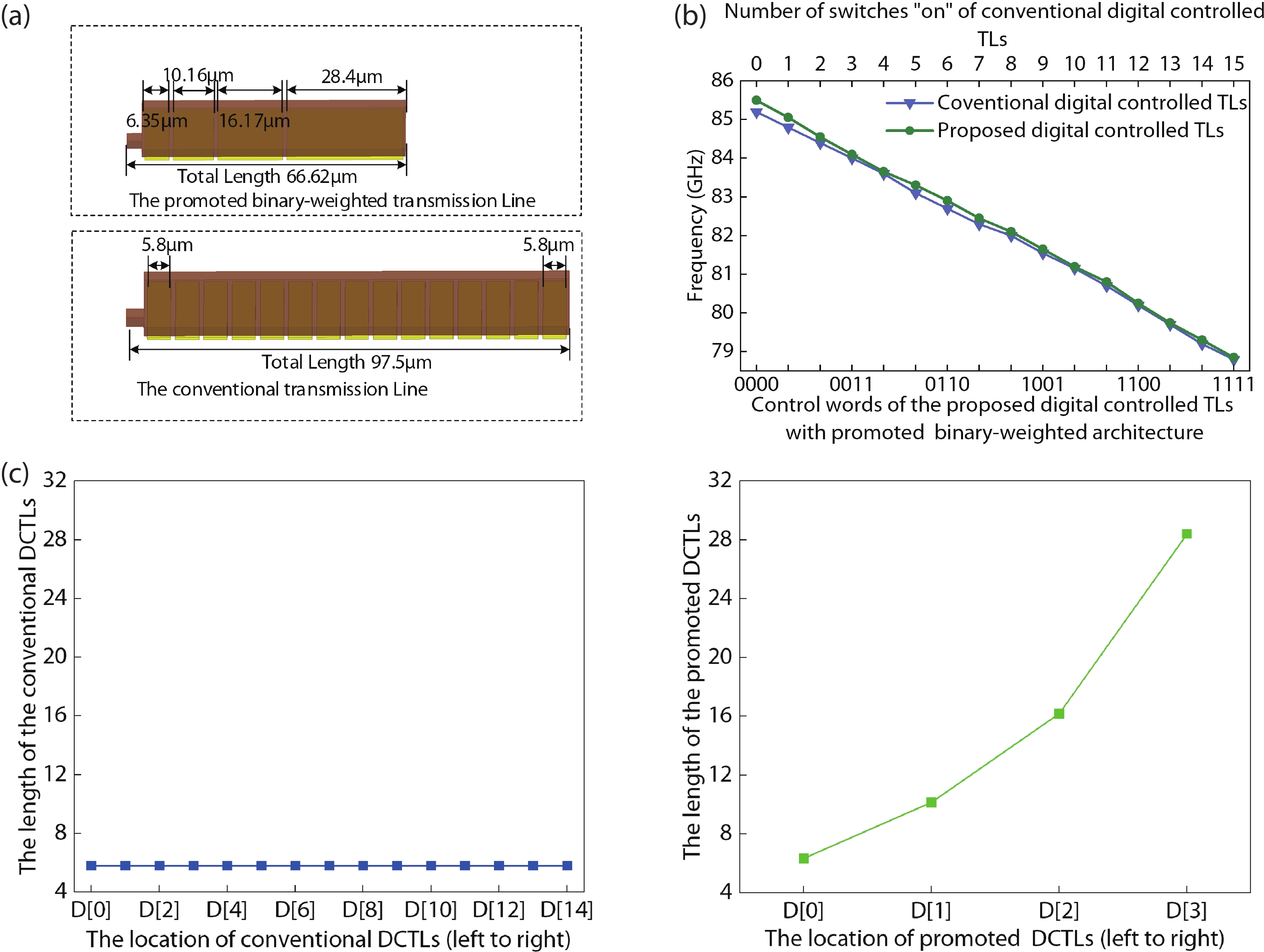 An 80-GHz DCO based on modified hybrid tuning banks is introduced in this paper. To achieve sub-MHz frequency resolution with reduced circuit complexity, the improved circuit topology replaces the conventional circuit topology with two binary-weighted SC cells, enabling eight SC-cell-based improved SC ladders to achieve the same fine-tuning steps as twelve SC-cell-based conventional SC ladders. To achieve lower phase noise and smaller chip size, the promoted binary-weighted digitally controlled transmission lines (DCTLs) are used to implement the coarse and medium tuning banks of the DCO. Compared to the conventional thermometer-coded DCTLs, control bits of the proposed DCTLs are reduced from 30 to 8, and the total length is reduced by 34.3% (from 122.76 to 80.66 μm). Fabricated in 40-nm CMOS, the DCO demonstrated in this work features a small fine-tuning step (483 kHz), a high oscillation frequency (79–85 GHz), and a smaller chip size (0.017 mm2). Compared to previous work, the modified DCO exhibits an excellent figure of merit with an area (FoMA) of –198 dBc/Hz.