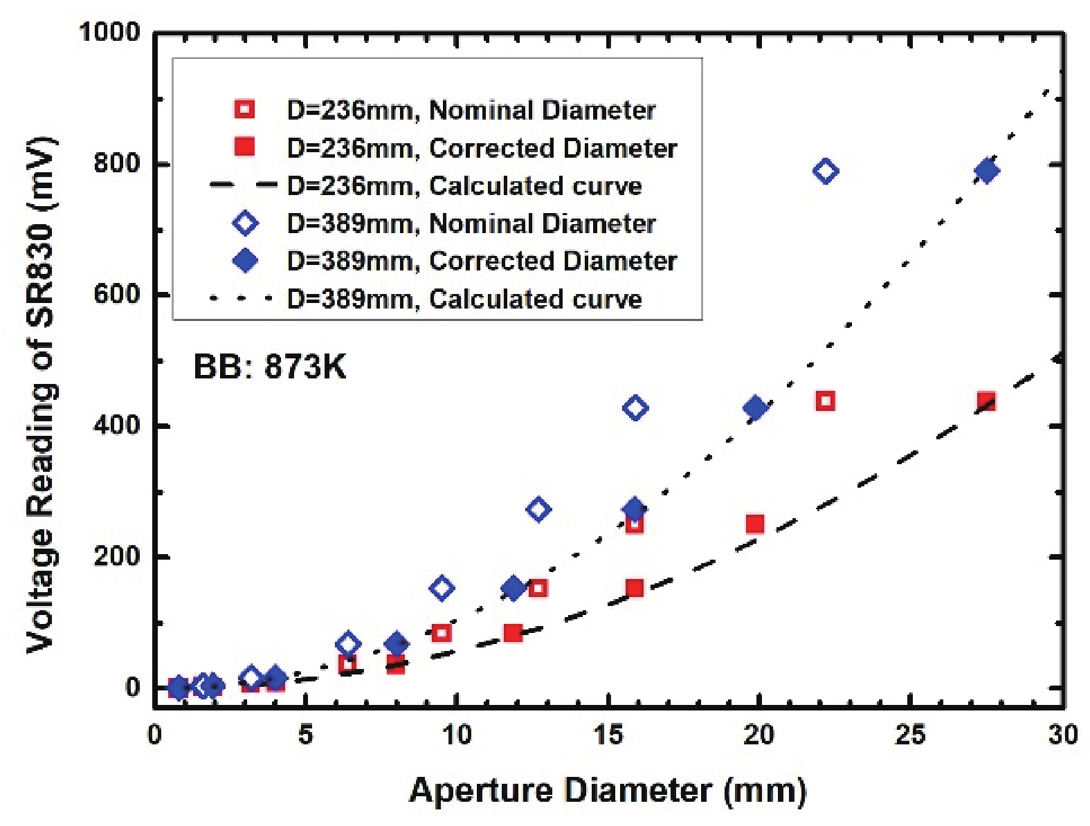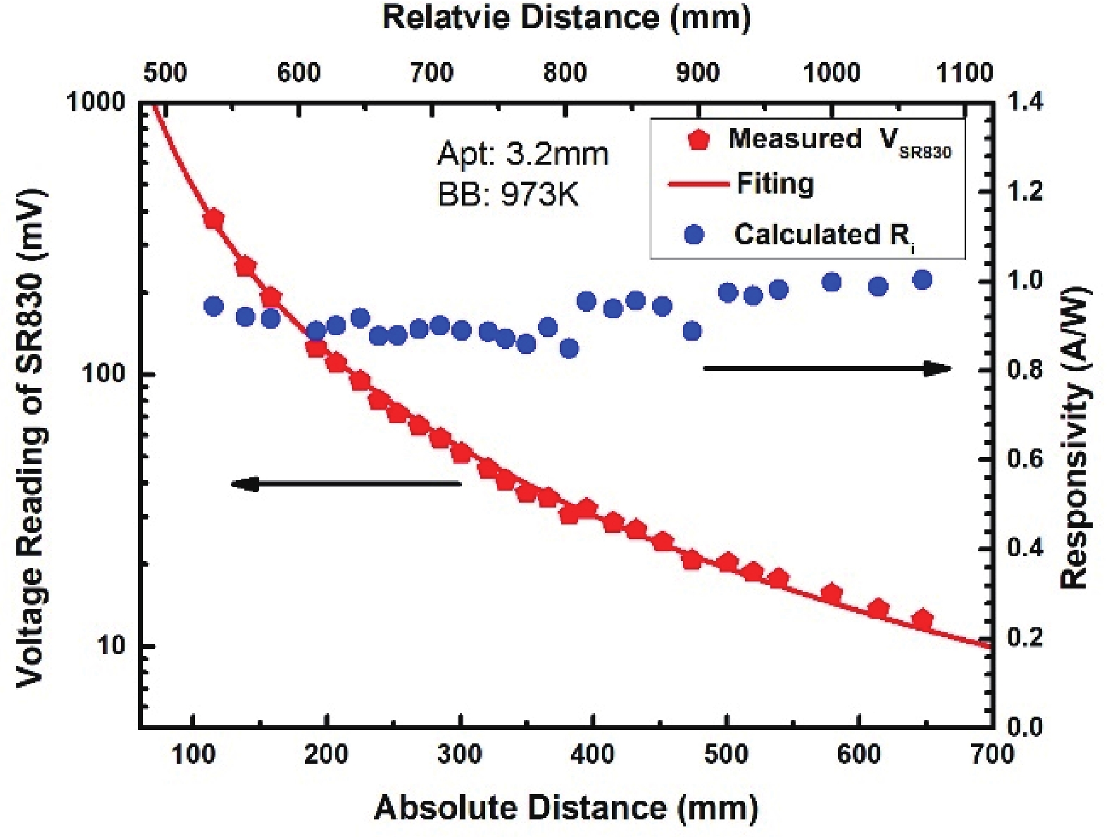 For the measurement of responsivity of an infrared photodetector, the most-used radiation source is a blackbody. In such a measurement system, distance between the blackbody, the photodetector and the aperture diameter are two parameters that contribute most measurement errors. In this work, we describe the configuration of our responsivity measurement system in great detail and present a method to calibrate the distance and aperture diameter. The core of this calibration method is to transfer direct measurements of these two parameters into an extraction procedure by fitting the experiment data to the calculated results. The calibration method is proved experimentally with a commercially extended InGaAs detector at a wide range of blackbody temperature, aperture diameter and distance. Then proof procedures are further extended into a detector fabricated in our laboratory and consistent results were obtained.