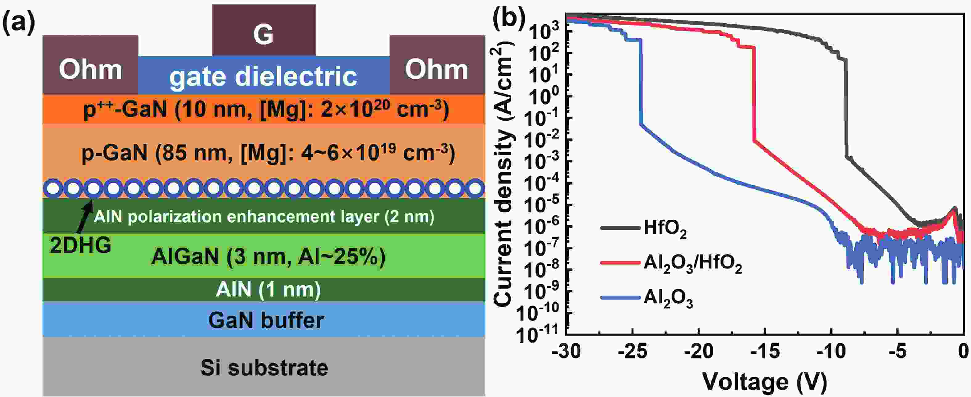 In this letter, an enhancement-mode (E-mode) GaN p-channel field-effect transistor (p-FET) with a high current density of ?4.9 mA/mm based on a O3-Al2O3/HfO2 (5/15 nm) stacked gate dielectric was demonstrated on a p++-GaN/p-GaN/AlN/AlGaN/AlN/GaN/Si heterostructure. Attributed to the p++-GaN capping layer, a good linear ohmic I?V characteristic featuring a low-contact resistivity (ρc) of 1.34 × 10?4 Ω·cm2 was obtained. High gate leakage associated with the HfO2 high-k gate dielectric was effectively blocked by the 5-nm O3-Al2O3 insertion layer grown by atomic layer deposition, contributing to a high ION/IOFF ratio of 6 × 106 and a remarkably reduced subthreshold swing (SS) in the fabricated p-FETs. The proposed structure is compelling for energy-efficient GaN complementary logic (CL) circuits.