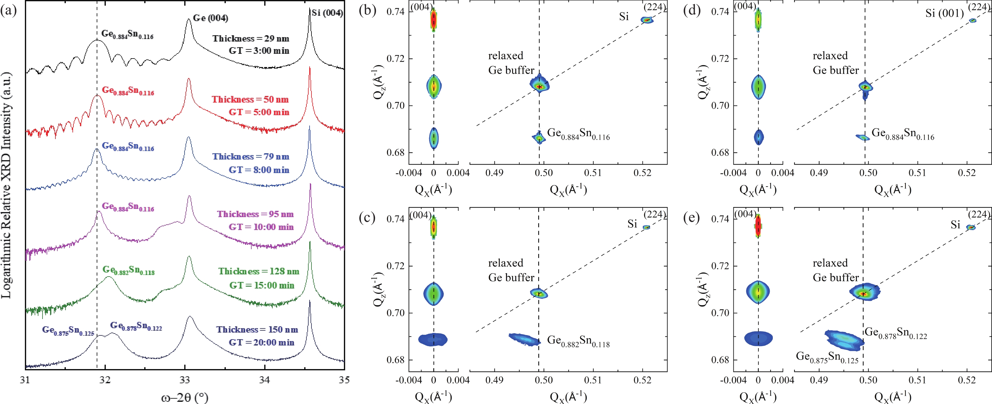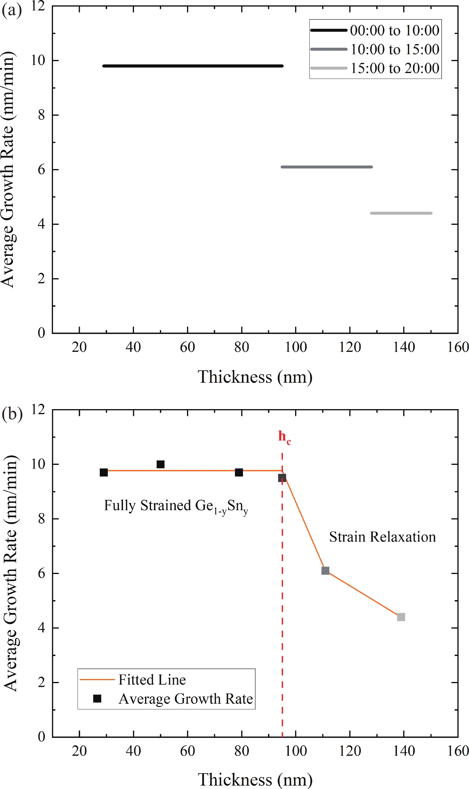 The growth of high-quality germanium tin (Ge1–ySny) binary alloys on a Si substrate using chemical vapor deposition (CVD) techniques holds immense potential for advancing electronics and optoelectronics applications, including the development of efficient and low-cost mid-infrared detectors and light sources. However, achieving precise control over the Sn concentration and strain relaxation of the Ge1–ySny epilayer, which directly influence its optical and electrical properties, remain a significant challenge. In this research, the effect of strain relaxation on the growth rate of Ge1–ySny epilayers, with Sn concentration >11at.%, is investigated. It is successfully demonstrated that the growth rate slows down by ~55% due to strain relaxation after passing its critical thickness, which suggests a reduction in the incorporation of Ge into Ge1–ySny growing layers. Despite the increase in Sn concentration as a result of the decrease in the growth rate, it has been found that the Sn incorporation rate into Ge1–ySny growing layers has also decreased due to strain relaxation. Such valuable insights could offer a foundation for the development of innovative growth techniques aimed at achieving high-quality Ge1–ySny epilayers with tuned Sn concentration and strain relaxation.