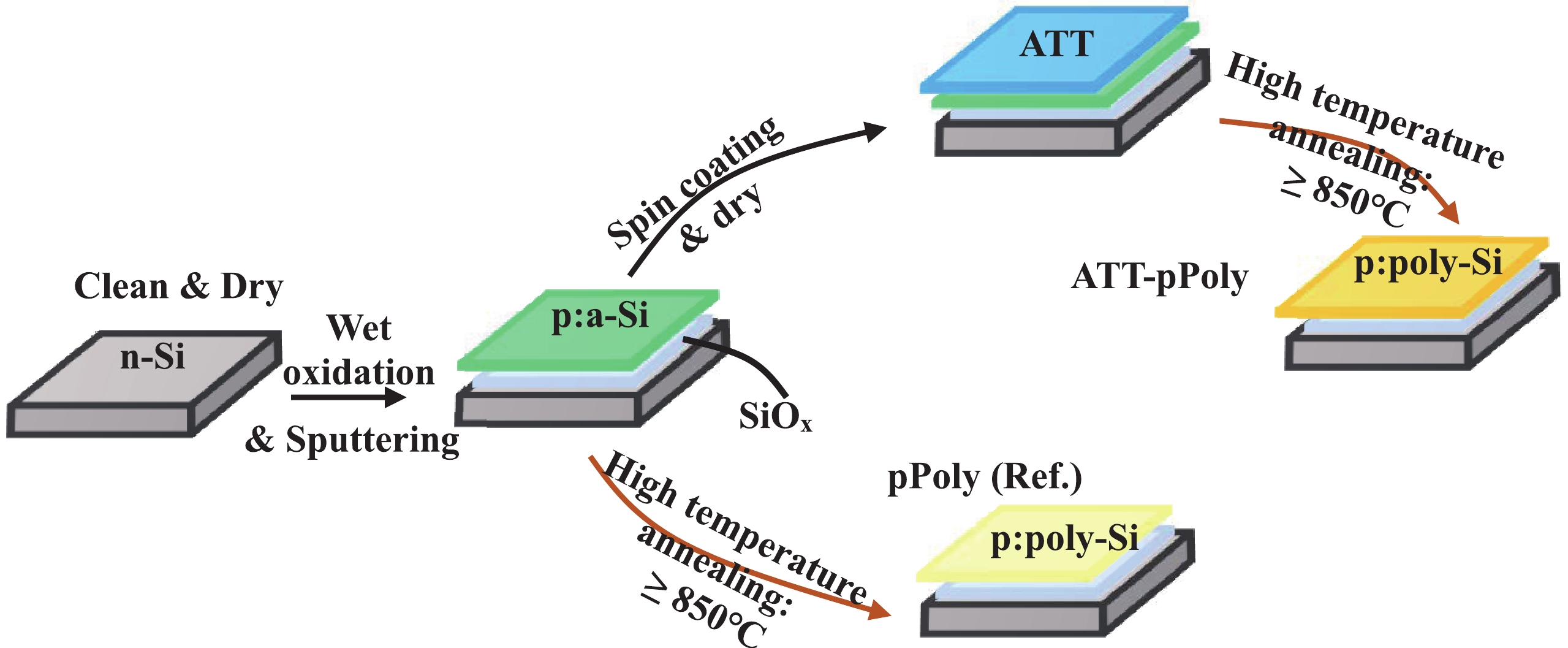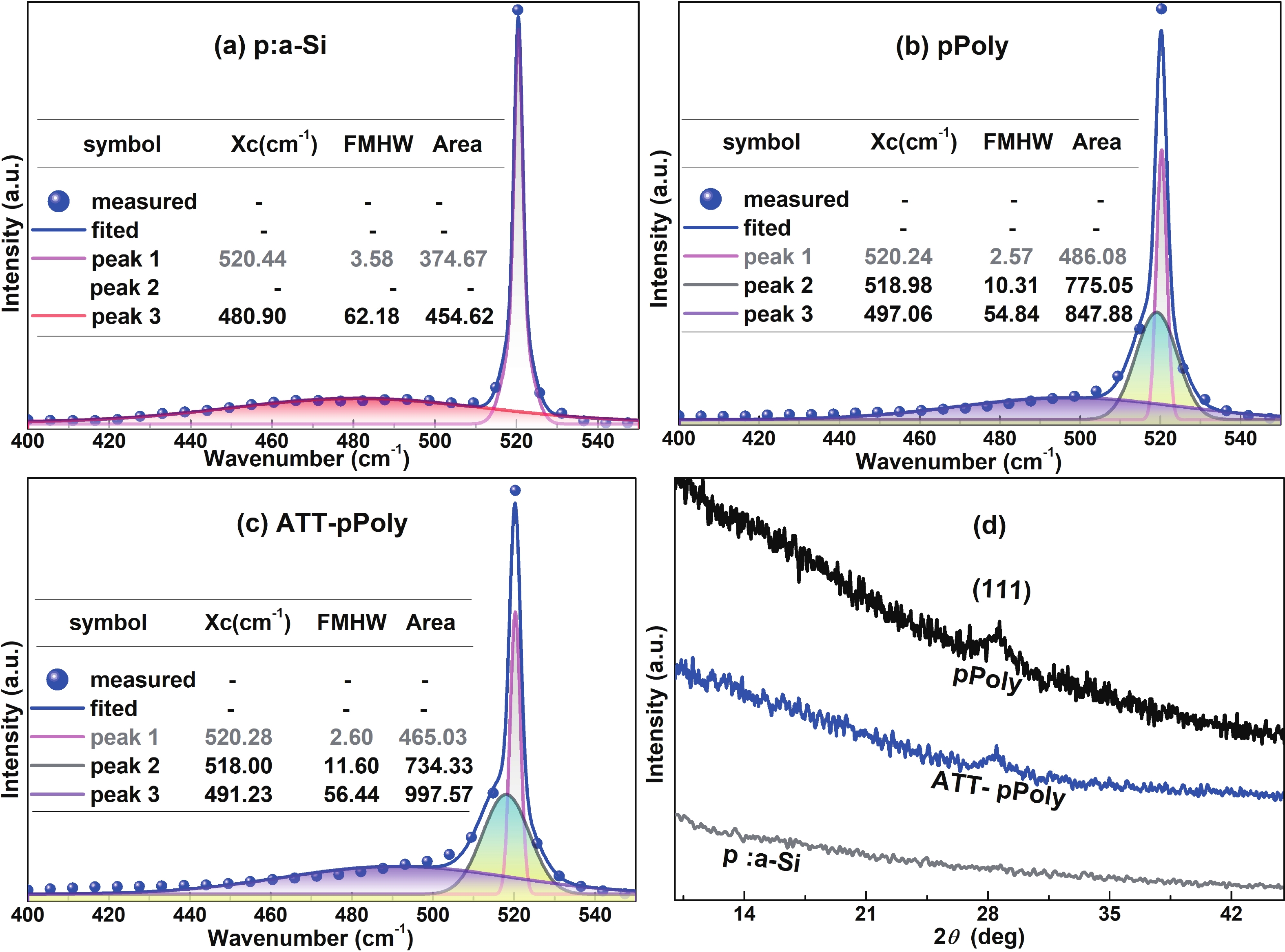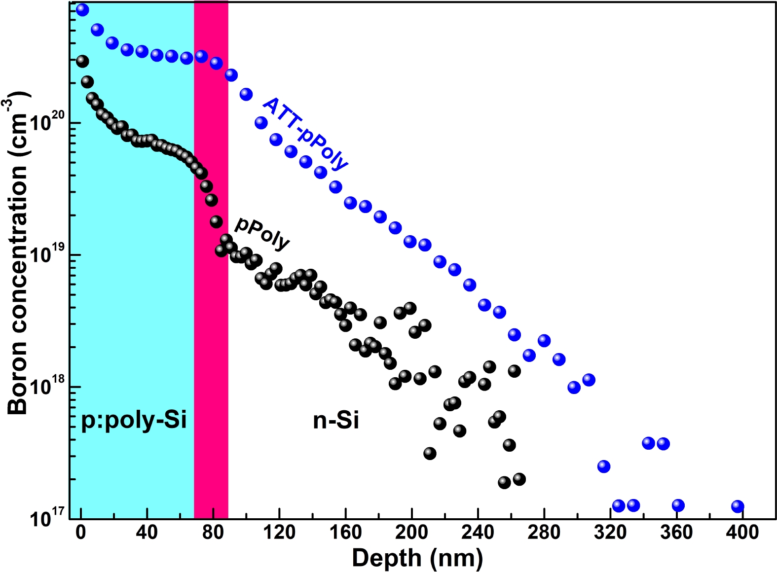 Here, p-type polysilicon films are fabricated by ex-situ doping method with ammonium tetraborate tetrahydrate (ATT) as the boron source, named ATT-pPoly. The effects of ATT on the properties of polysilicon films are comprehensively analyzed. The Raman spectra reveal that the ATT-pPoly film is composed of grain boundary and crystalline regions. The preferred orientation is the (111) direction. The grain size increases from 16?23 nm to 21?47 nm, by ~70% on average. Comparing with other reported films, Hall measurements reveal that the ATT-pPoly film has a higher carrier concentration (>1020 cm?3) and higher carrier mobility (>30 cm2/(V·s)). The superior properties of the ATT-pPoly film are attributed to the heavy doping and improved grain size. Heavy doping property is proved by the mean sheet resistance (Rsheet,m) and distribution profile. The Rsheet,m decreases by more than 30%, and it can be further decreased by 90% if the annealing temperature or duration is increased. The boron concentration of ATT-pPoly film annealed at 950 °C for 45 min is ~3 × 1020 cm?3, and the distribution is nearly the same, except near the surface. Besides, the standard deviation coefficient (σ) of Rsheet,m is less than 5.0%, which verifies the excellent uniformity of ATT-pPoly film.
