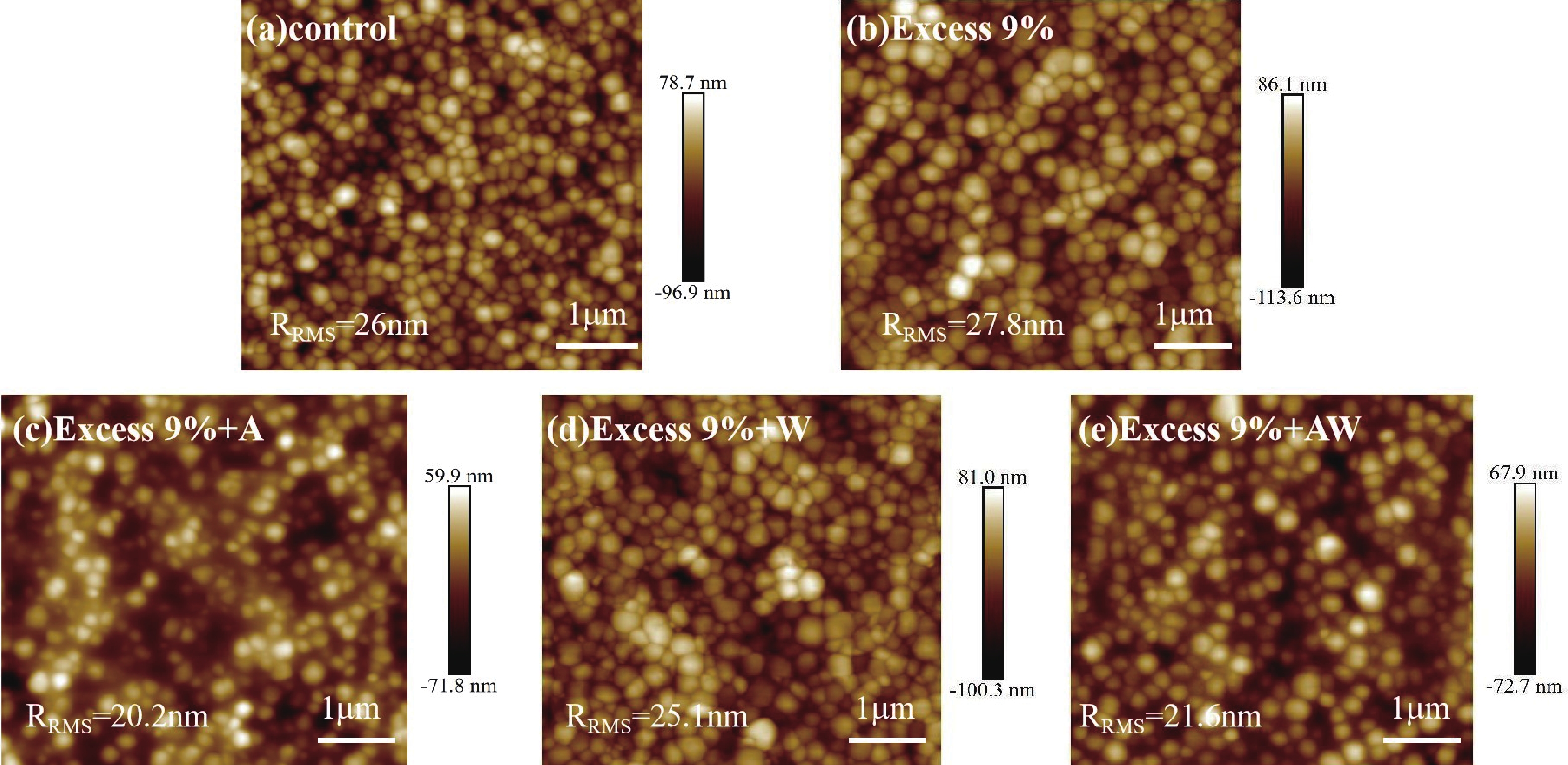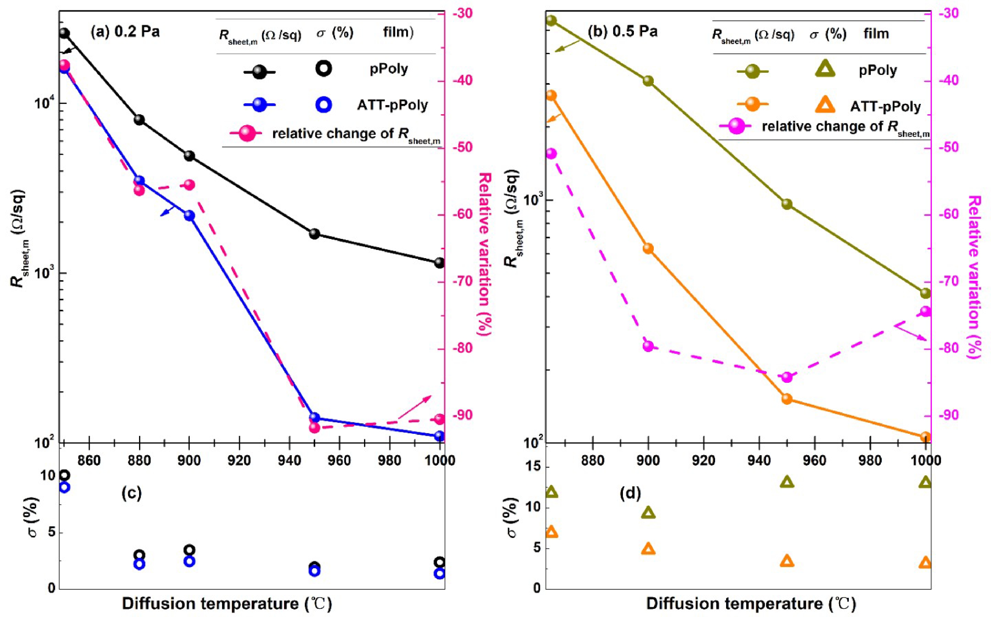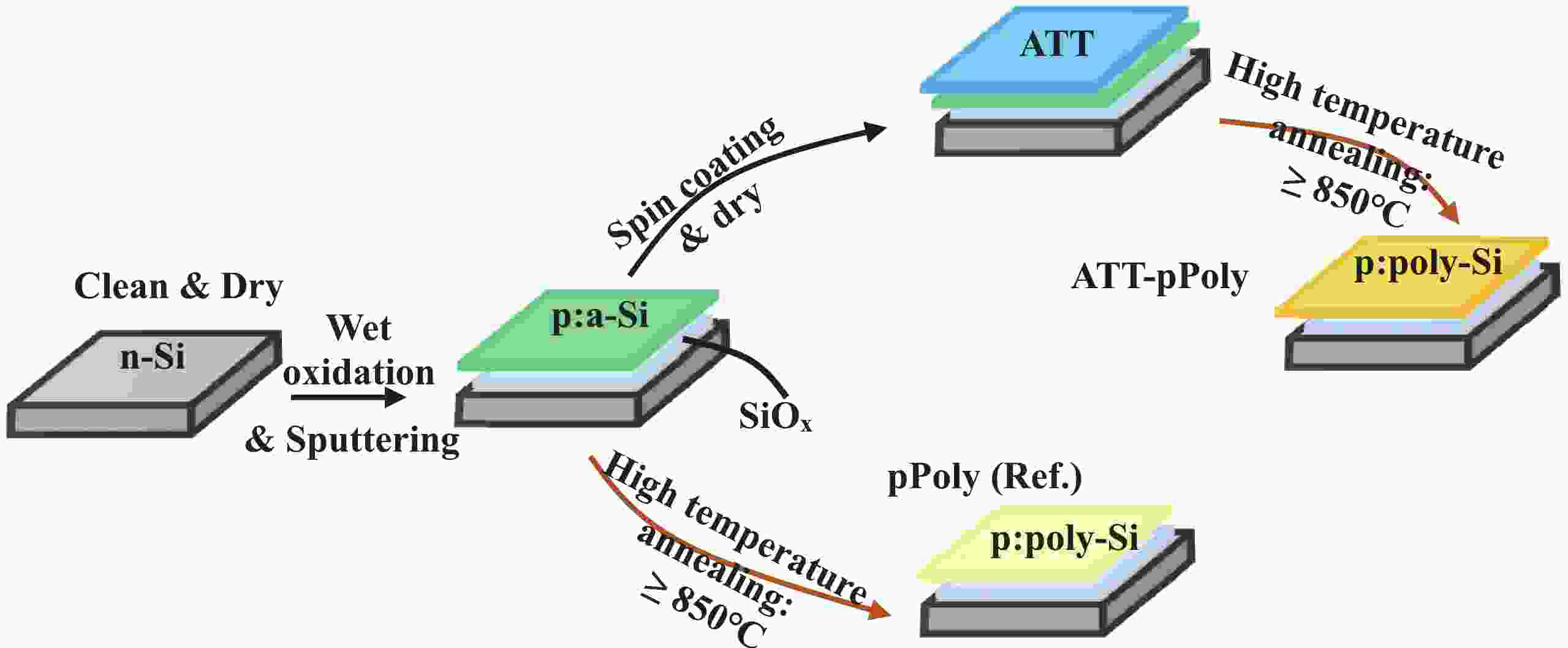 Here, p-type polysilicon films are fabricated by ex-situ doping method with ammonium tetraborate tetrahydrate (ATT) as the boron source, named ATT-pPoly. The effects of ATT on the properties of polysilicon films are comprehensively analyzed. The Raman spectra reveal that the ATT-pPoly film is composed of grain boundary and crystalline regions. The preferred orientation is the (111) direction. The grain size increases from 16?23 nm to 21?47 nm, by ~70% on average. Comparing with other reported films, Hall measurements reveal that the ATT-pPoly film has a higher carrier concentration (>1020 cm?3) and higher carrier mobility (>30 cm2/(V·s)). The superior properties of the ATT-pPoly film are attributed to the heavy doping and improved grain size. Heavy doping property is proved by the mean sheet resistance (Rsheet,m) and distribution profile. The Rsheet,m decreases by more than 30%, and it can be further decreased by 90% if the annealing temperature or duration is increased. The boron concentration of ATT-pPoly film annealed at 950 °C for 45 min is ~3 × 1020 cm?3, and the distribution is nearly the same, except near the surface. Besides, the standard deviation coefficient (σ) of Rsheet,m is less than 5.0%, which verifies the excellent uniformity of ATT-pPoly film.