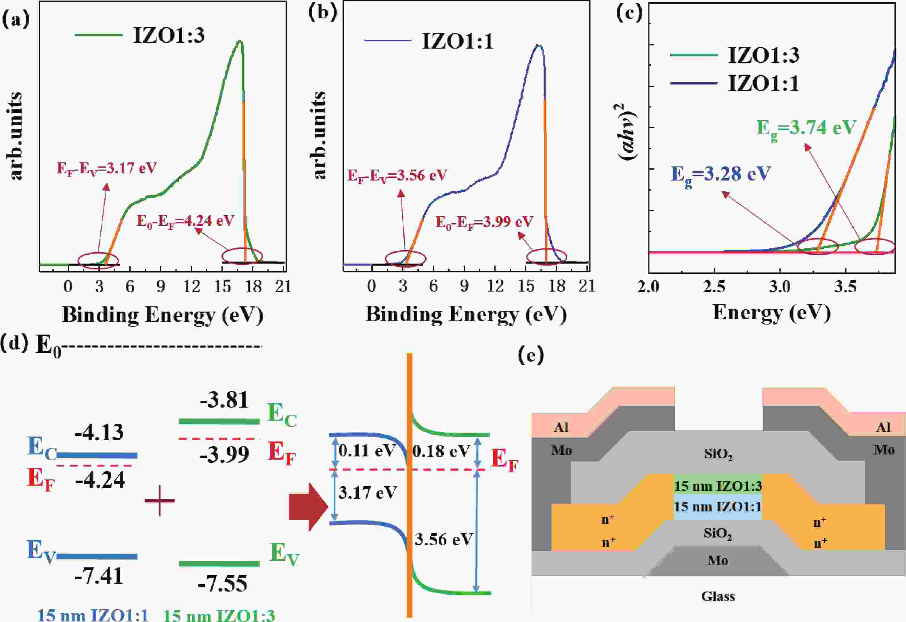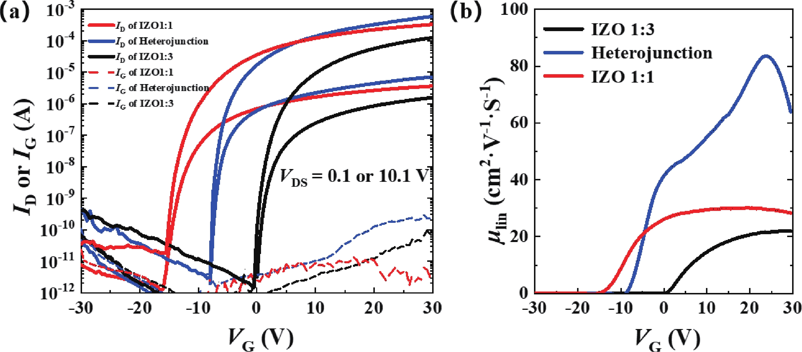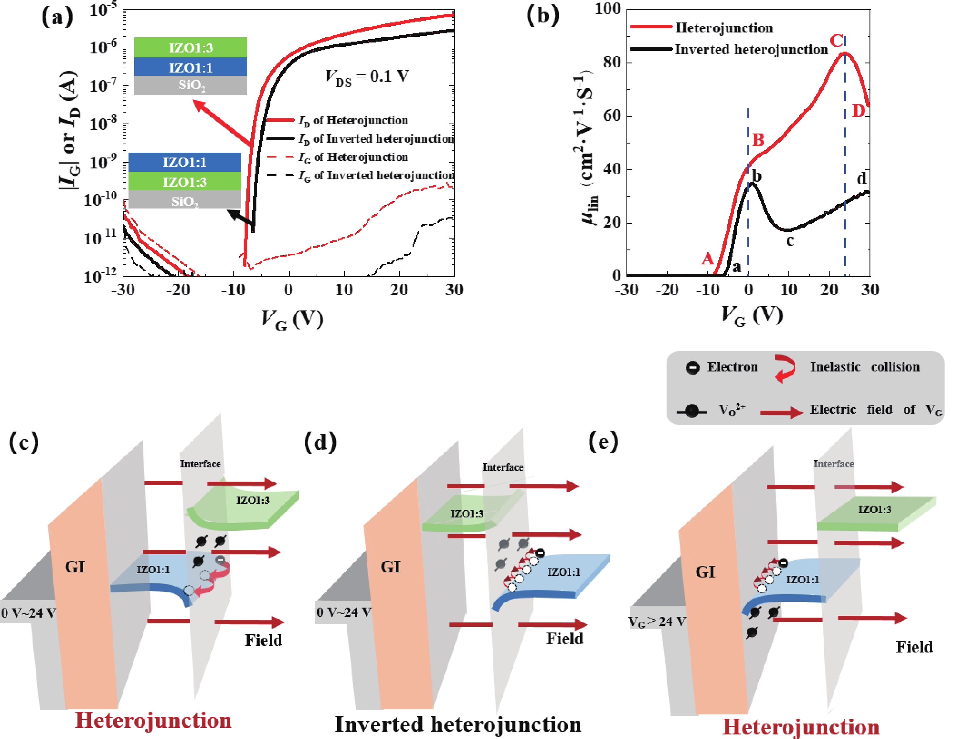 This study investigates the carrier transport of heterojunction channel in oxide semiconductor thin-film transistor (TFT) using the elevated-metal metal-oxide (EMMO) architecture and indium?zinc oxide (InZnO). The heterojunction band diagram of InZnO bilayer was modified by the cation composition to form the two-dimensional electron gas (2DEG) at the interface quantum well, as verified using a metal?insulator?semiconductor (MIS) device. Although the 2DEG indeed contributes to a higher mobility than the monolayer channel, the competition and cooperation between the gate field and the built-in field strongly affect such mobility-boosting effect, originating from the carrier inelastic collision at the heterojunction interface and the gate field-induced suppression of quantum well. Benefited from the proper energy-band engineering, a high mobility of 84.3 cm2·V?1·s?1, a decent threshold voltage (Vth) of ?6.5 V, and a steep subthreshold swing (SS) of 0.29 V/dec were obtained in InZnO-based heterojunction TFT.