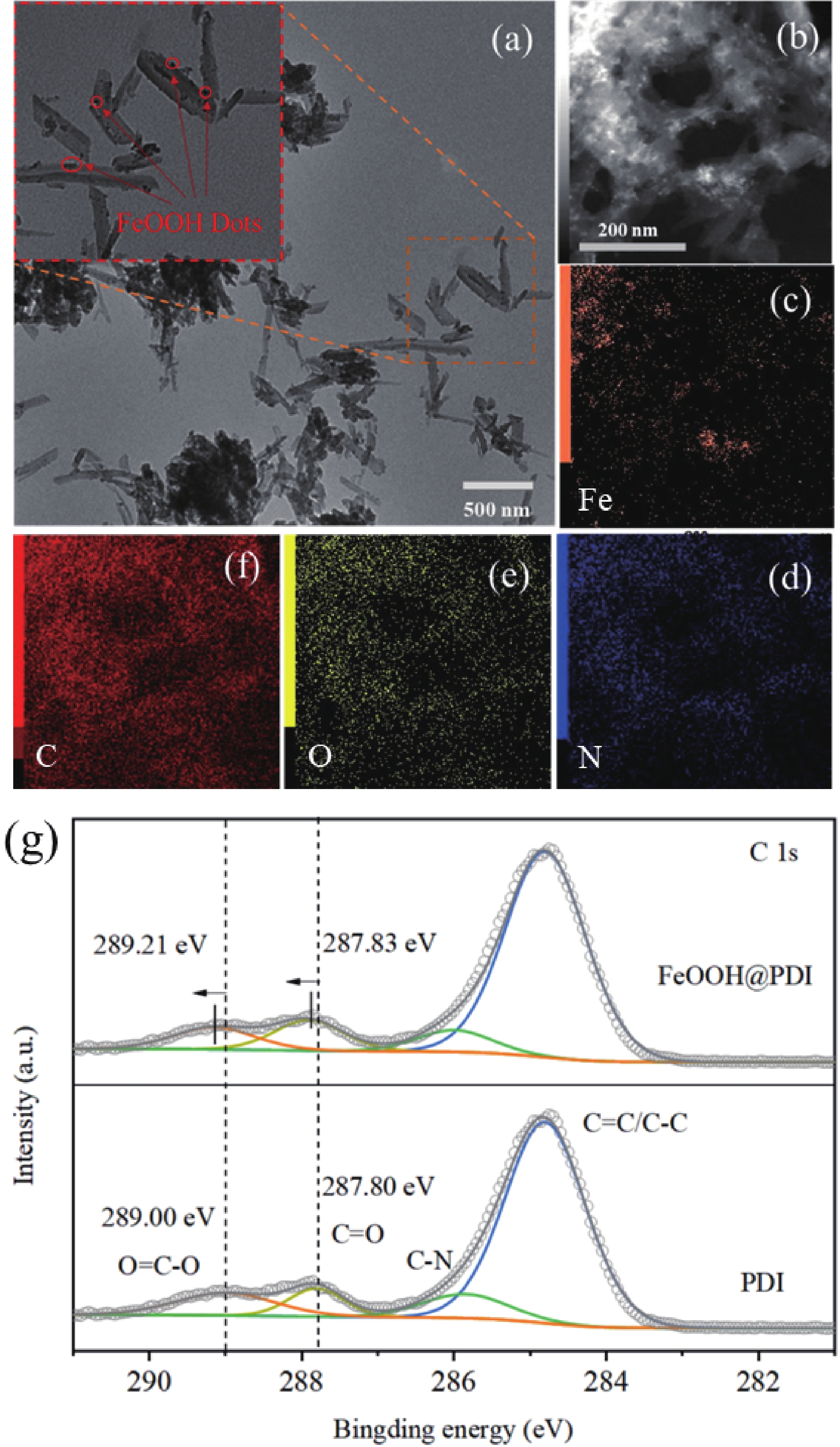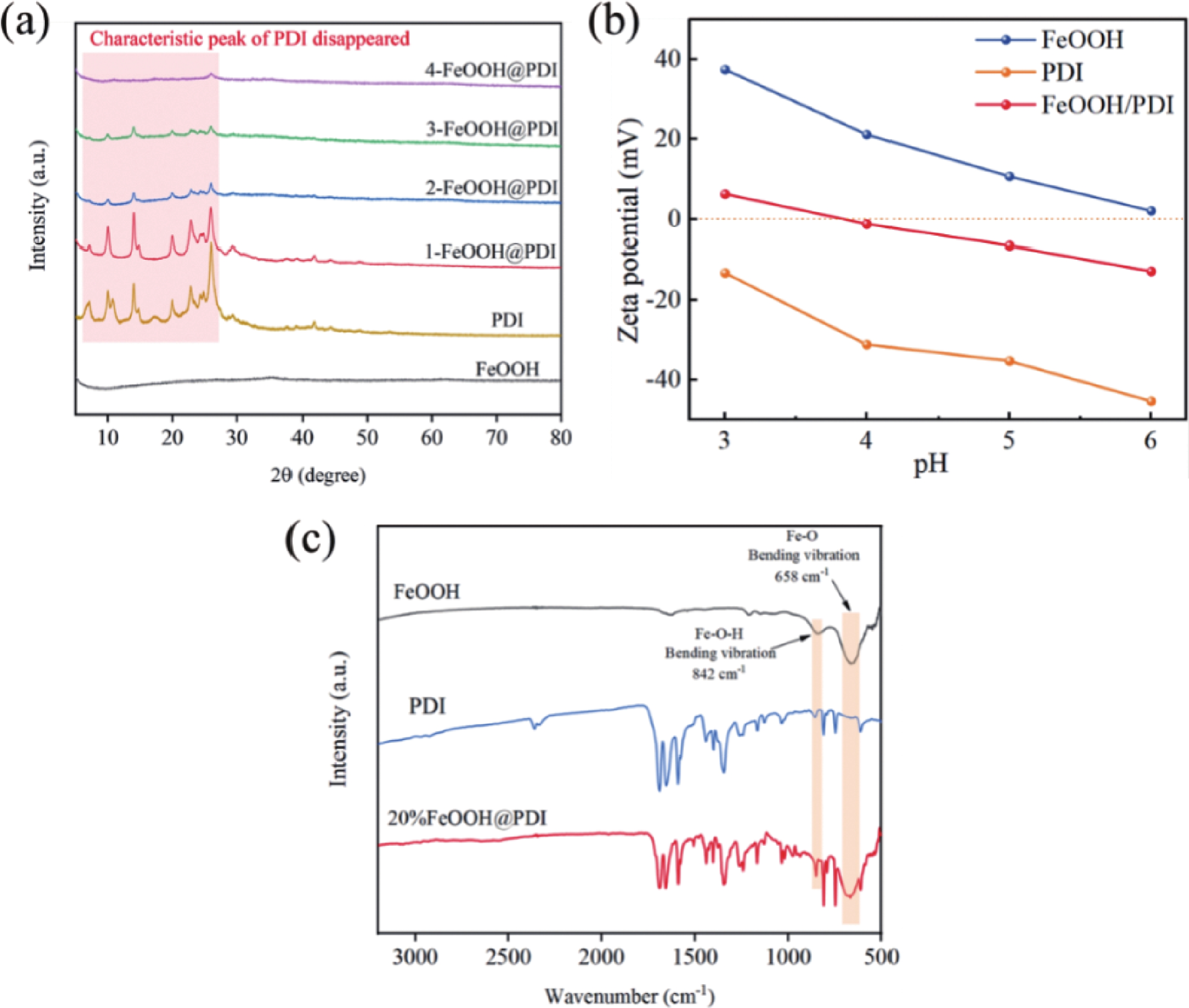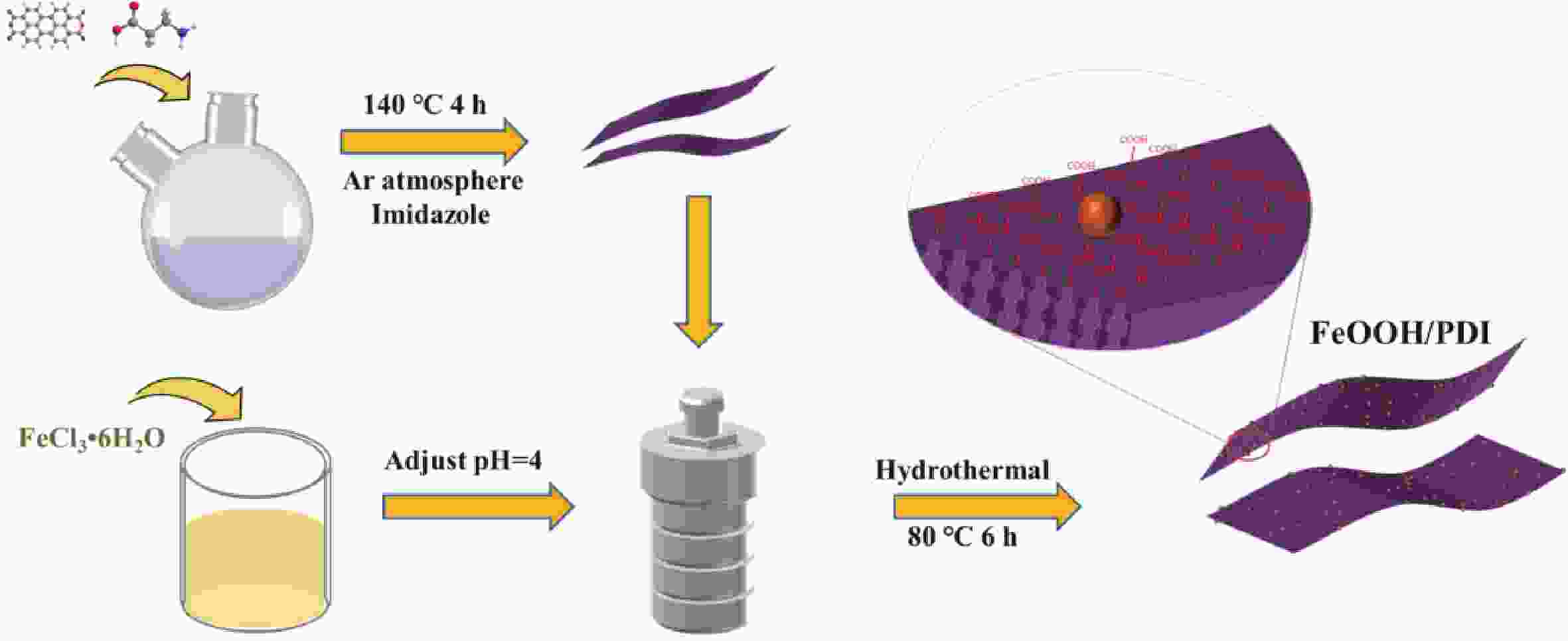 In semiconductor photocatalysts, the easy recombination of photogenerated carriers seriously affects the application of photocatalytic materials in water treatment. To solve the serious problem of electron?hole pair recombination in perylene diimide (PDI) organic semiconductors, we loaded ferric hydroxyl oxide (FeOOH) on PDI materials, successfully prepared novel FeOOH@PDI photocatalytic materials, and constructed a photo-Fenton system. The system was able to achieve highly efficient degradation of BPA under visible light, with a degradation rate of 0.112 min?1 that was 20 times higher than the PDI system, and it also showed universal degradation performances for a variety of emerging organic pollutants and anti-interference ability. The mechanism research revealed that the FeOOH has the electron trapping property, which can capture the photogenerated electrons on the surface of PDI, effectively reducing the compounding rate of photogenerated carriers of PDI and accelerating the iron cycling and H2O2 activation on the surface of FeOOH at the same time. This work provides new insights and methods for solving the problem of easy recombination of carriers in semiconductor photocatalysts and degrading emerging organic pollutants.