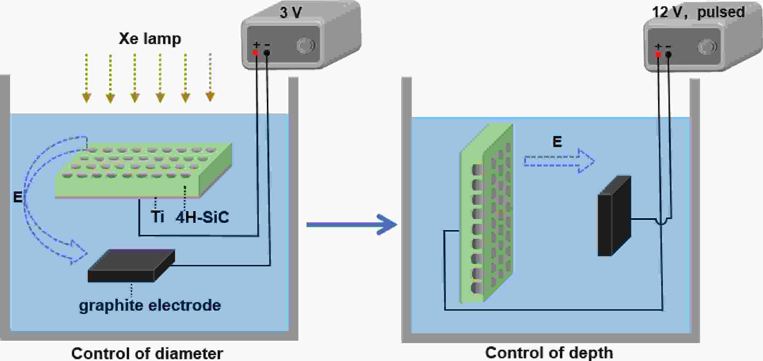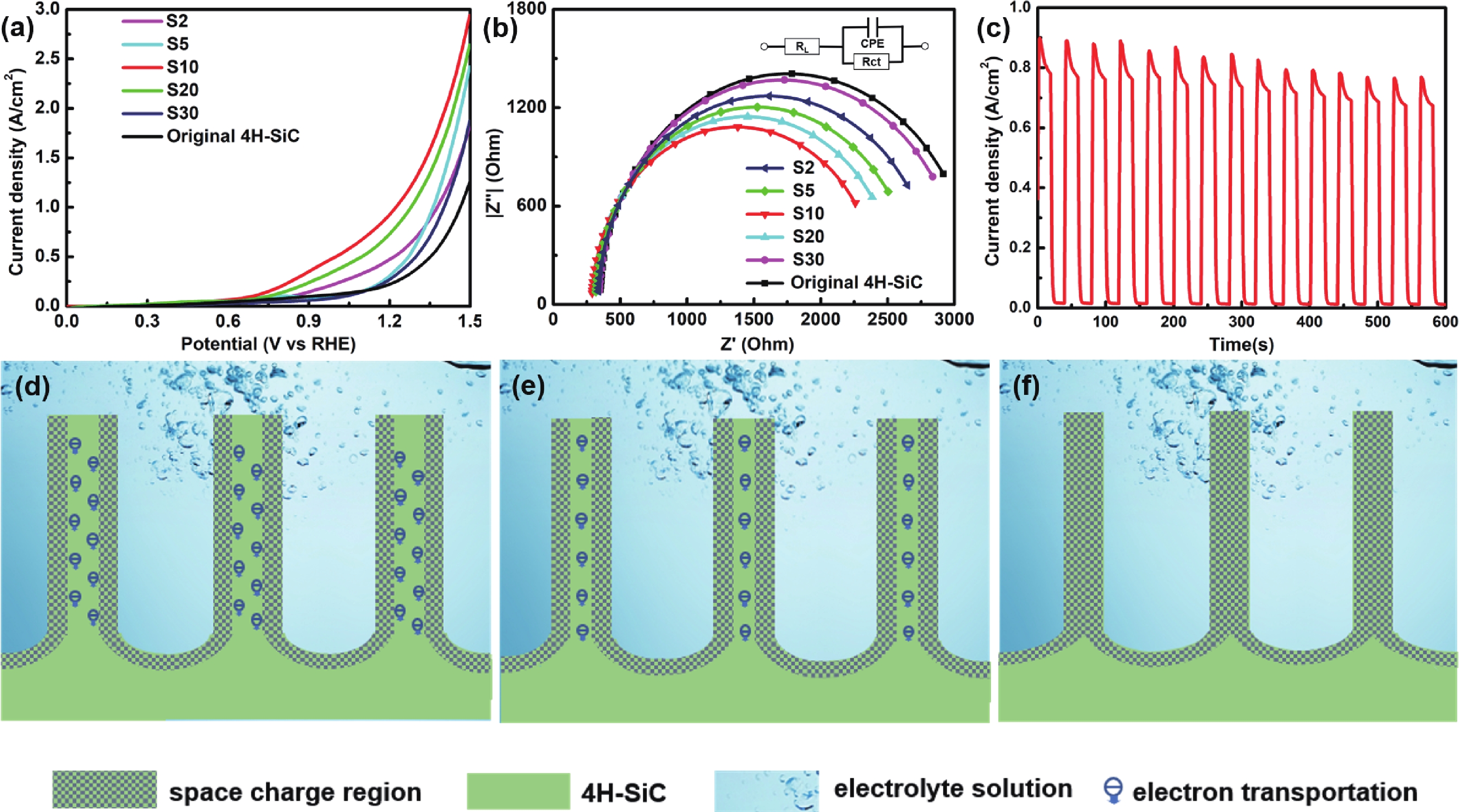 4H silicon carbide (4H-SiC) has gained a great success in high-power electronics, owing to its advantages of wide bandgap, high breakdown electric field strength, high carrier mobility, and high thermal conductivity. Considering the high carrier mobility and high stability of 4H-SiC, 4H-SiC has great potential in the field of photoelectrochemical (PEC) water splitting. In this work, we demonstrate the irradiation-resistant PEC water splitting based on nanoporous 4H-SiC arrays. A new two-step anodizing approach is adopted to prepare 4H-SiC nanoporous arrays with different porosity, that is, a constant low-voltage etching followed by a pulsed high-voltage etching. The constant-voltage etching and pulsed-voltage etching are adopted to control the diameter of the nanopores and the depth of the nanoporous arrays, respectively. It is found that the nanoporous arrays with medium porosity has the highest PEC current, because of the enhanced light absorption and the optimized transportation of charge carriers along the walls of the nanoporous arrays. The performance of the PEC water splitting of the nanoporous arrays is stable after the electron irradiation with the dose of 800 and 1600 kGy, which indicates that 4H-SiC nanoporous arrays has great potential in the PEC water splitting under harsh environments.