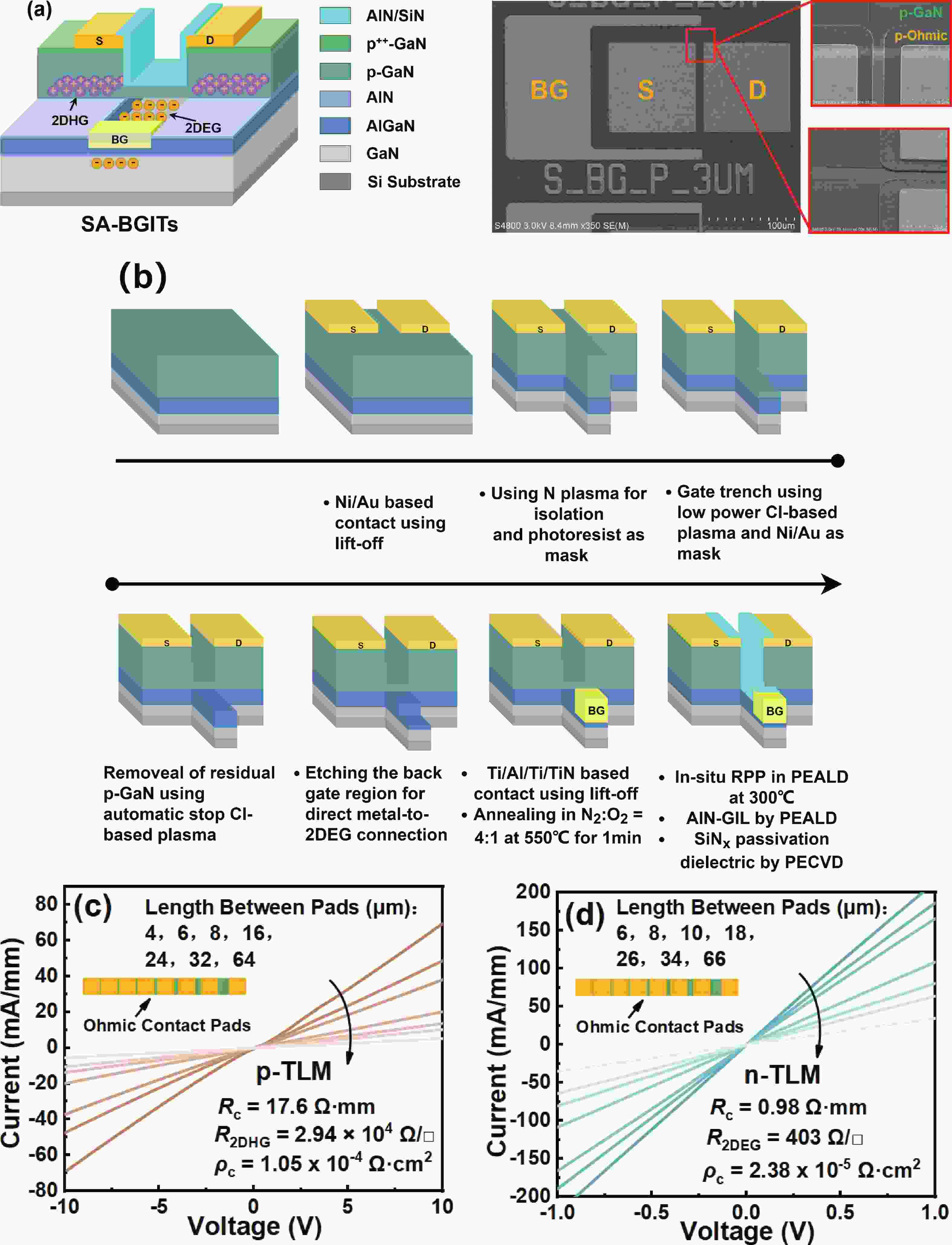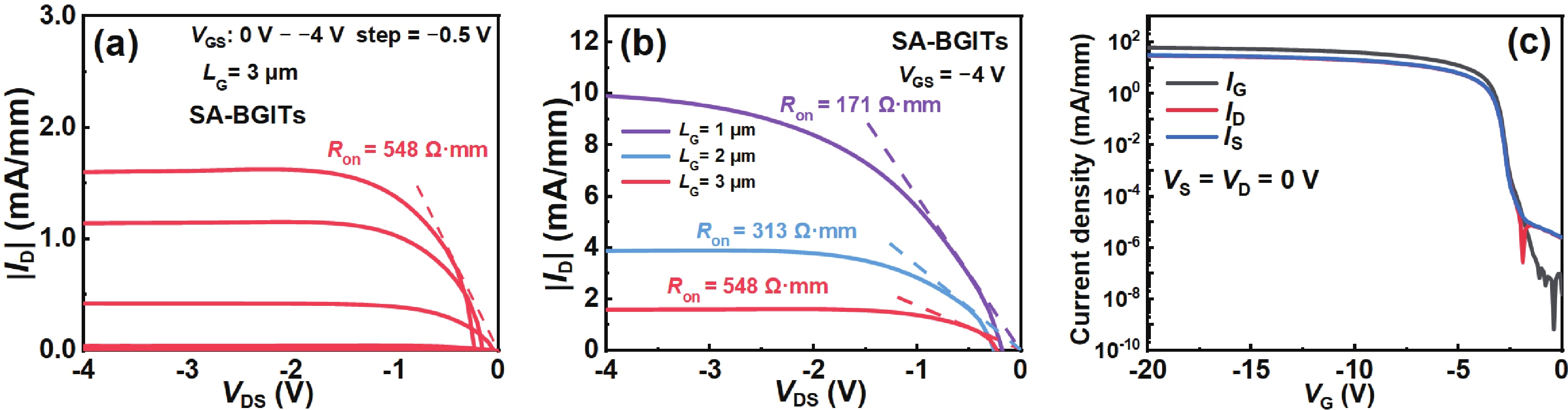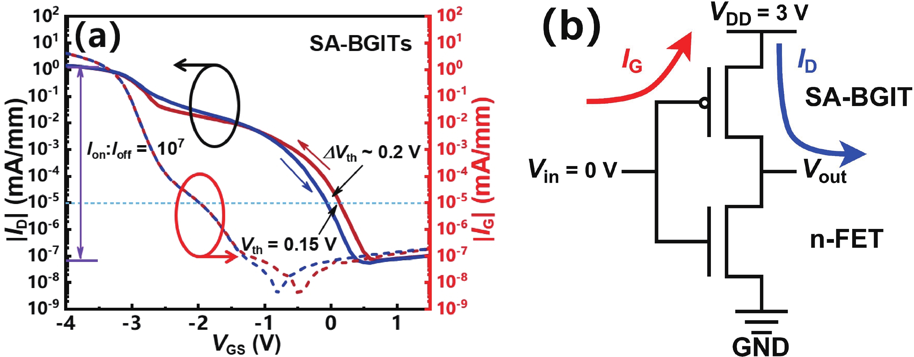 In this study, we present the development of self-aligned p-channel GaN back gate injection transistors (SA-BGITs) that exhibit a high ON-state current. This achievement is primarily attributed to the conductivity modulation effect of the 2-D electron gas (2DEG, the back gate) beneath the 2-D hole gas (2DHG) channel. SA-BGITs with a gate length of 1 μm have achieved an impressive peak drain current (ID,MAX) of 9.9 mA/mm. The fabricated SA-BGITs also possess a threshold voltage of 0.15 V, an exceptionally minimal threshold hysteresis of 0.2 V, a high switching ratio of 107, and a reduced ON-resistance (RON) of 548 Ω·mm. Additionally, the SA-BGITs exhibit a steep sub-threshold swing (SS) of 173 mV/dec, further highlighting their suitability for integration into GaN logic circuits.