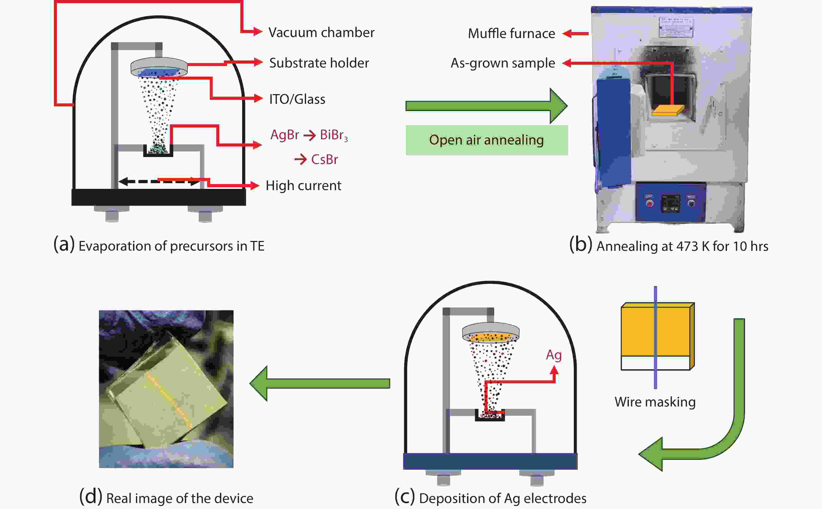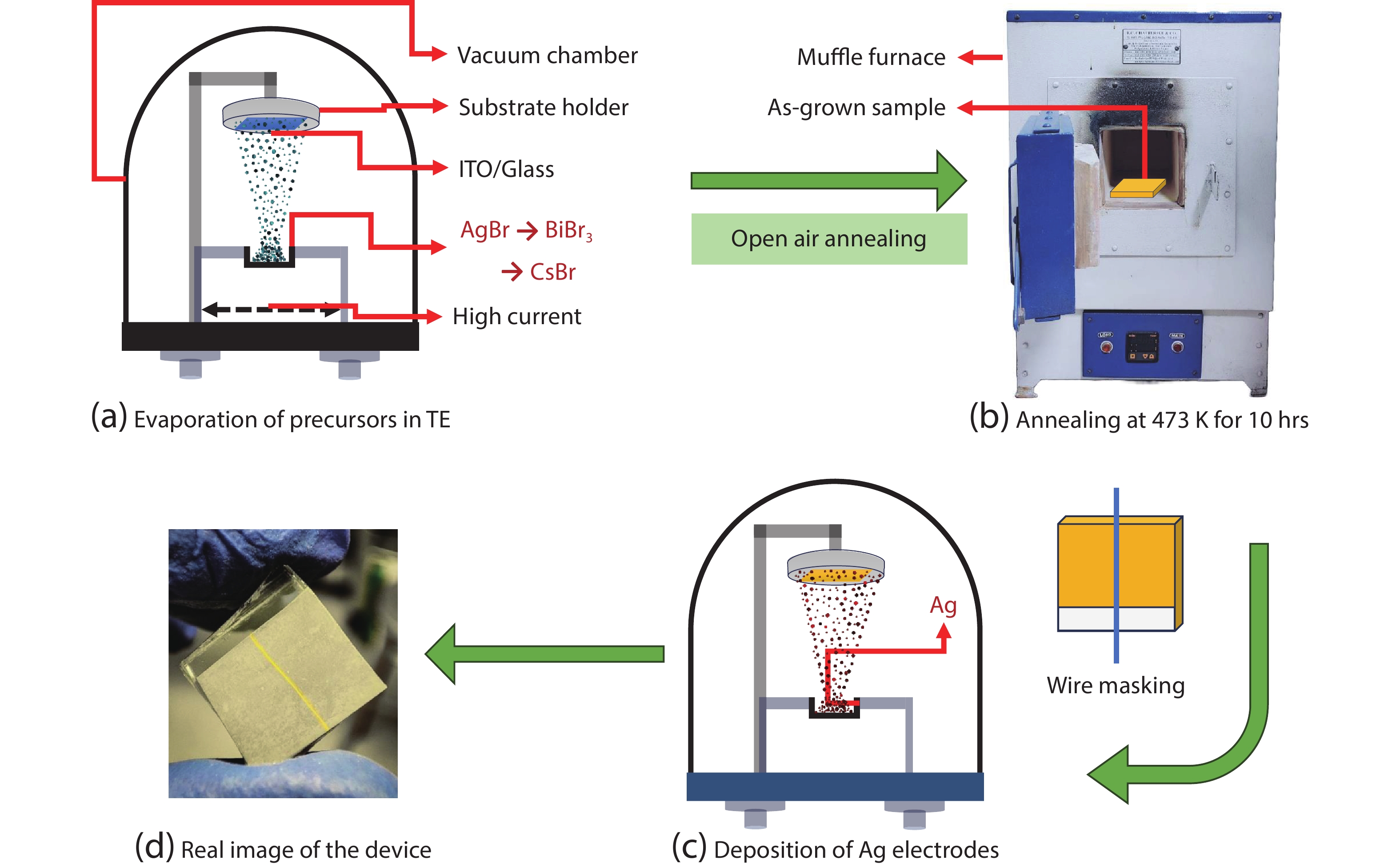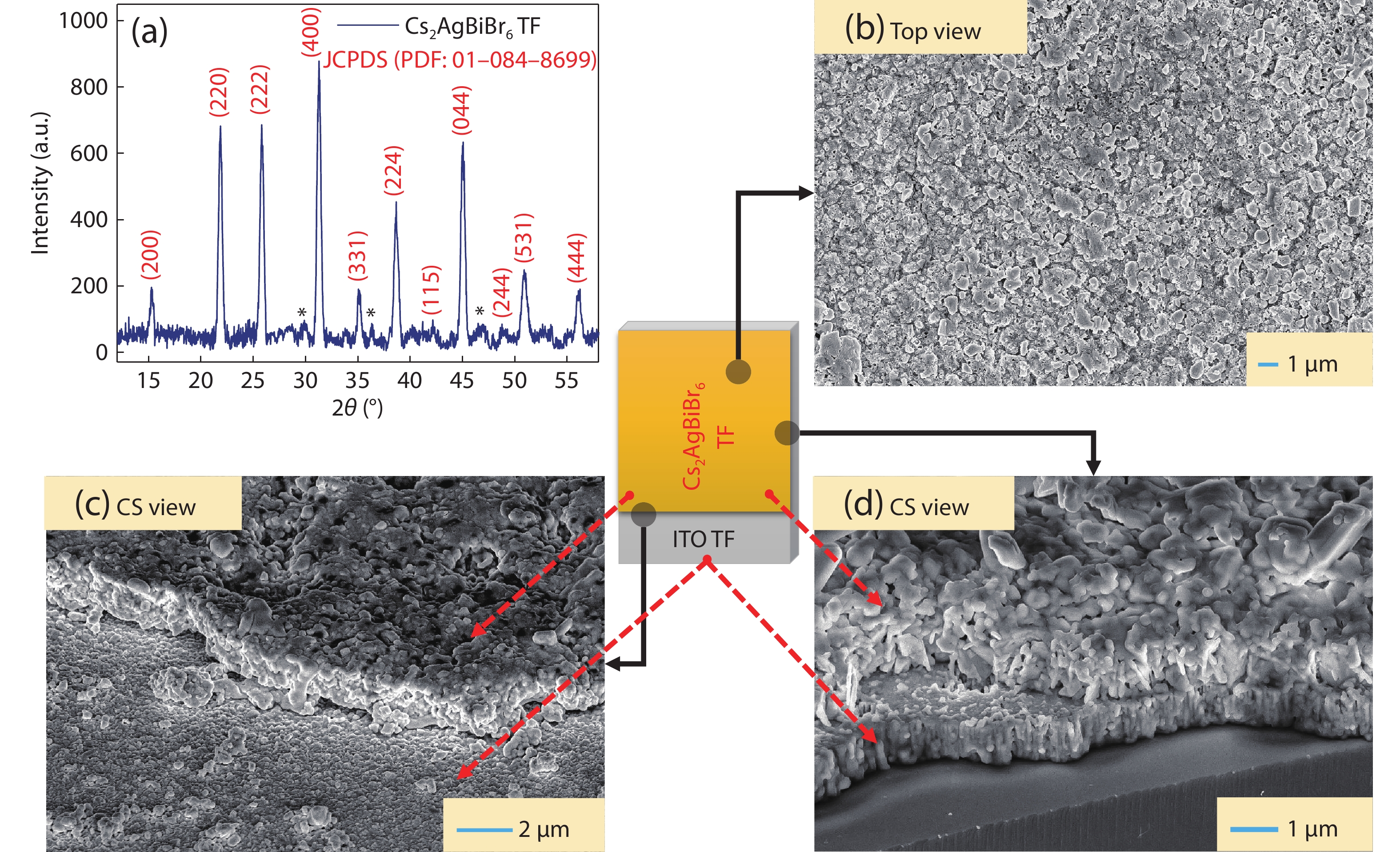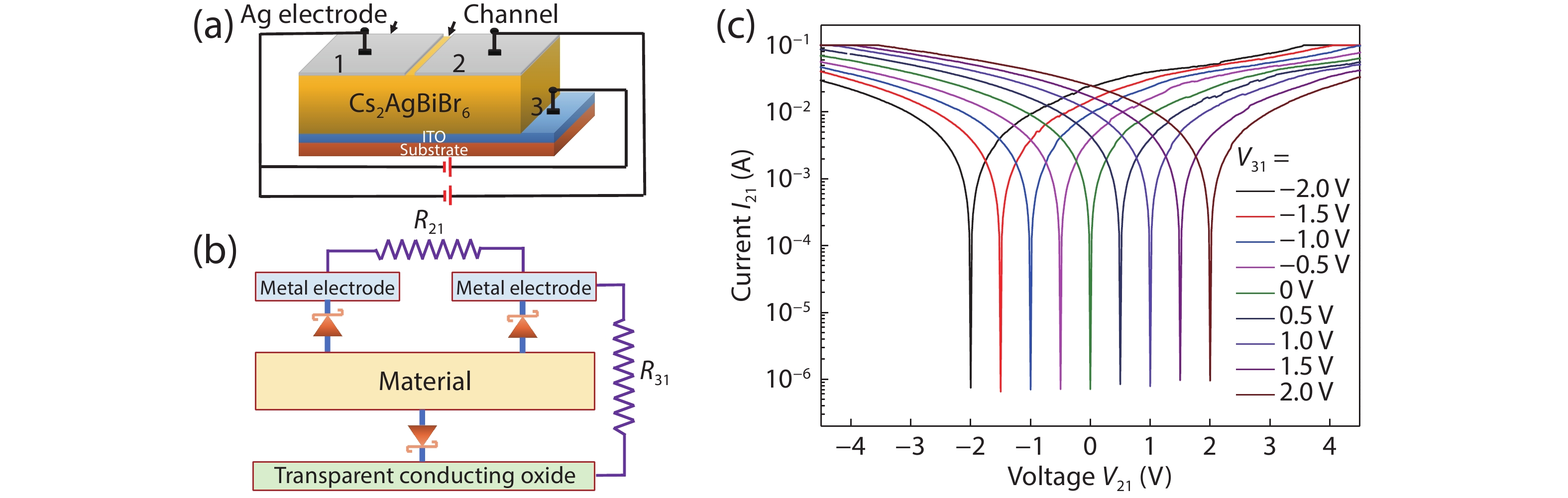 In this study, we present an in-depth exploration of charge transport phenomena and variable photo-switching characteristics in a novel double-perovskite-based three-terminal device. The Cs2AgBiBr6 thin film (TF) was synthesized through a three-step thermal evaporation process followed by precise open-air annealing, ensuring superior film quality as confirmed by structural and morphological characterizations. Photoluminescence spectroscopy revealed distinct emissions at 2.28 and 2.07 eV, indicative of both direct and indirect electronic transitions. Our device exhibited space-charge limited current (SCLC) behaviour beyond 0.35 V, aligning with the relationship $ {\text{Current}\left(I\right)\propto\text{Voltage\ }\left(V\right)^m }$, where the exponent m transitioned from ≤1 to >1. Detailed analysis of Schottky parameters within the trap-filled limit (TFL) regime was conducted, accounting for variations in temperature and optical power. Significantly, the self-powered photodetector demonstrated outstanding performance under illumination. The sensitivity of the device was finely tunable via the applied bias voltages at the third terminal. Notably, an optimal bias voltage of ±100 μV yielded maximum responsivity (R) of 0.48 A/W and an impressive detectivity (D*) of 1.07 × 109 Jones, highlighting the potential of this double-perovskite-based device for advanced optoelectronic applications.