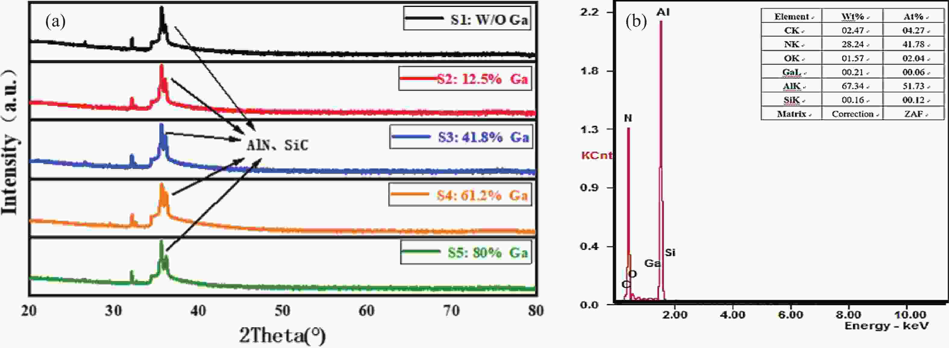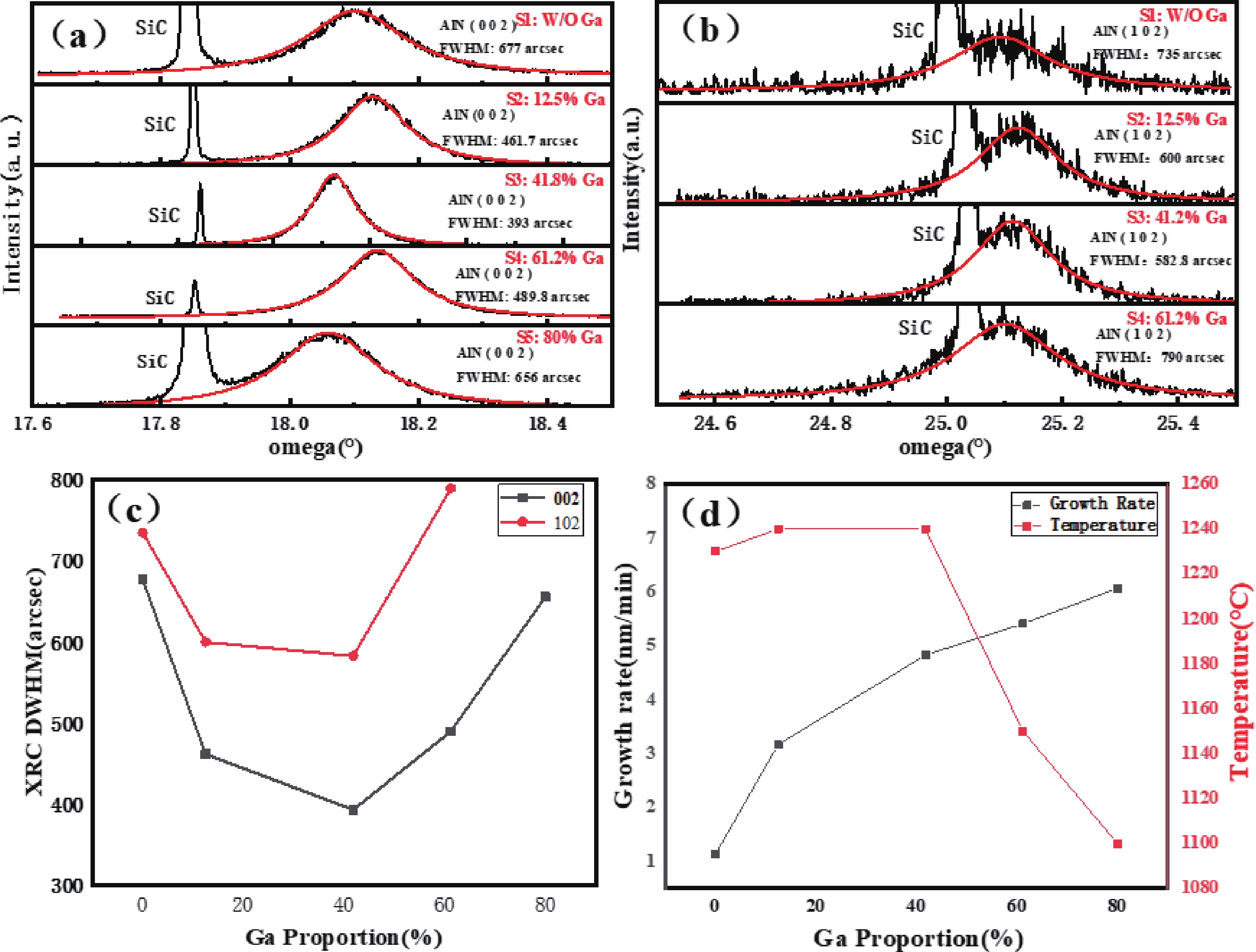In this work, AlN films were grown using gallium (Ga) as surfactant on 4° off-axis 4H-SiC substrates via microwave plasma chemical vapor deposition (MPCVD). We have found that AlN growth rate can be greatly improved due to the catalytic effect of trimethyl-gallium (TMGa), but AlN crystal structure and composition are not affected. When the proportion of TMGa in gas phase was low, crystal quality of AlN can be improved and three-dimensional growth mode of AlN was enhanced with the increase of Ga source. When the proportion of TMGa in gas phase was high, two-dimensional growth mode of AlN was presented, with the increase of Ga source results in the deterioration of AlN crystal quality. Finally, employing a two-step growth approach, involving the initial growth of Ga-free AlN nucleation layer followed by Ga-assisted AlN growth, high quality of AlN film with flat surface was obtained and the full width at half maximum (FWHM) values of 415 nm AlN (002) and (102) planes were 465 and 597 arcsec.