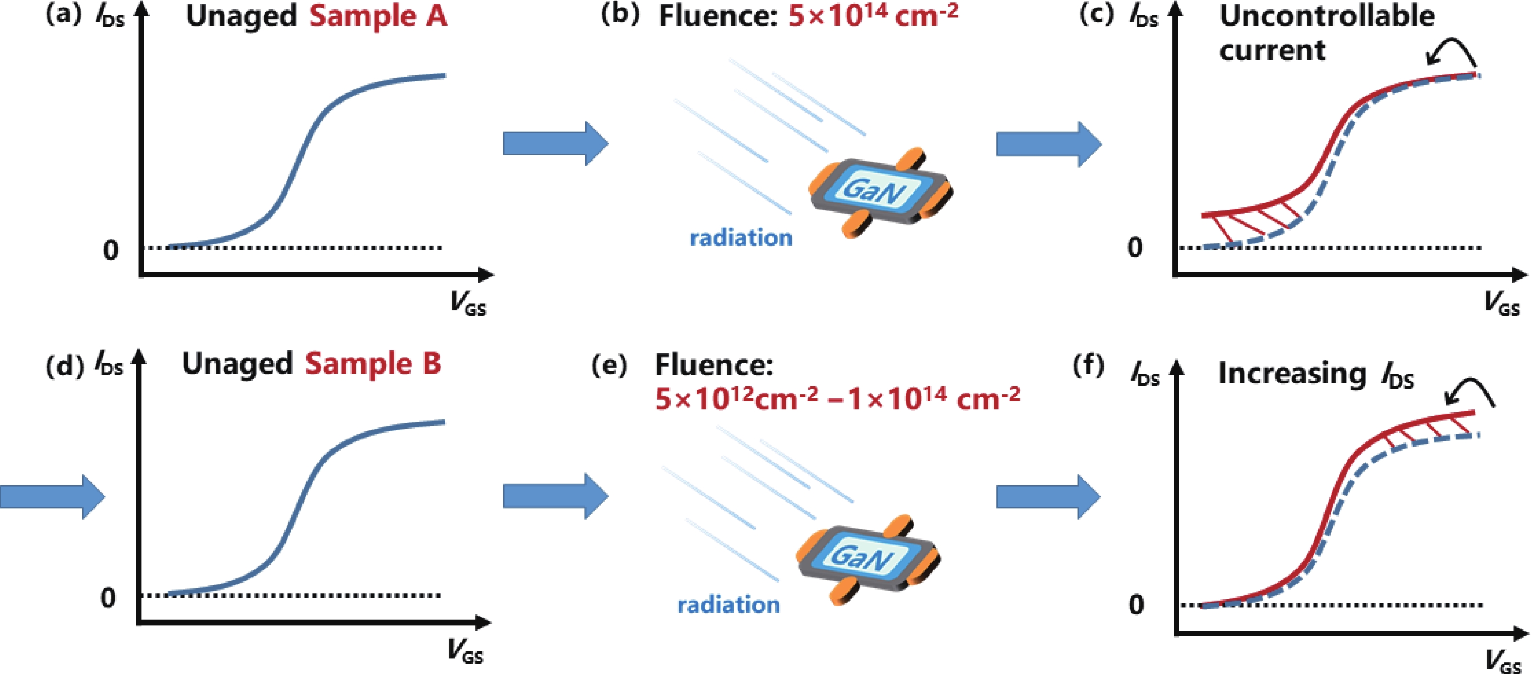 In this study, the effects of 1 MeV electron radiation on the D-mode GaN-based high electron mobility transistors (HEMTs) were investigated after different radiation doses. The changes in electrical properties of the device were obtained, and the related physical mechanisms were analyzed. It indicated that under the radiation dose of 5 × 1014 cm?2, the channel current cannot be completely pinched off even if the negative gate voltage was lower than the threshold voltage, and the gate leakage current increased significantly. The emission microscopy and scanning electron microscopy were used to determine the damage location. Besides, the radiation dose was adjusted ranging from 5 × 1012 to 1 × 1014 cm?2, and we noticed that the drain?source current increased and the threshold voltage presented slightly negative shift. By calculations, it suggested that the carrier density and electron mobility gradually increased. It provided a reference for the development of device radiation reinforcement technology.