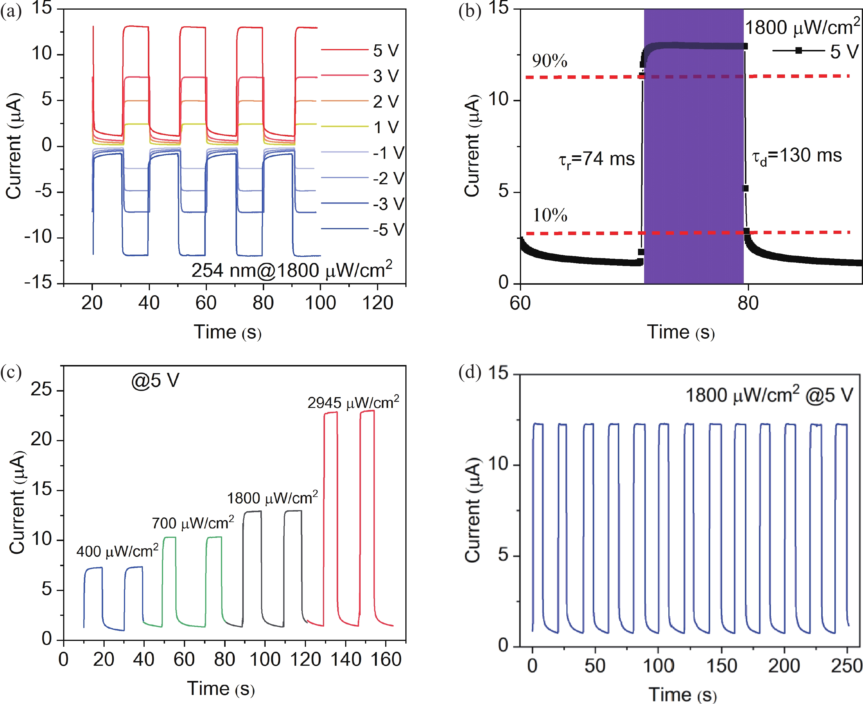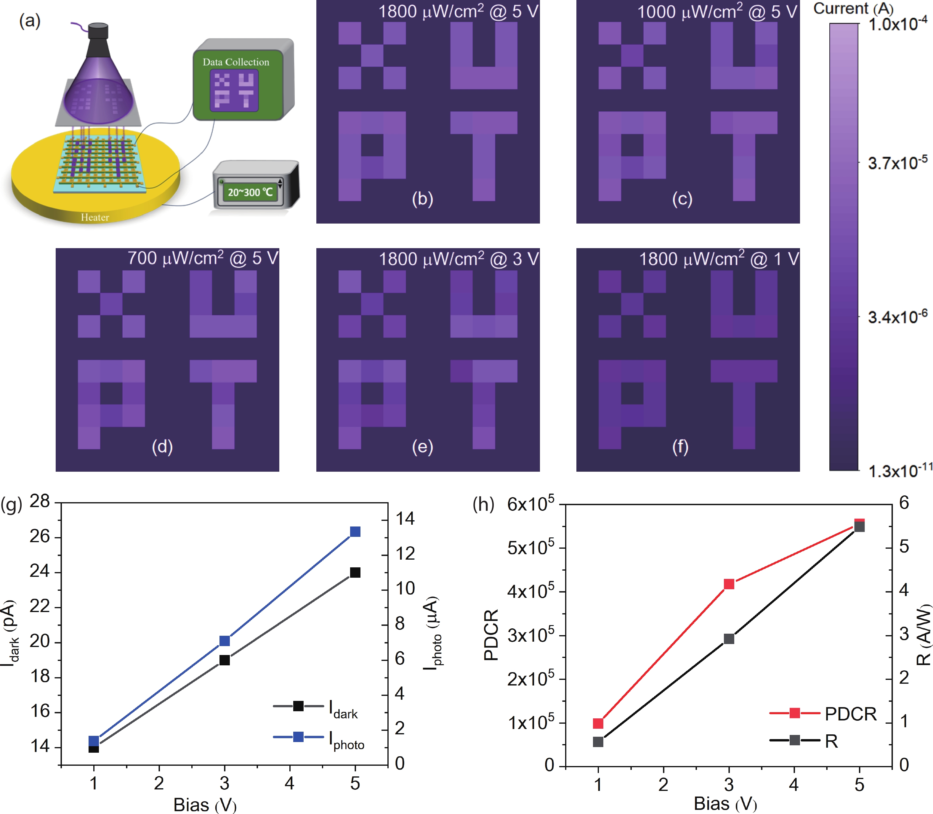 A 10 × 10 solar-blind ultraviolet (UV) imaging array with double-layer wire structure was prepared based on Ga2O3 film grown by atomic layer deposition. These single detection units in the array exhibit excellent performance at 3 V: photo-to-dark current ratio (PDCR) of 5.5 × 105, responsivity (R) of 4.28 A/W, external quantum efficiency (EQE) of 2.1 × 103%, detectivity (D*) of 1.5 × 1014 Jones, and fast response time. The photodetector array shows high uniformity under different light intensity and low operating bias. The array also has good temperature stability. Under 300 °C, it still presents clear imaging and keeps high R of 34.4 and 6.45 A/W at 5 and 1 V, respectively. This work provides a new insight for the large-scale array of Ga2O3 solar-blind UV detectors.