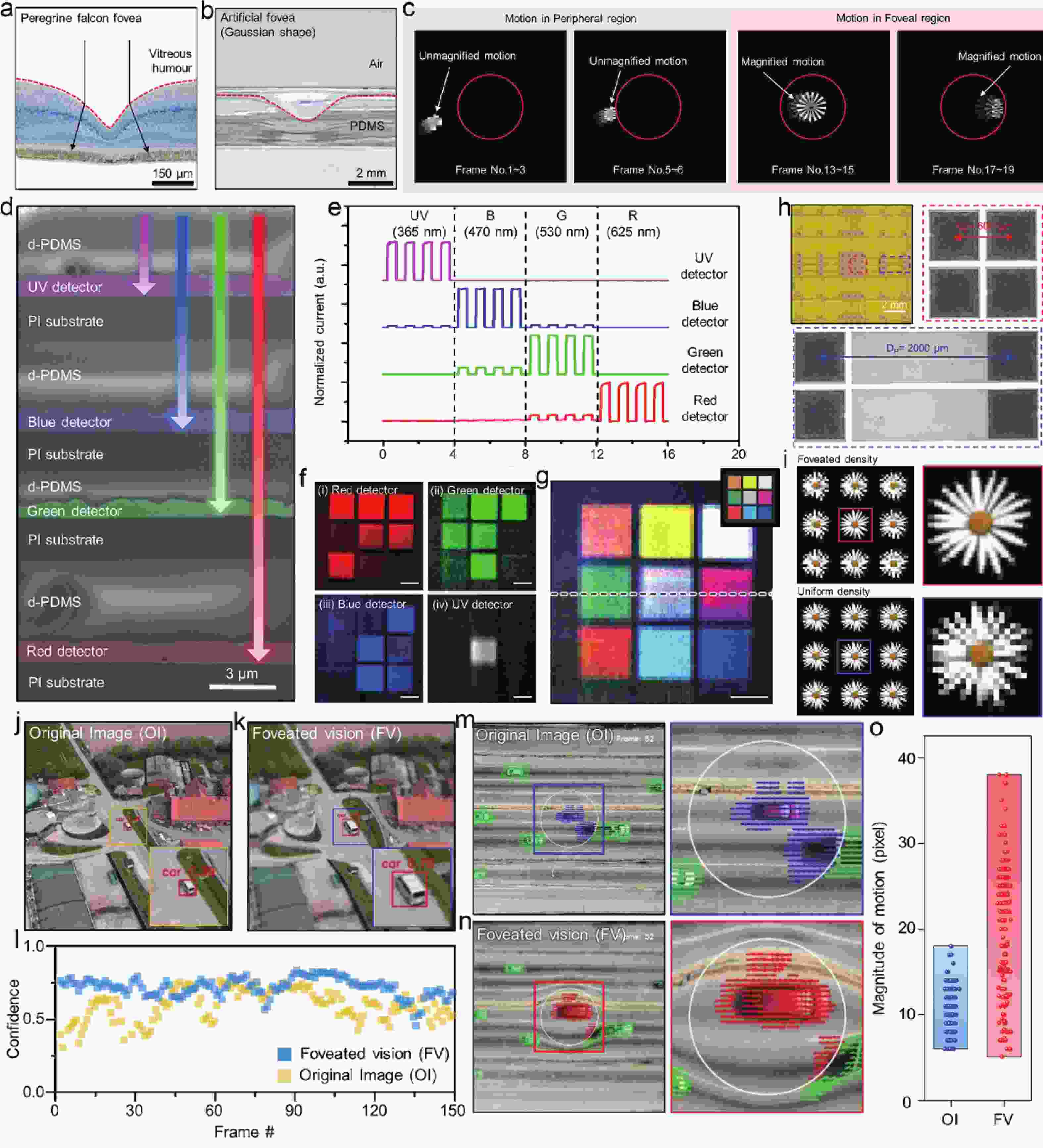 Artificial hawk-eye camera for foveated, tetrachromatic, and dynamic vision